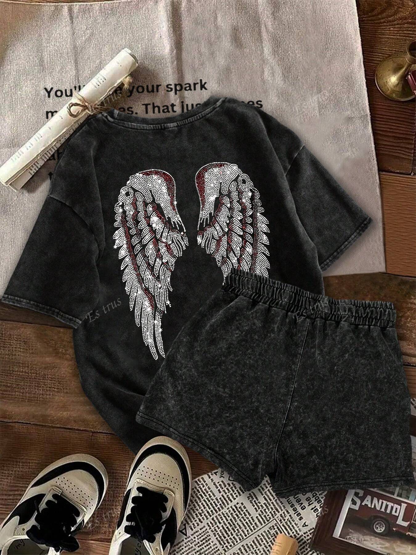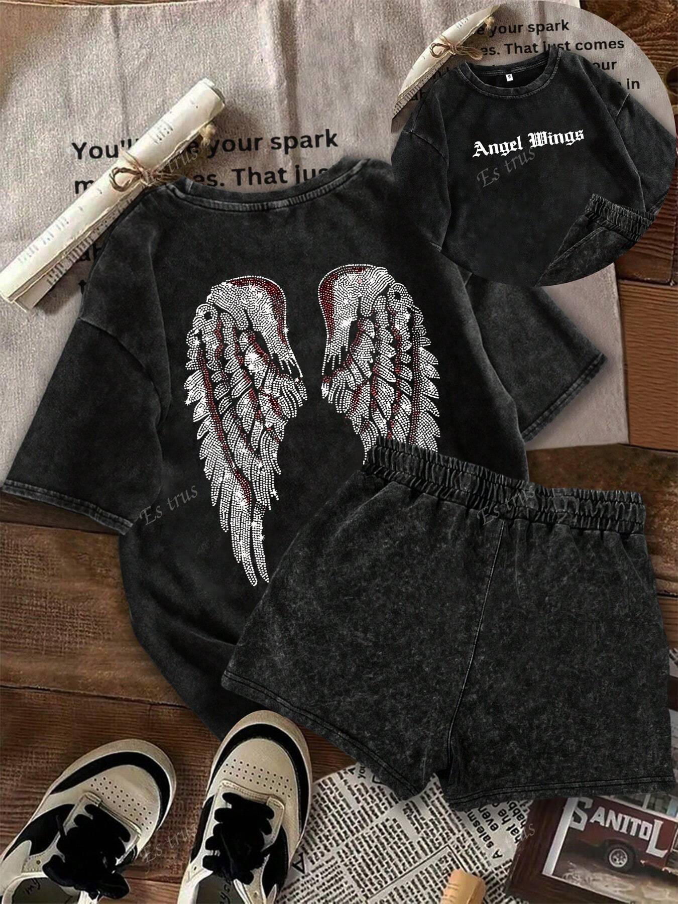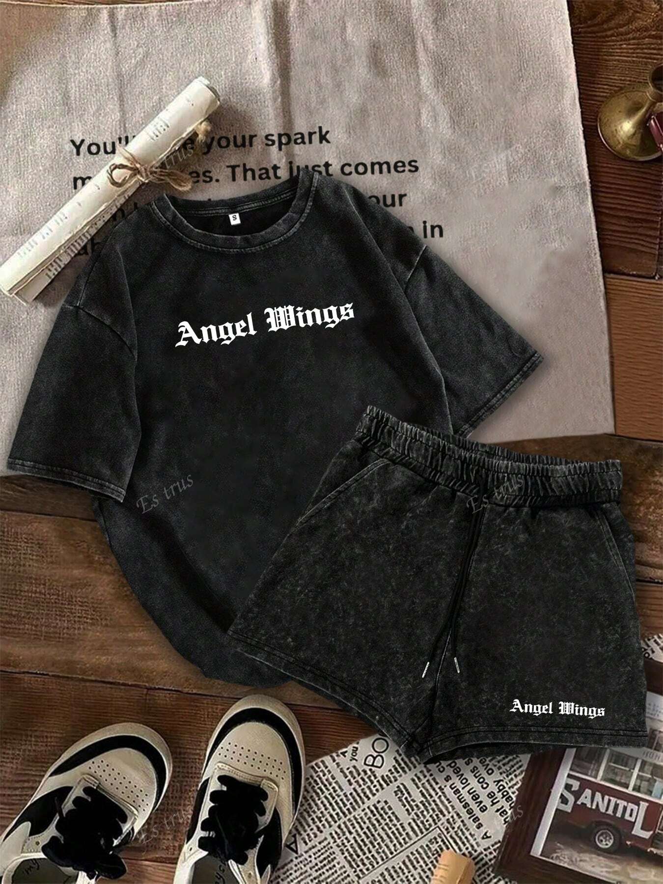 "Wing Letter" Pattern T-Shirt Shorts Summer Women's Fun T-Shirt Shorts Short Sleeved Top Printed Casual
