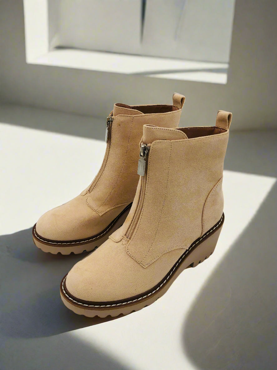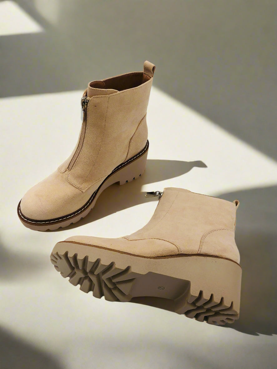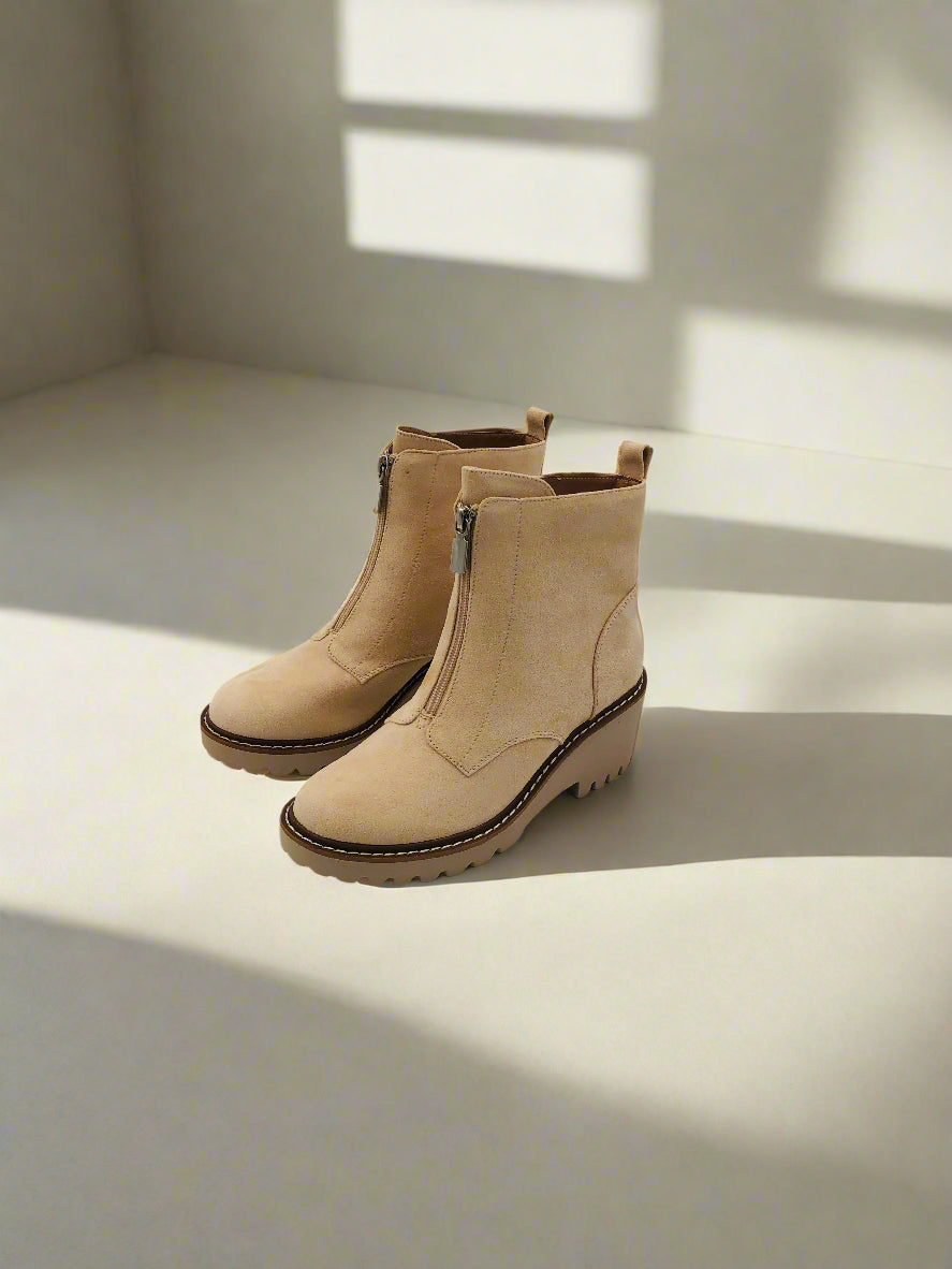جزمة كاحل بيج بكعب مرتفع ومتين يوفر ثباتاً مثالياً، مع سحاب أمامي ومقدمة مدورة. مثالية لفصلي الشتاء والخريف.