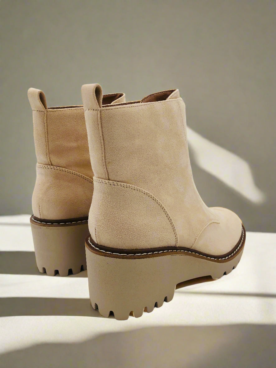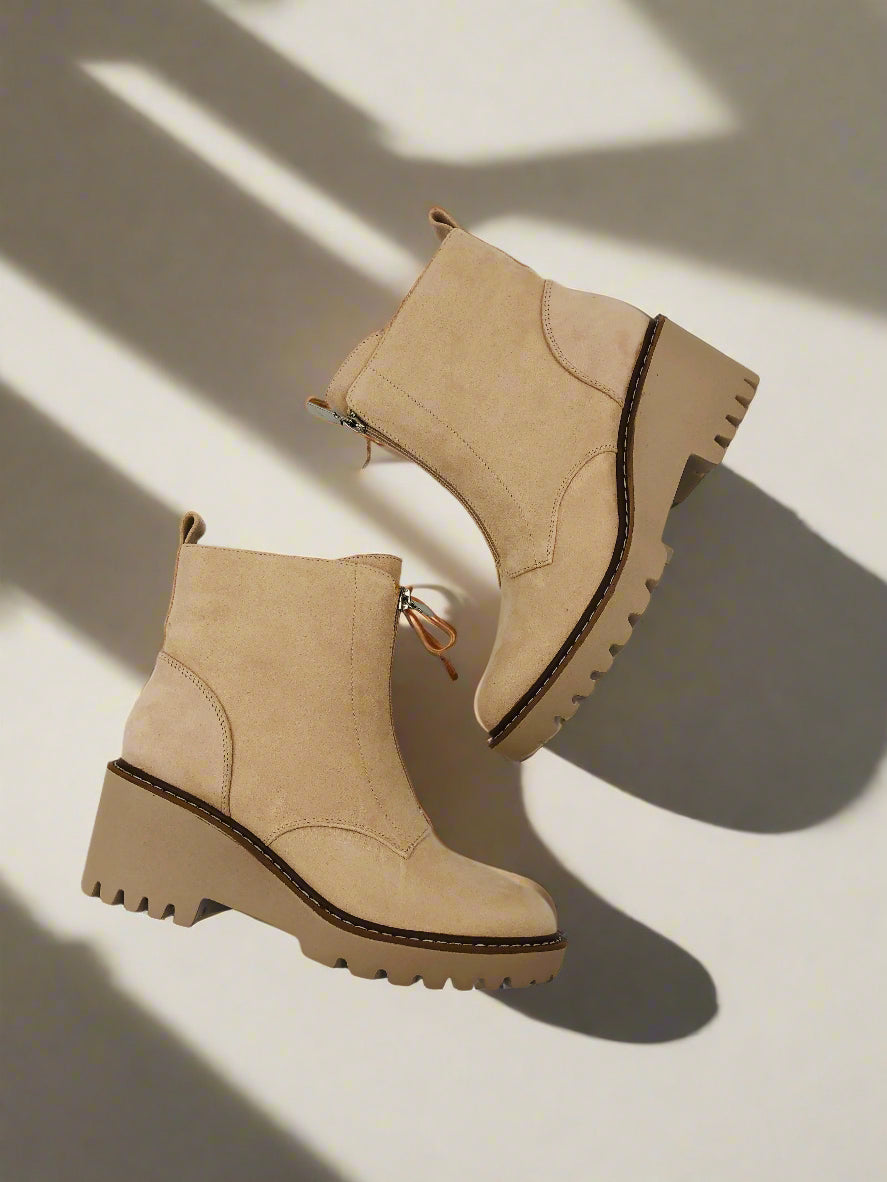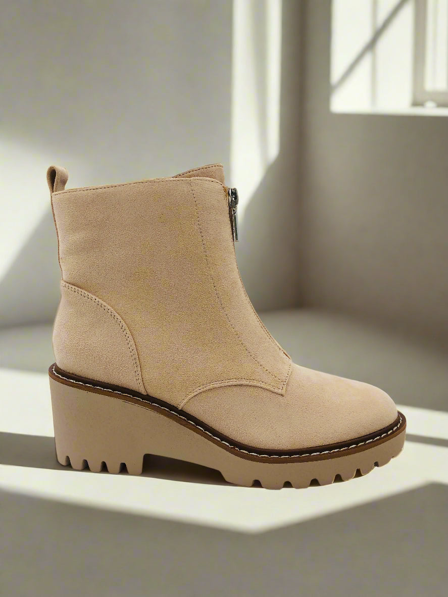 جزمة كاحل بيج بكعب مرتفع ومتين يوفر ثباتاً مثالياً، مع سحاب أمامي ومقدمة مدورة. مثالية لفصلي الشتاء والخريف.