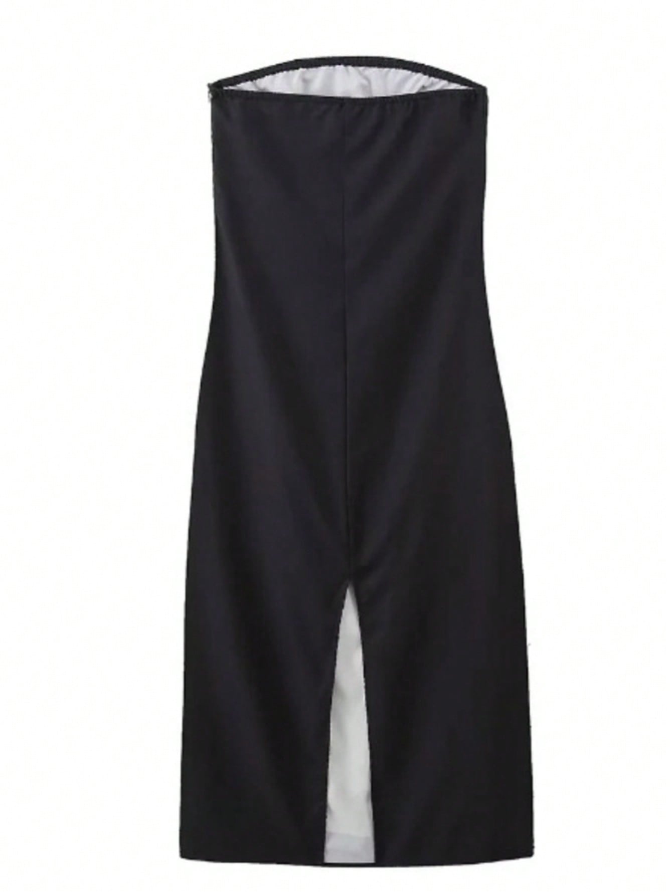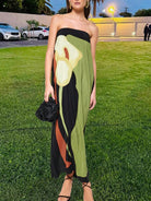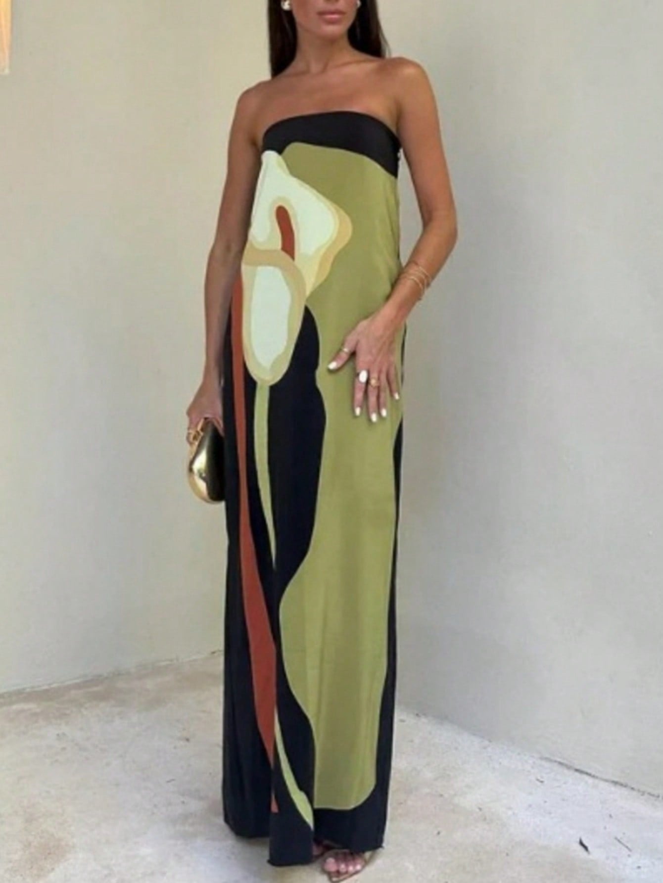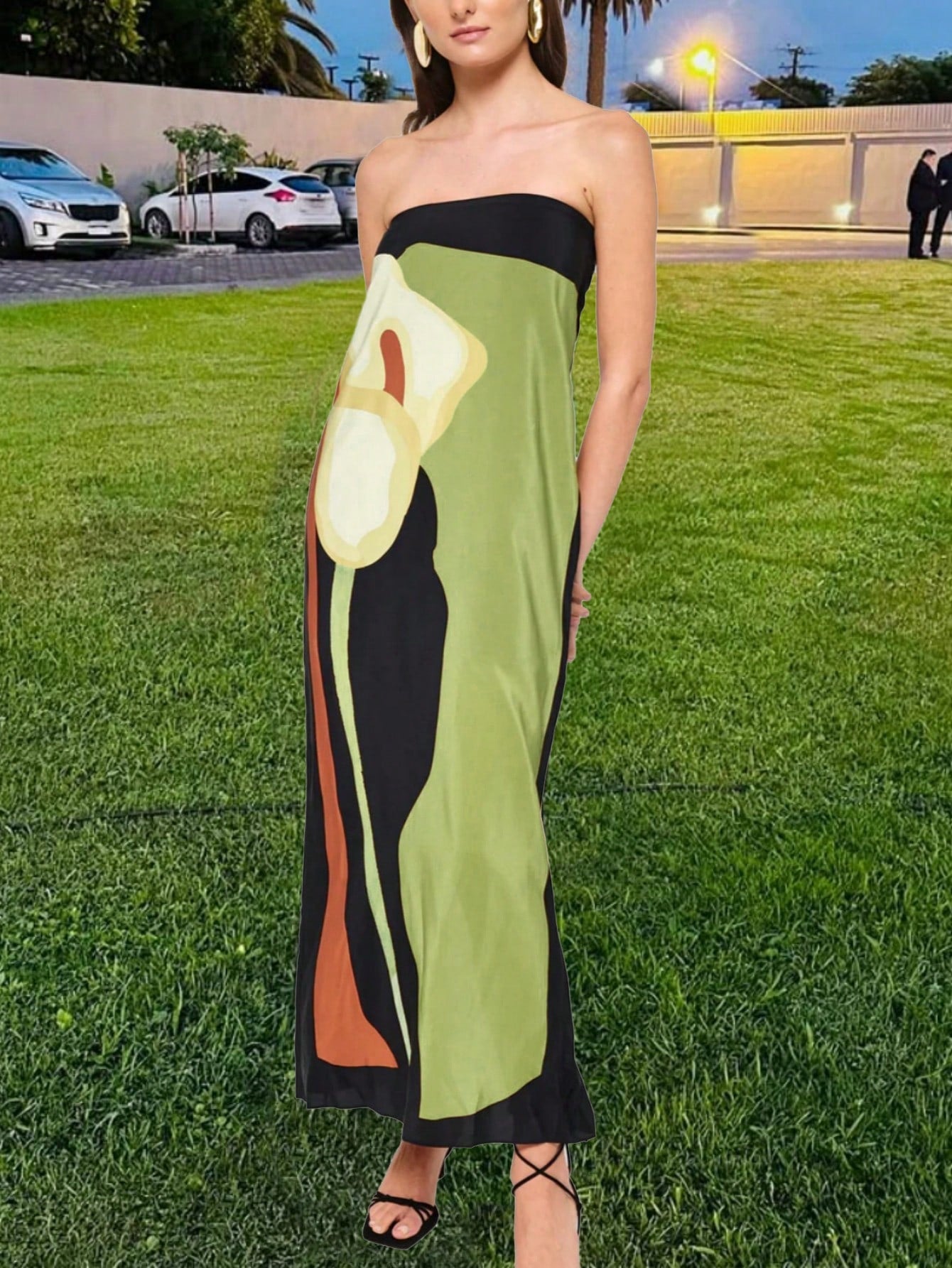 فستان طويل أنيق بدون حمالات مطبوع باللون الأخضر للنساء، مناسب للعطلات