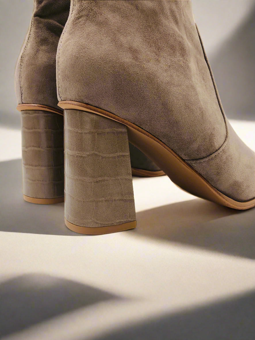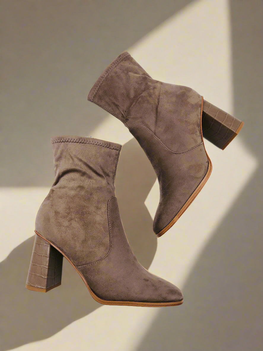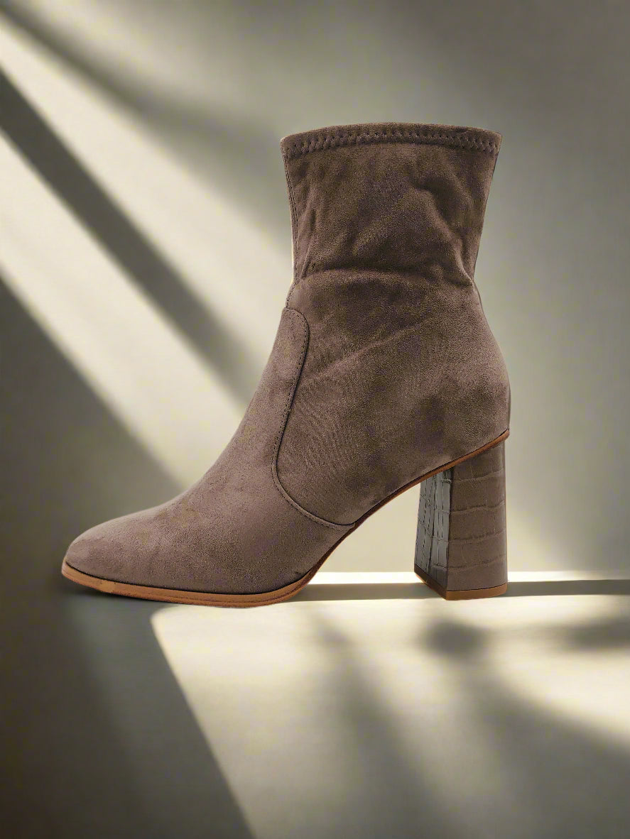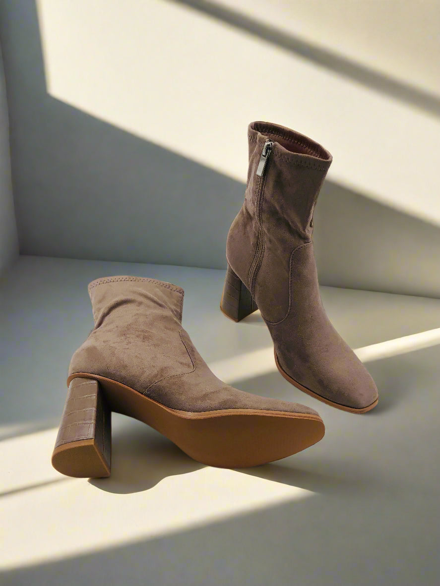 جزمة كاحل نسائية بتصميم جوارب باللون الرمادي البني مع كعب عريض وسحاب جانبي، مثالية لخزانة ملابسك في الموسم الجديد.