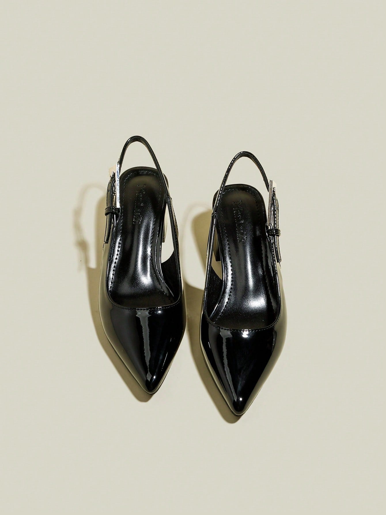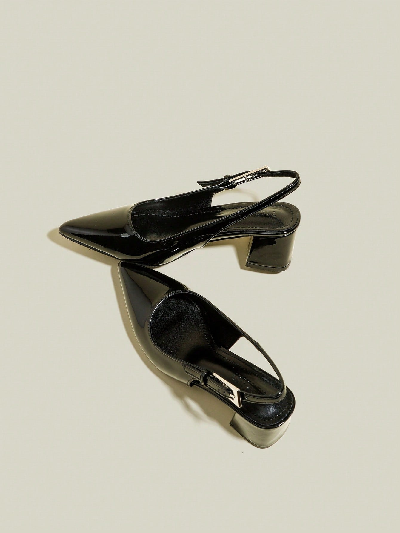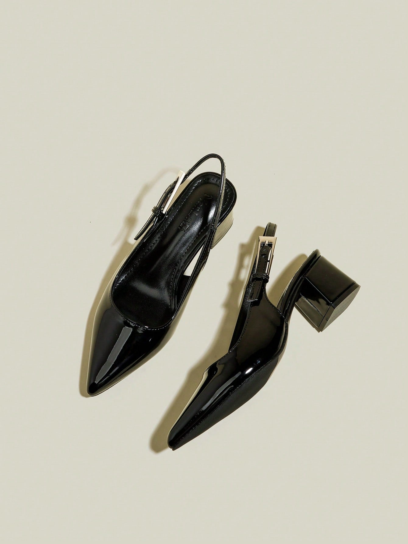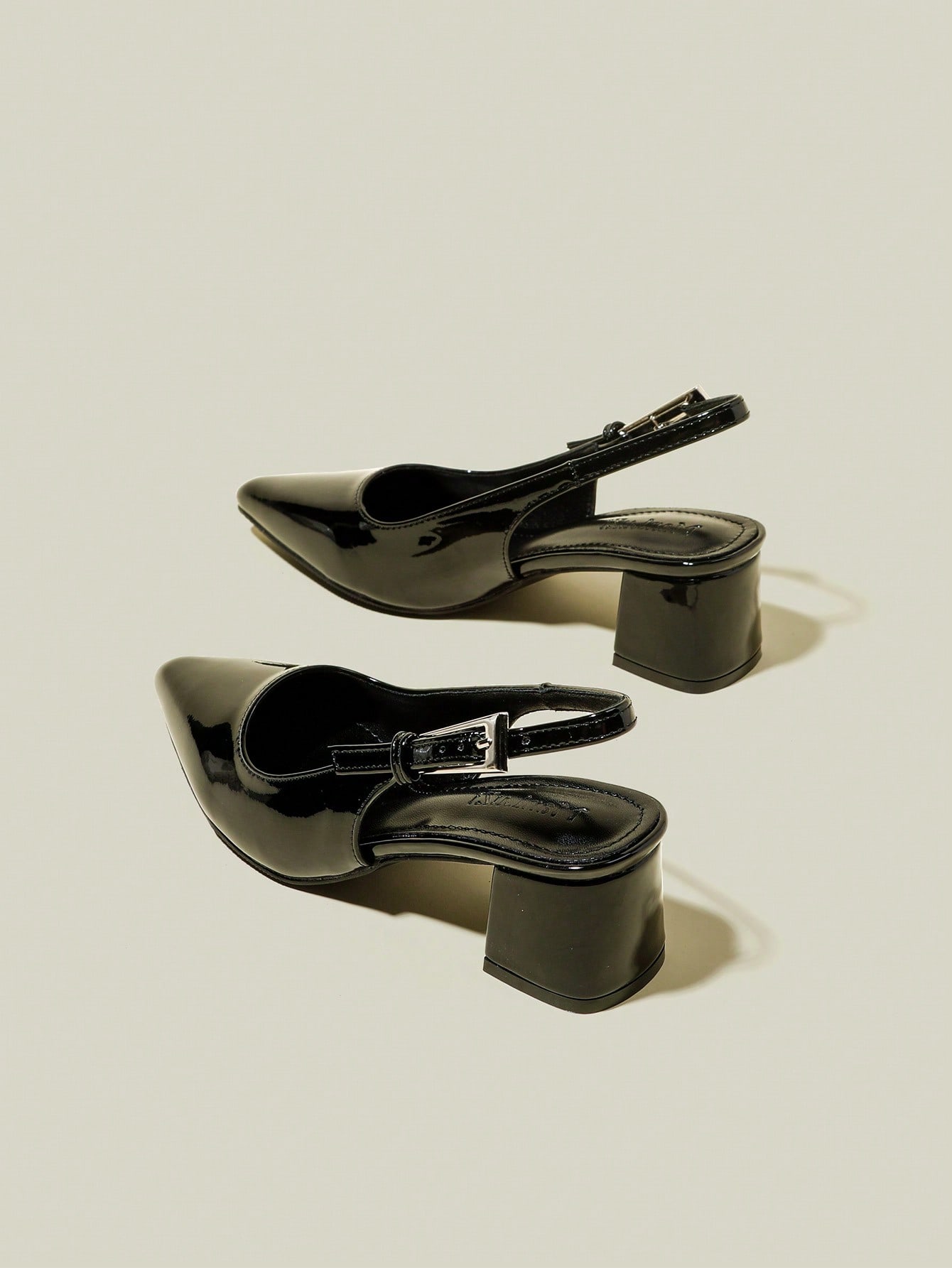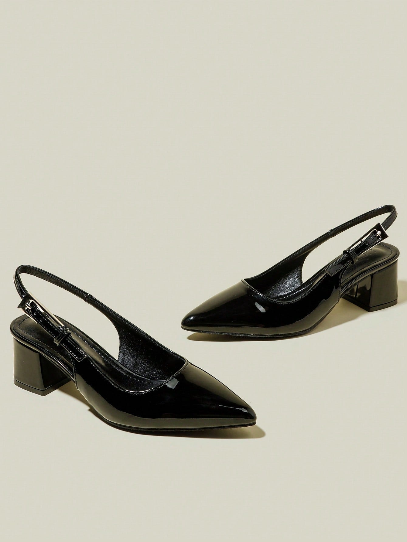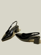 حذاء نسائي أسود لامع بكعب سميك ومقدمة مدببة وحزام للأصابع
