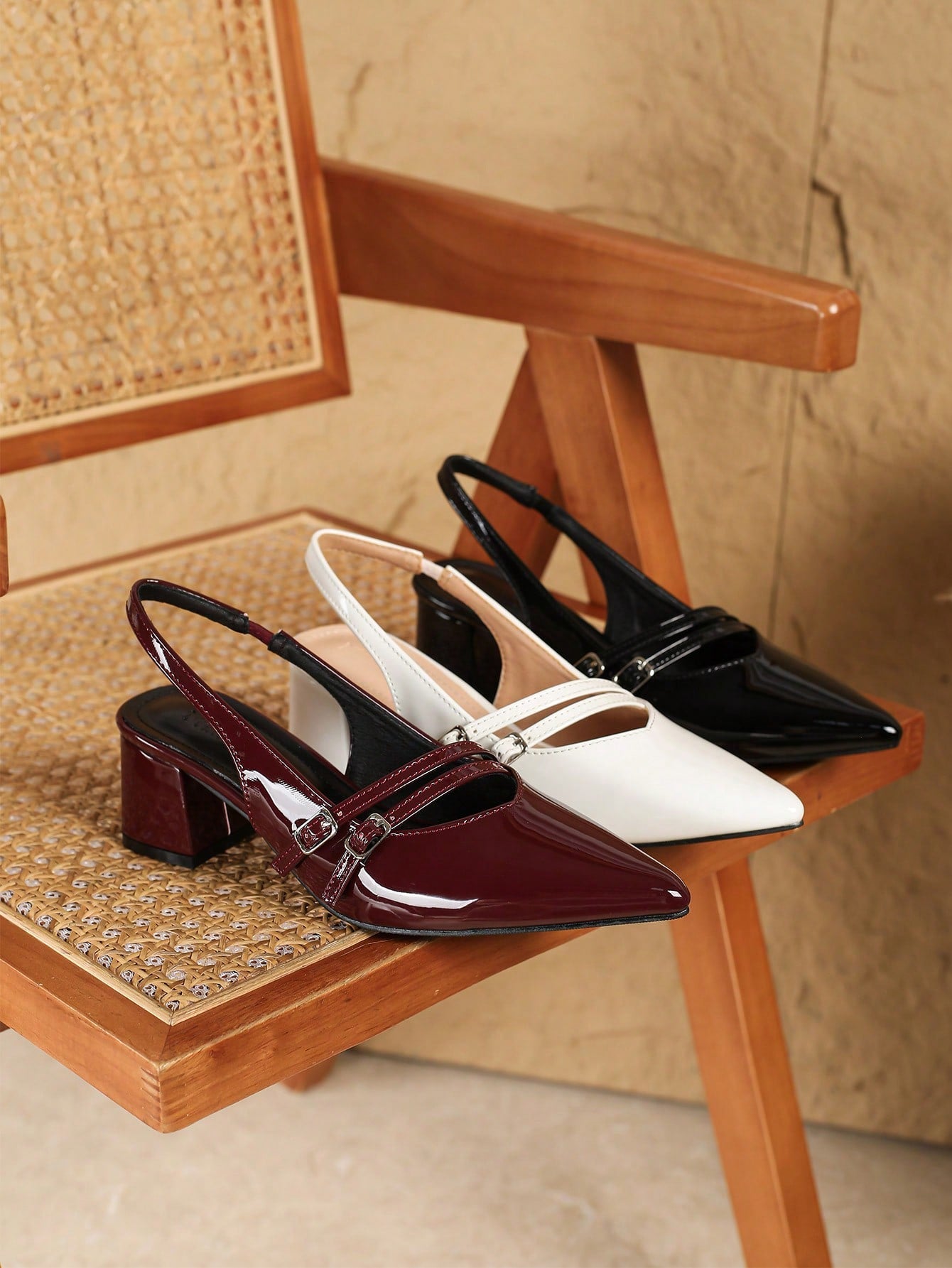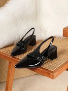 حذاء نسائي أسود بكعب عالٍ مدبب من الجلد اللامع، مزود بحزام مزدوج
