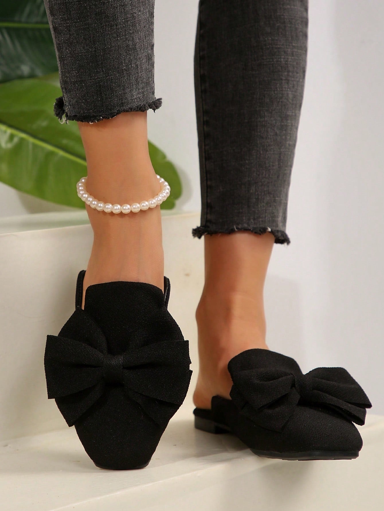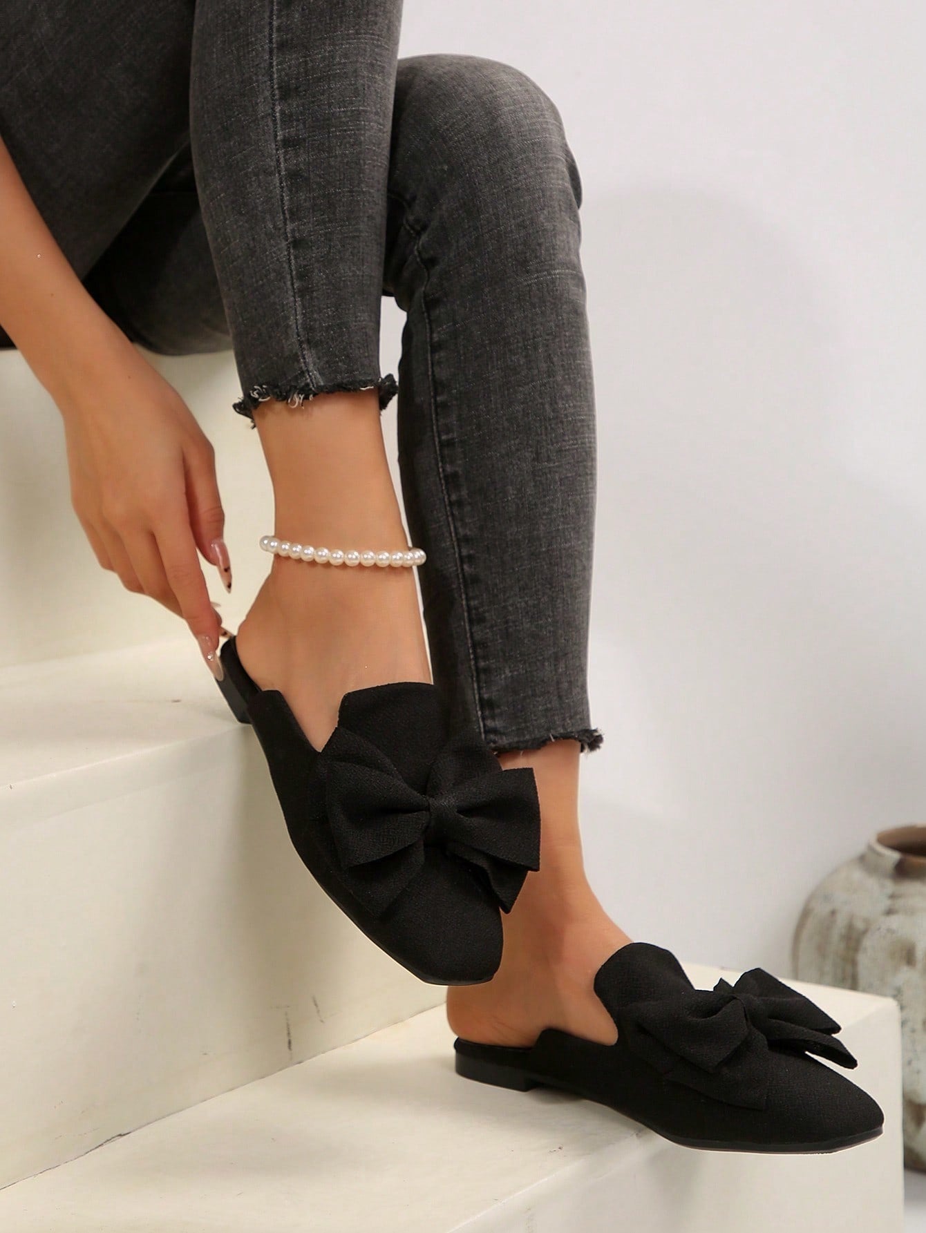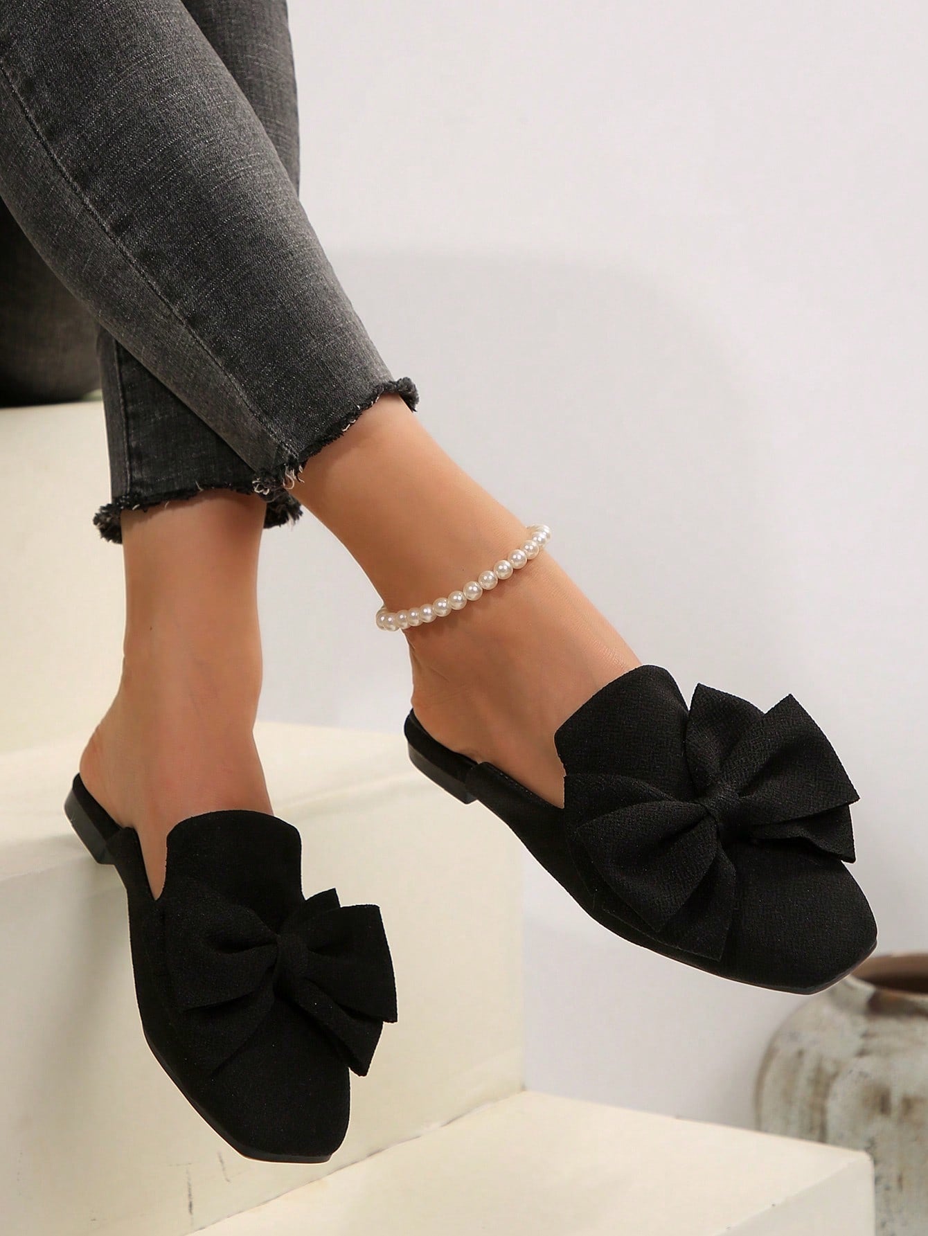 Women's Bow-Decor Square Toe Slip-On Mules, Comfort Casual Loafer Shoes, Korean Fashion Flat Black Backless