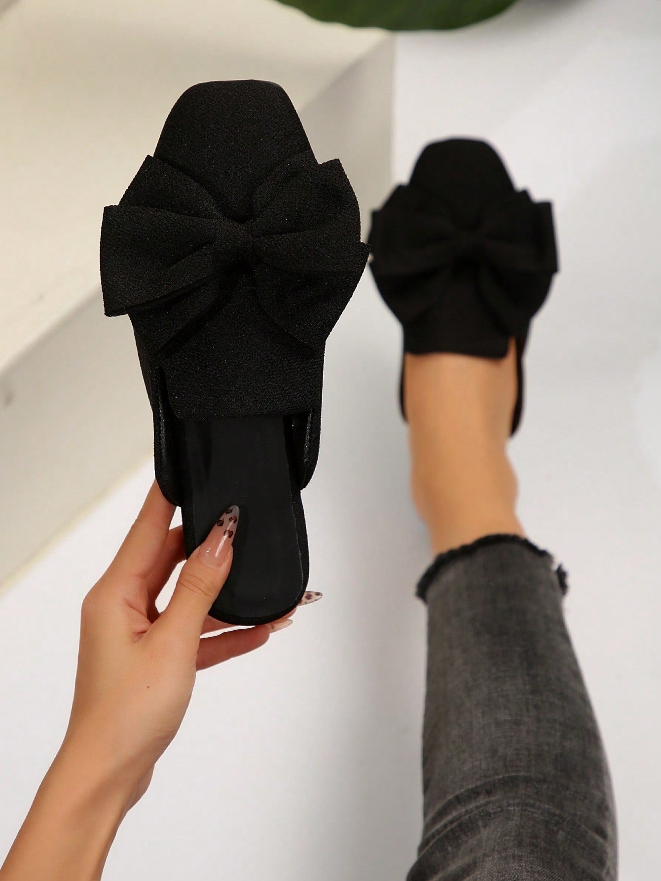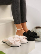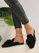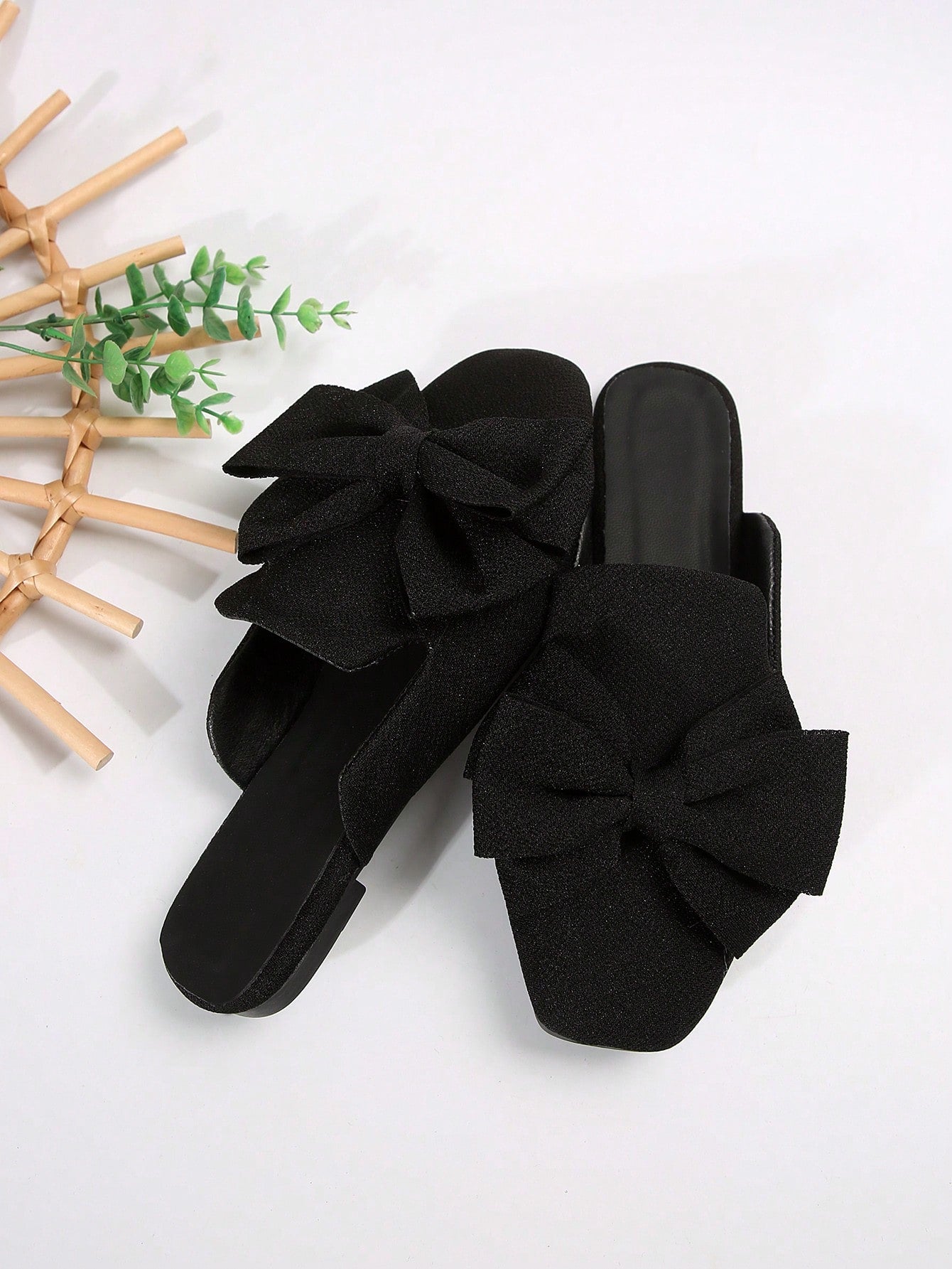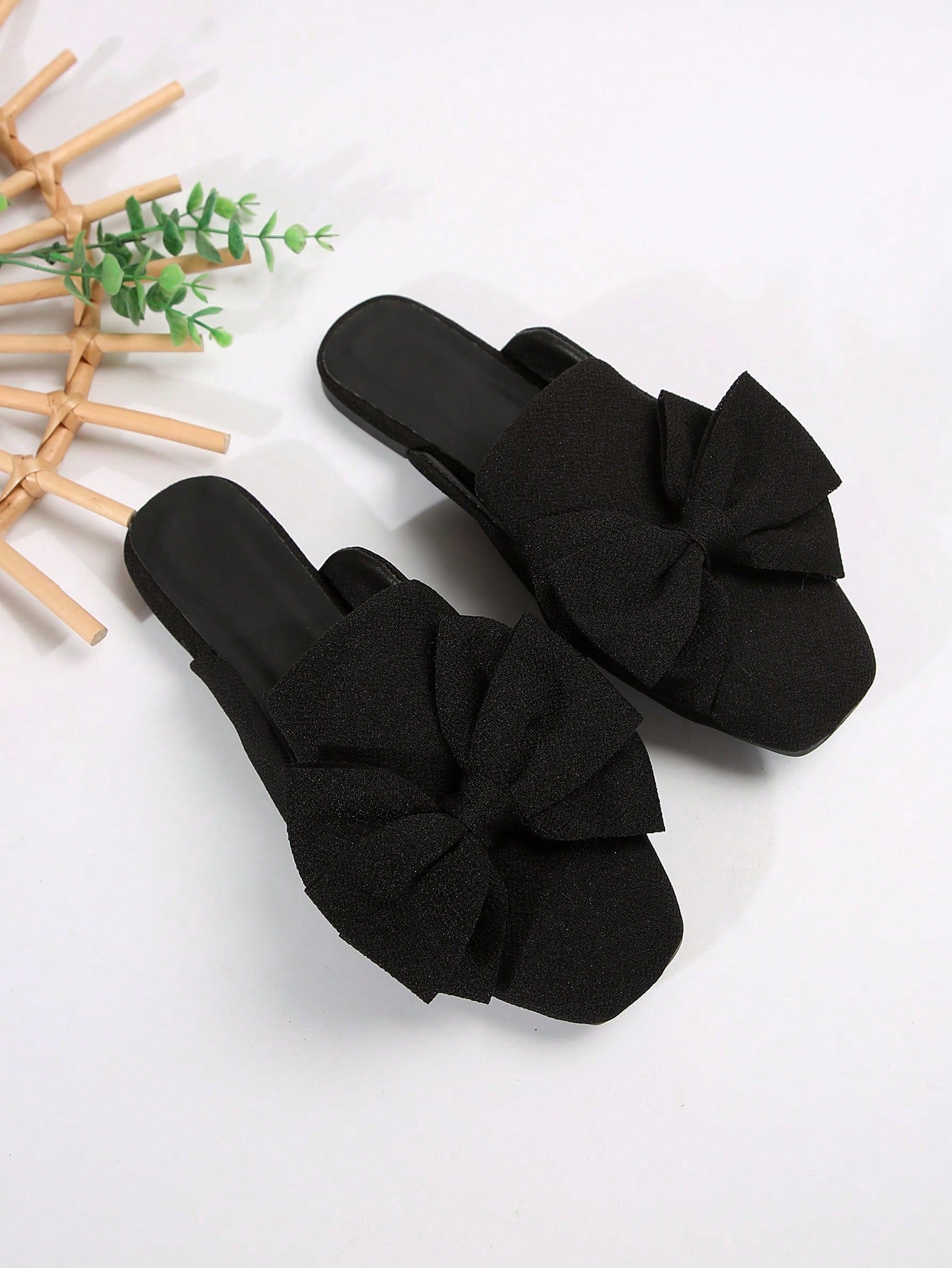 Women's Bow-Decor Square Toe Slip-On Mules, Comfort Casual Loafer Shoes, Korean Fashion Flat Black Backless