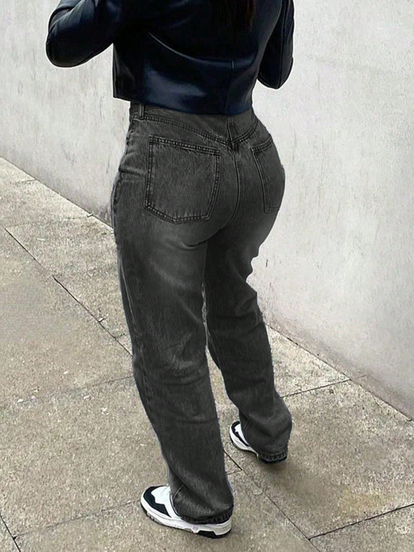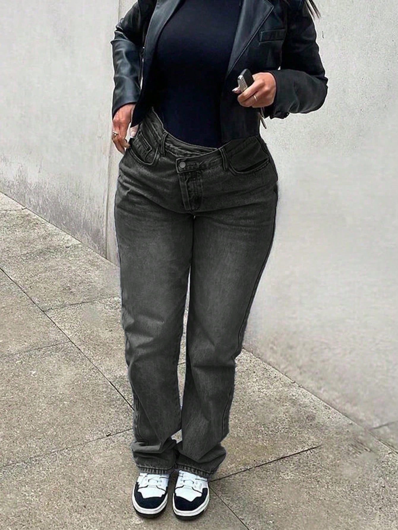 بنطلون جينز نسائي كاجوال بخصر غير متماثل وساق مدببة ومغسول