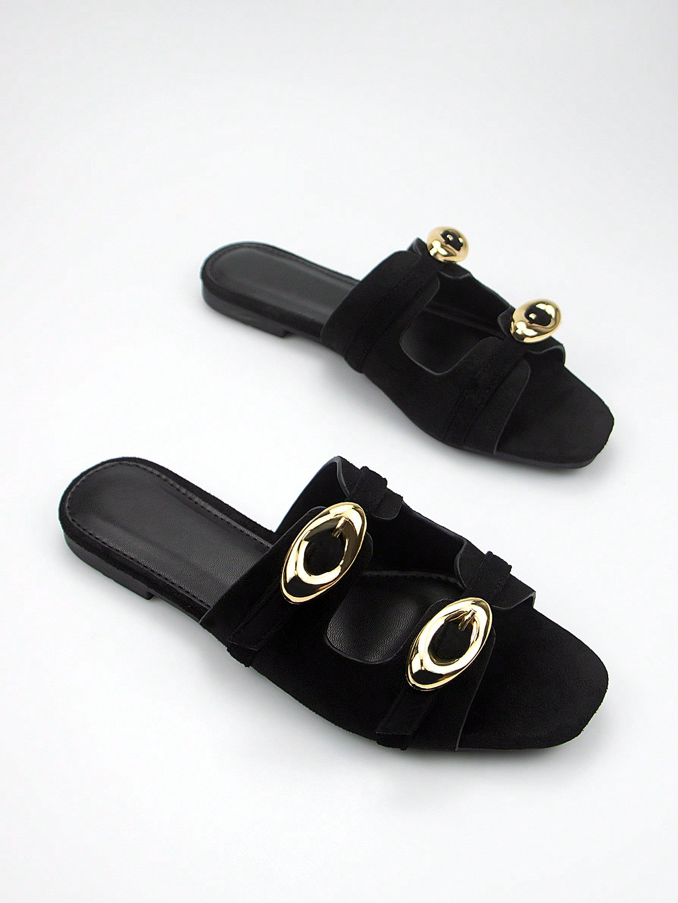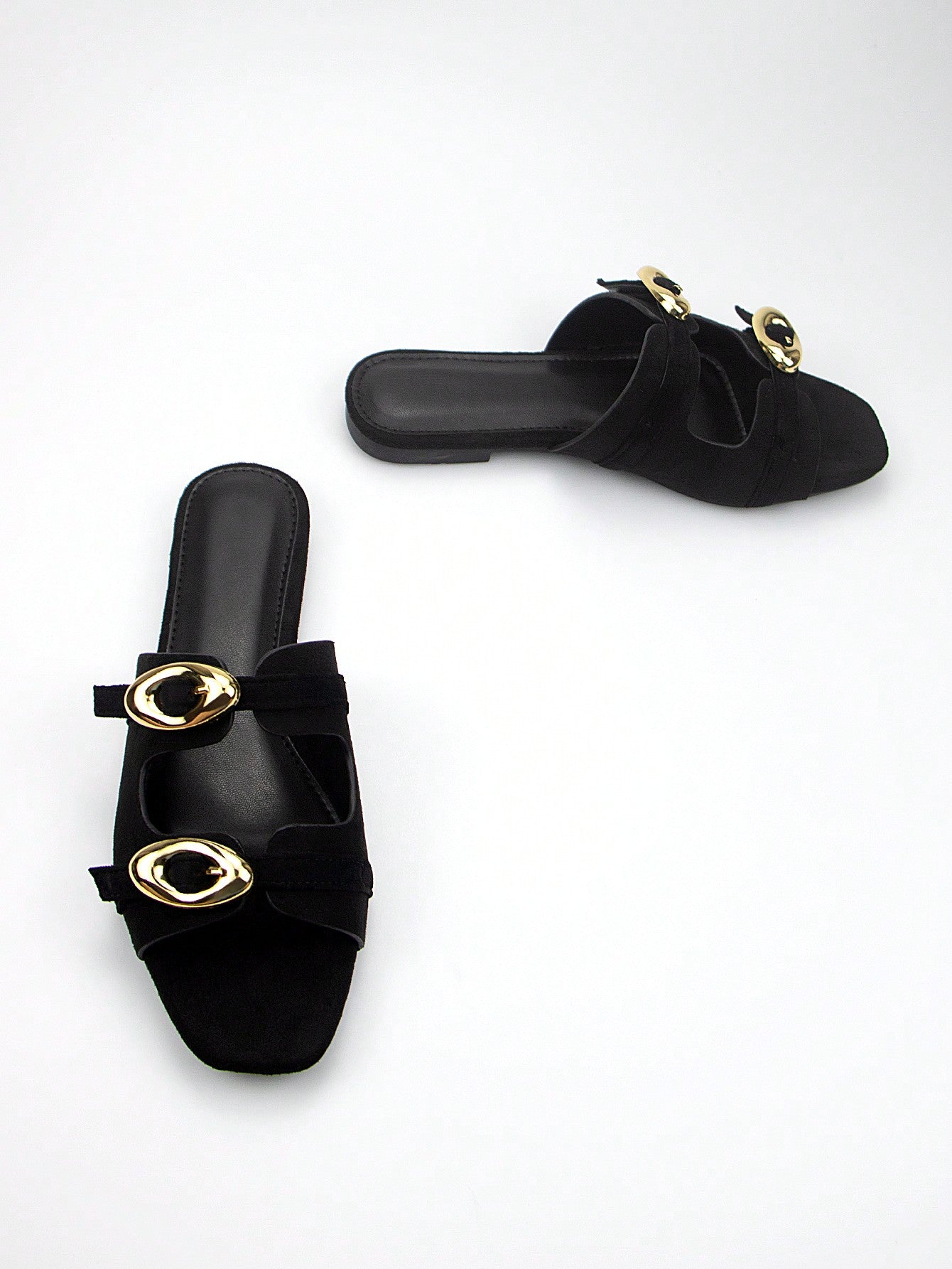 أحذية نسائية سوداء من جلد الغزال، مسطحة من الأمام ومربعة الشكل، مزودة بحزام قابل للتعديل وإبزيم ذهبي اللون.