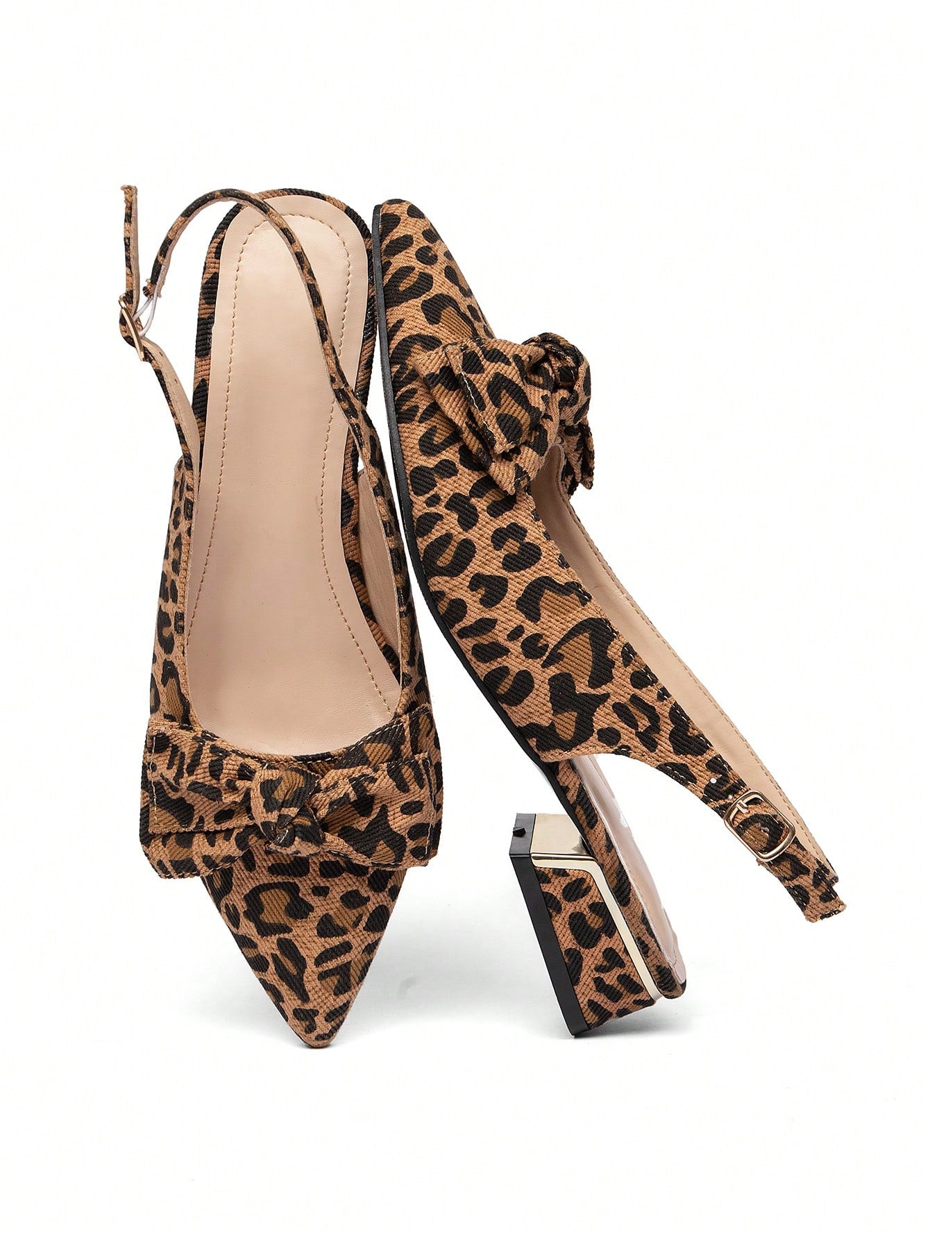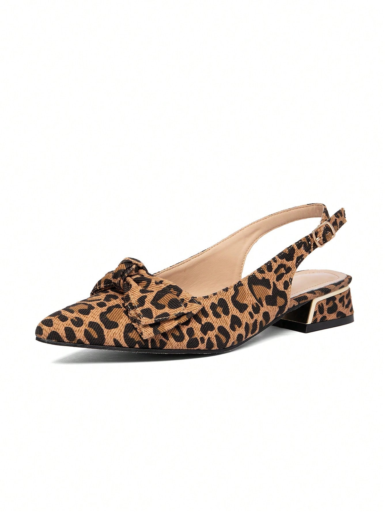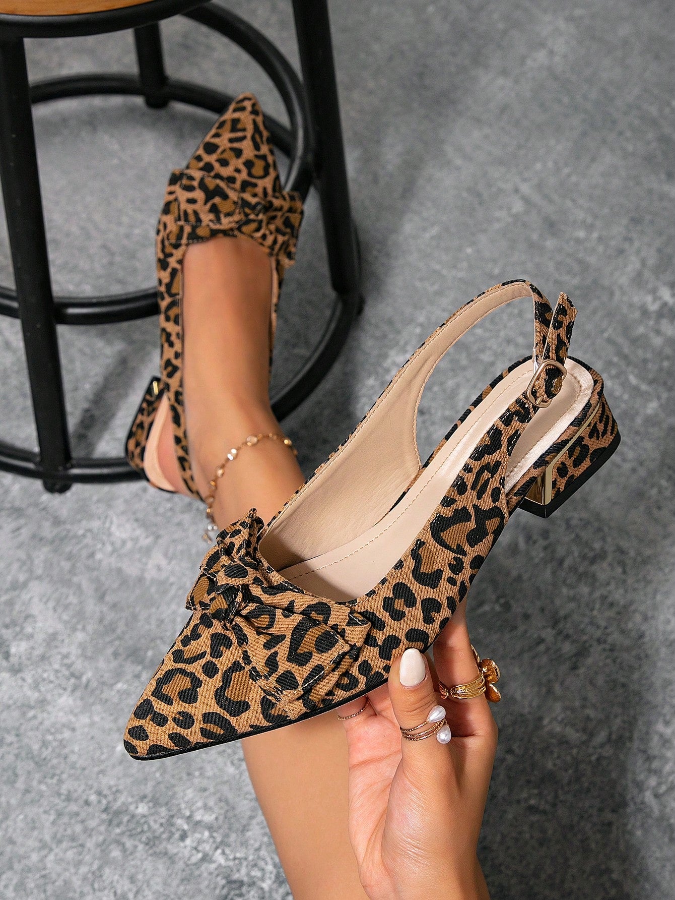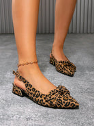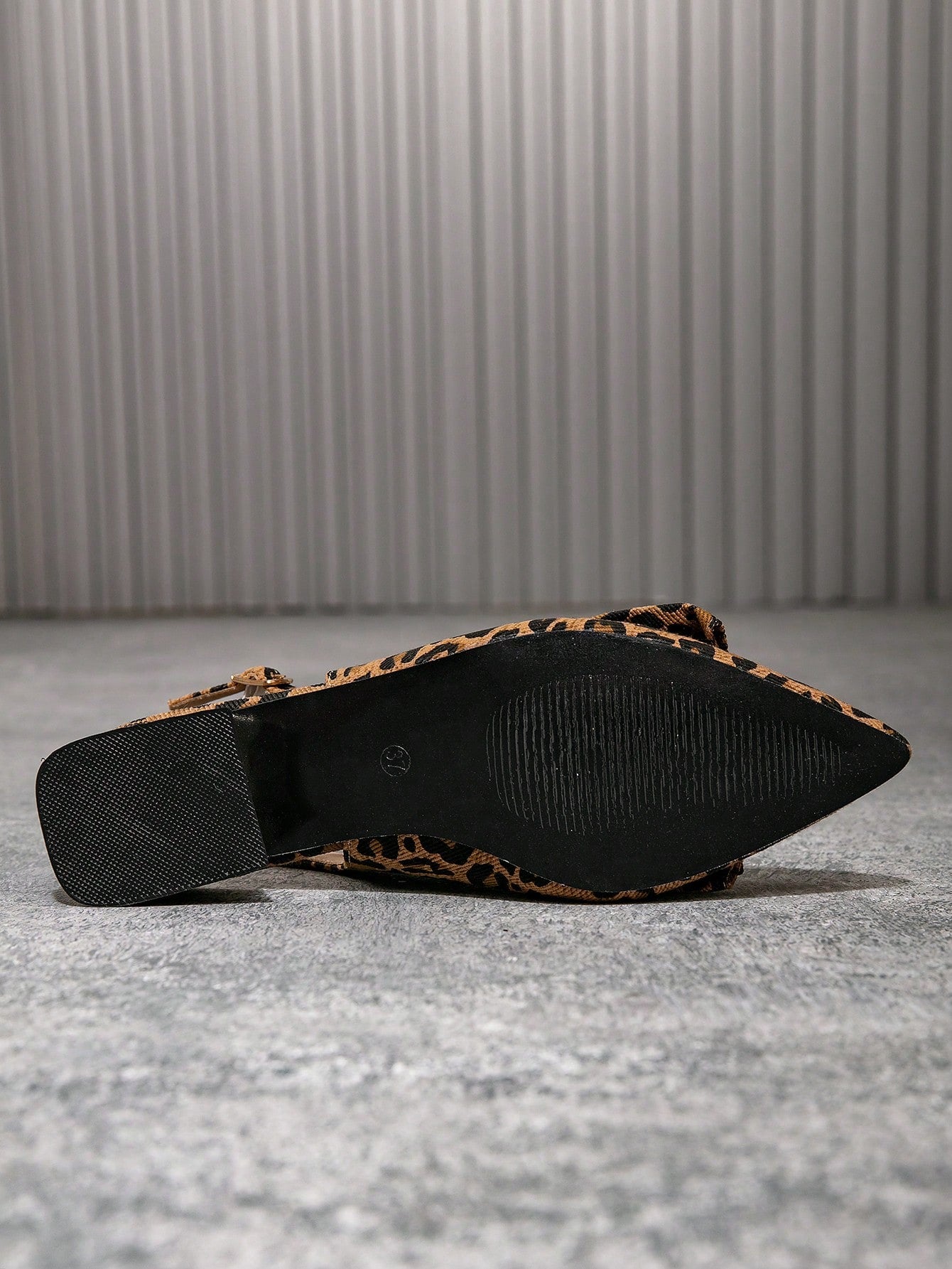 حذاء نسائي مسطح بكعب عالٍ مدبب من الأمام بنقشة جلد النمر، مزين بفيونكة، مناسب للمناسبات الرسمية وغير الرسمية.