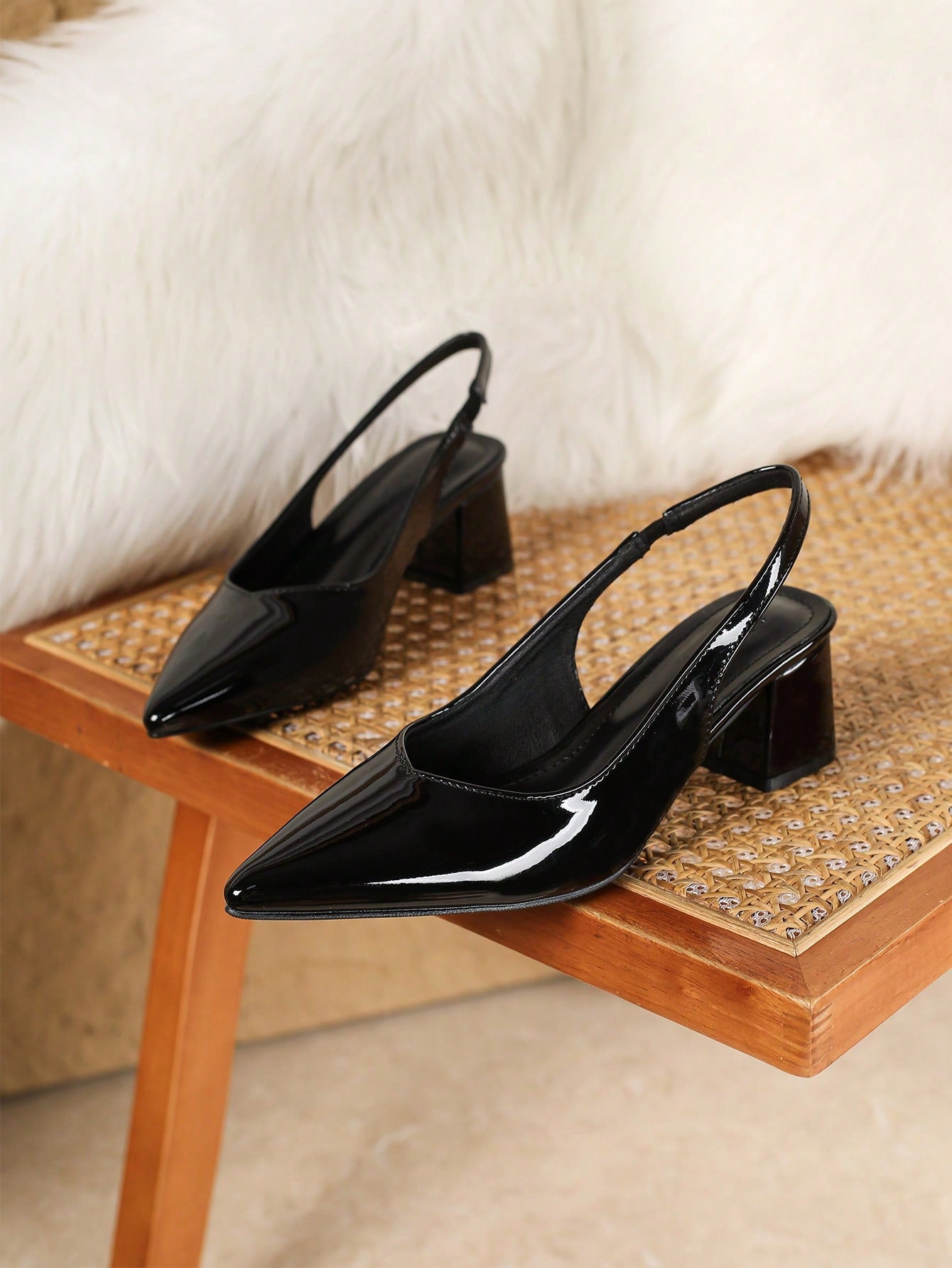 حذاء نسائي بكعب عريض مدبب من الجلد اللامع مع شريط مطاطي