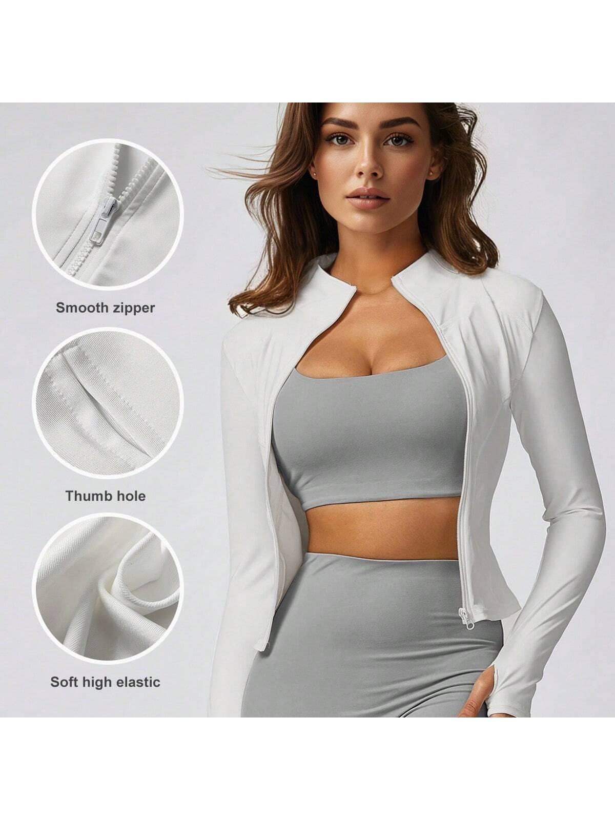 جاكيت رياضي نسائي بلون موحد وياقة واقفة - جاكيت يوغا خفيف الوزن بسحاب كامل