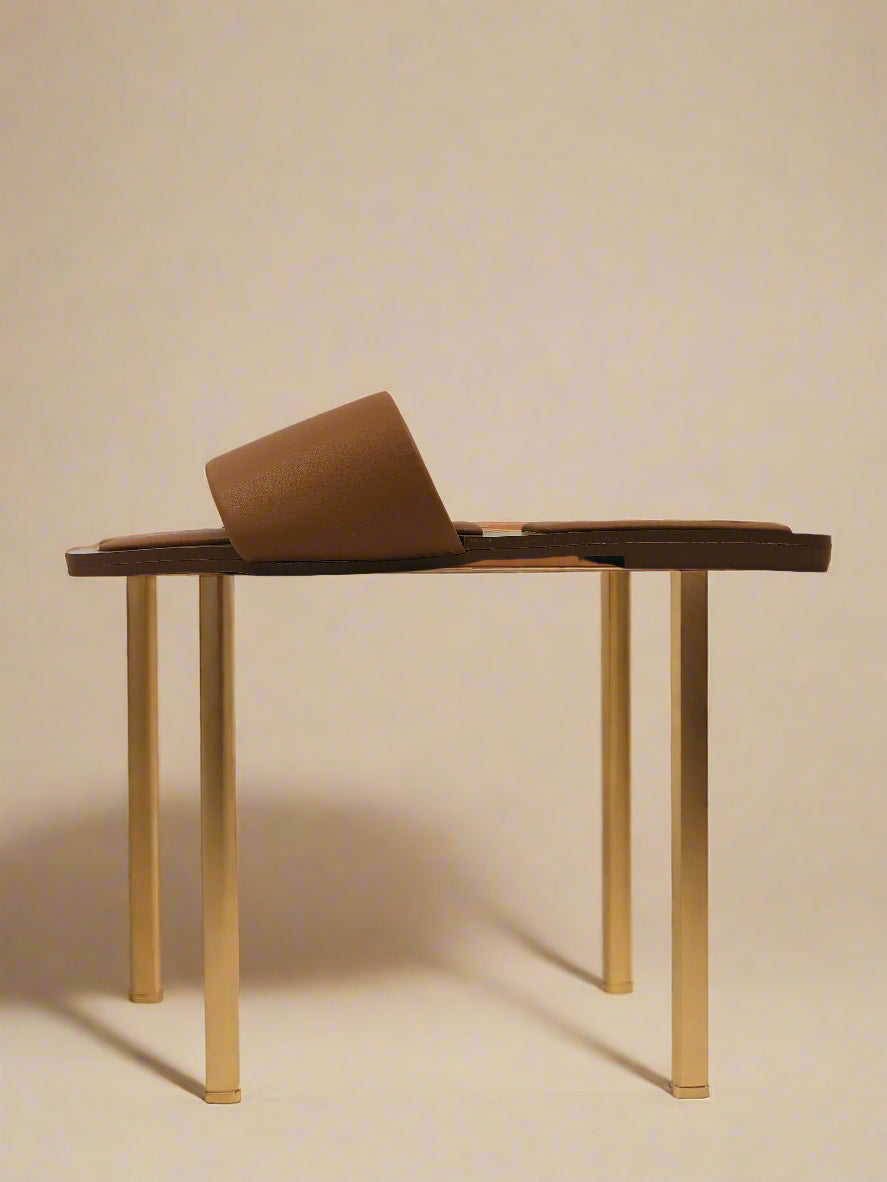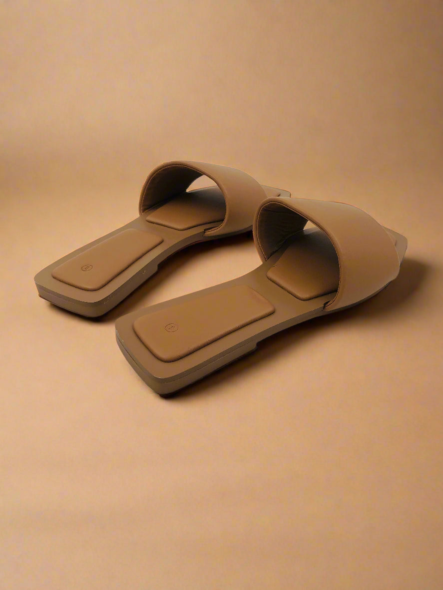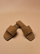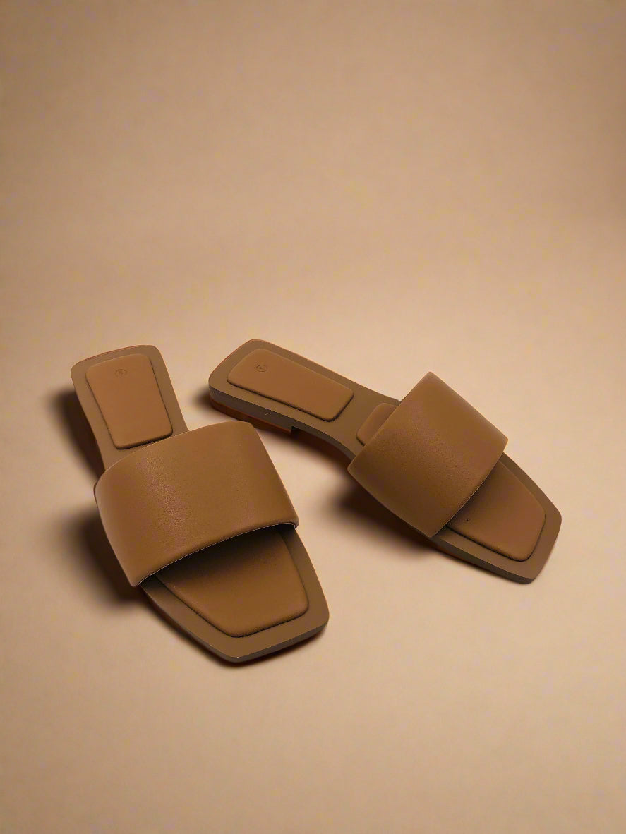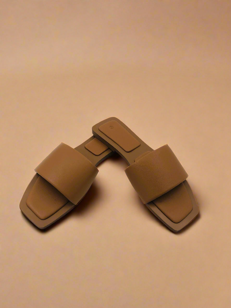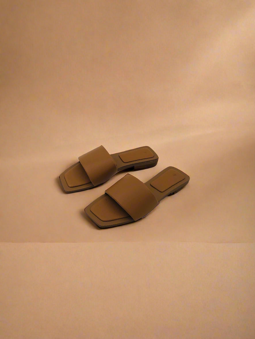 نعال مسطحة مفتوحة من الأمام باللون الكاكي مخصصة للخارج مع شريط واحد ومقدمة مربعة، ترفع أي إطلالة بسيطة وتمنحها لمسة أناقة فوراً.
