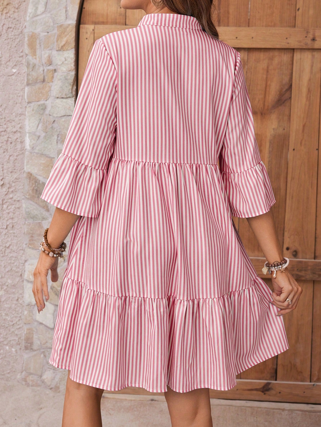 فستان نسائي مخطط بياقة قائمة وأكمام ثلاثة أرباع للحوامل