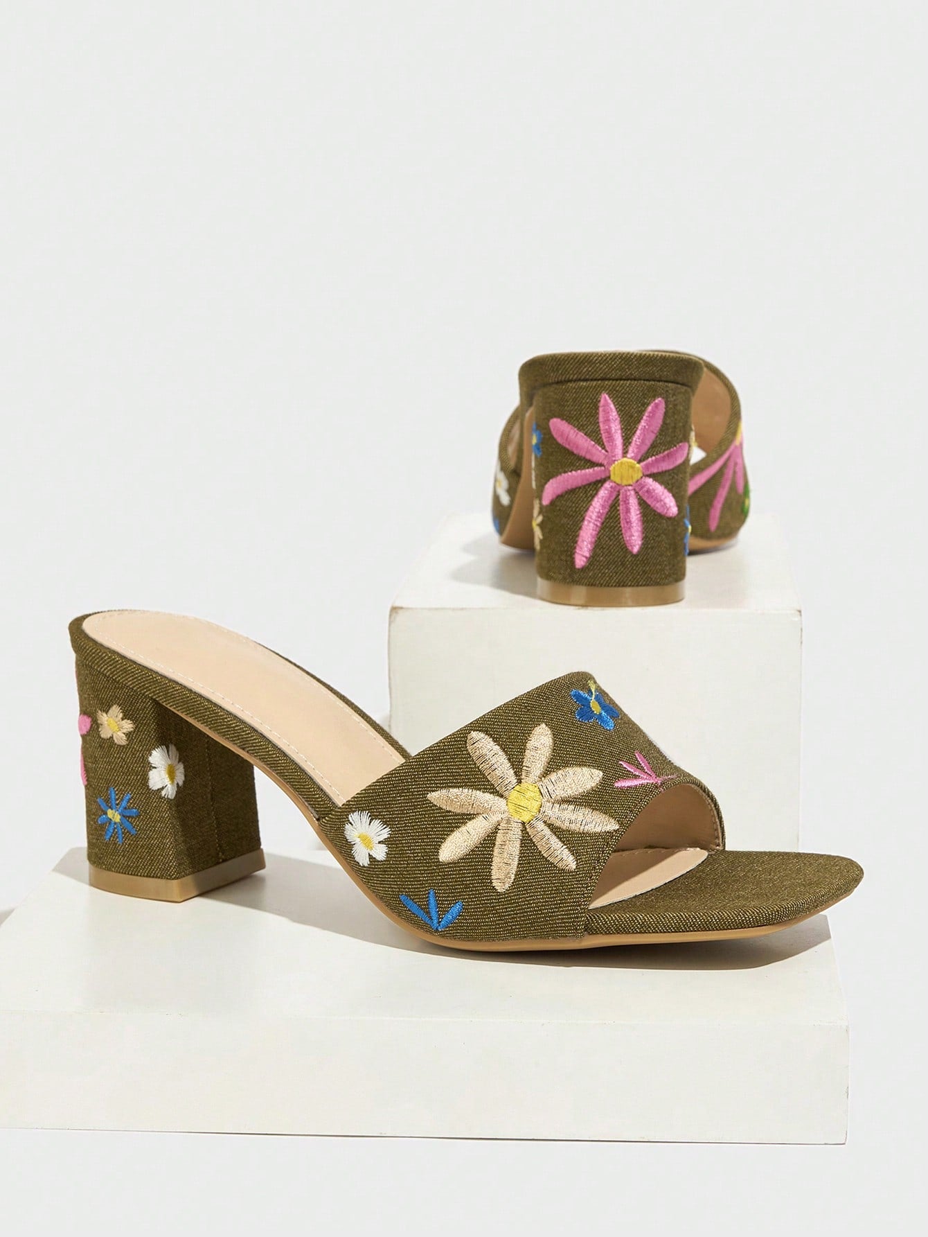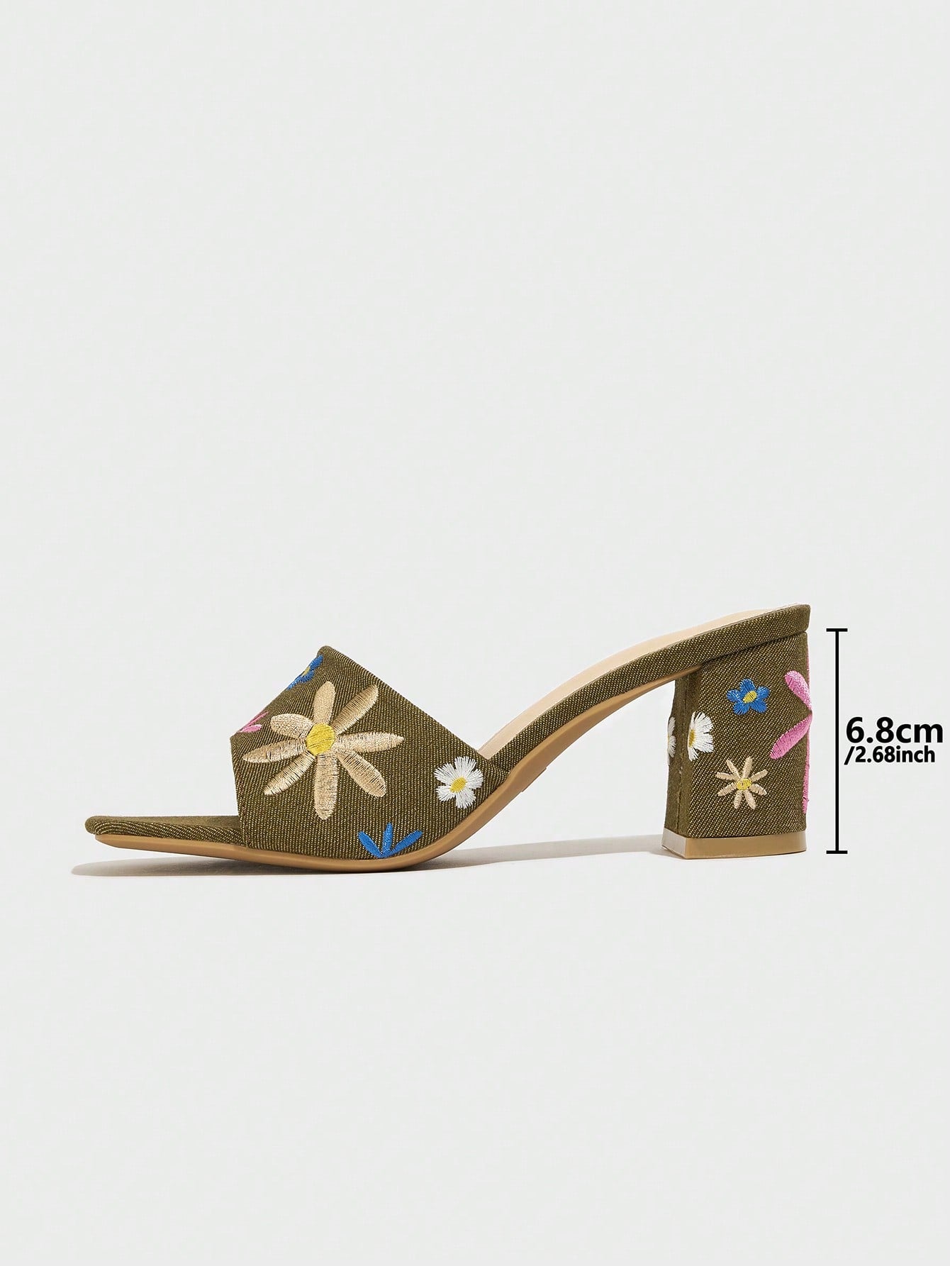 women Women's Thick Heeled Open-Toe Apricot Embroidered Floral Slip-On Breathable Mules Summer High Heel Sandals