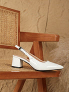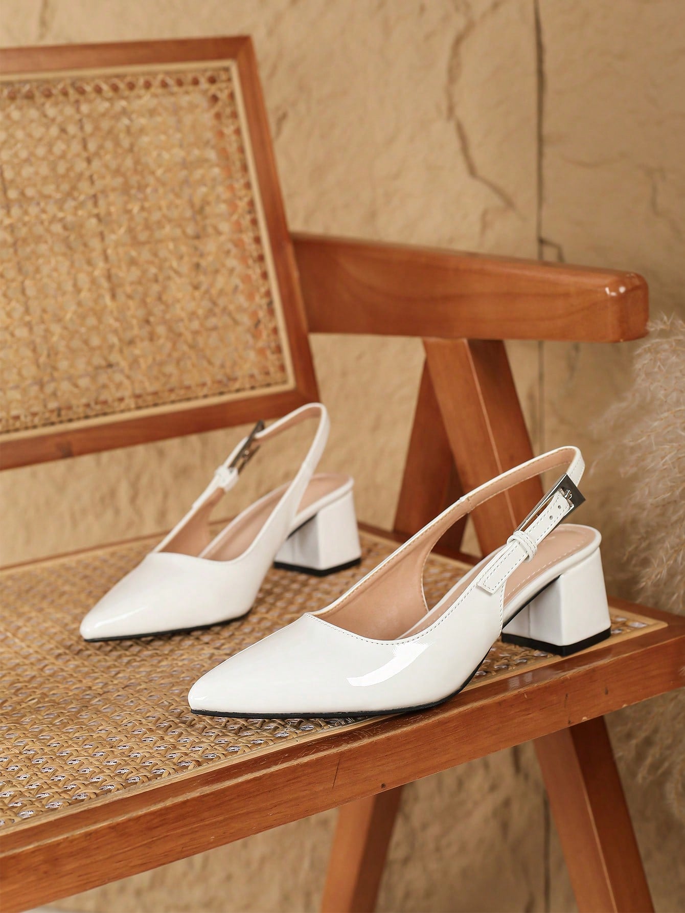 حذاء نسائي أبيض لامع بكعب عريض ومقدمة مدببة وحزام واحد