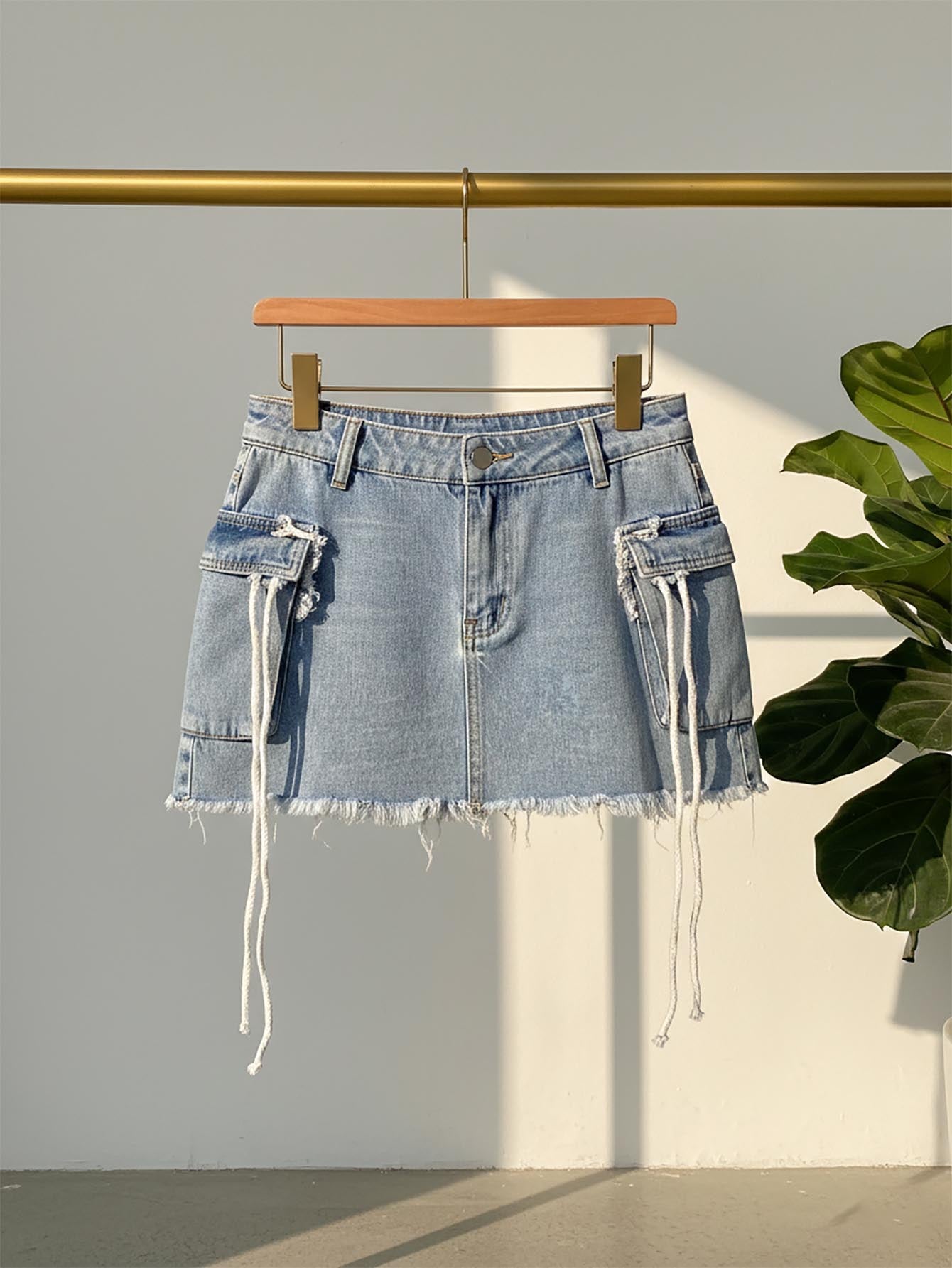 تنورة جينز قصيرة كارجو بتفاصيل شريطية وجيب قلاب على طراز الألفية الجديدة وحافة غير مخيطة