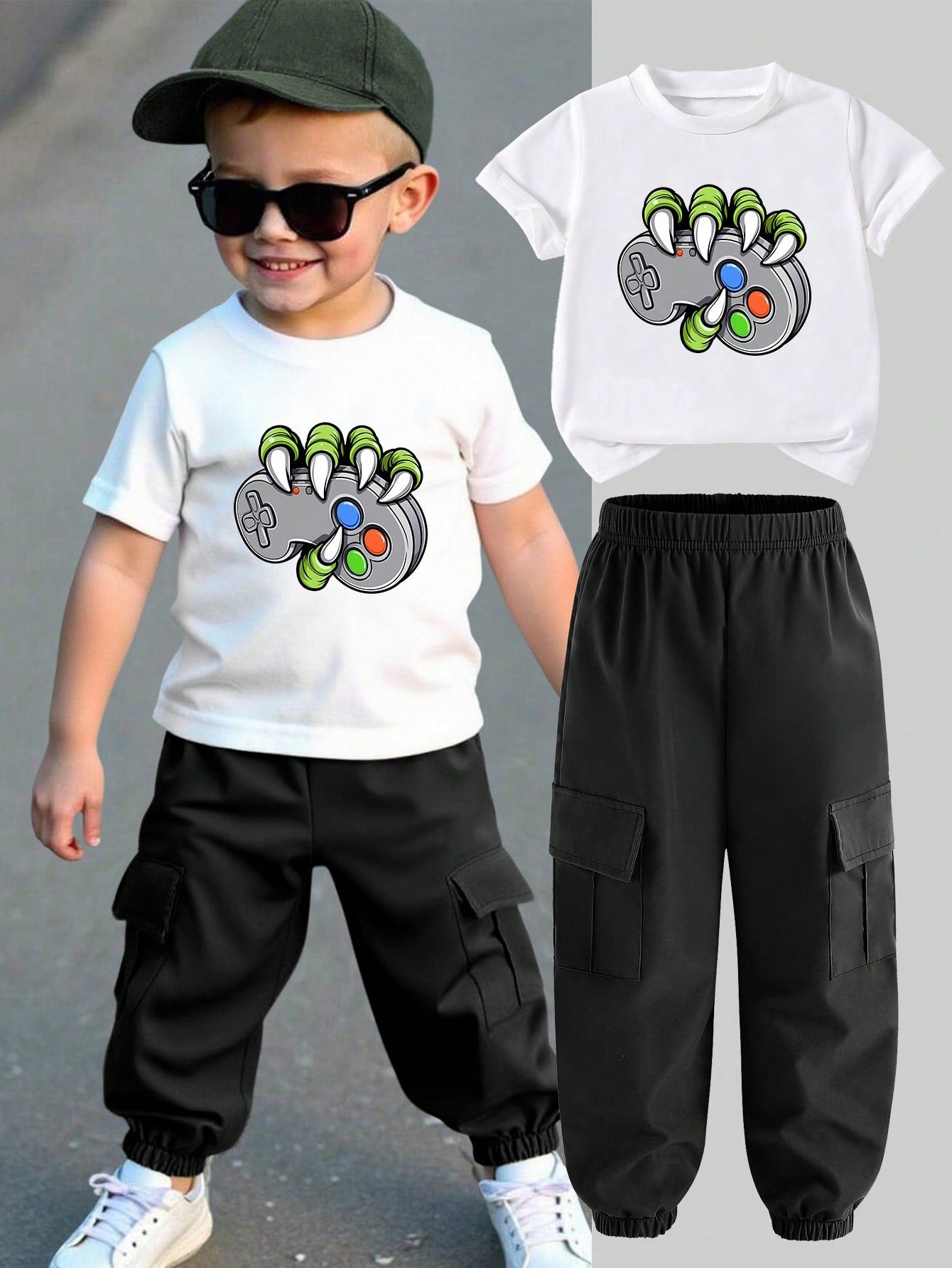 تي شيرت بأكمام قصيرة ورقبة دائرية وطبعة وحدة تحكم لعبة "الوحش" للأولاد الصغار وبنطلون كارجو برباط على الخصر