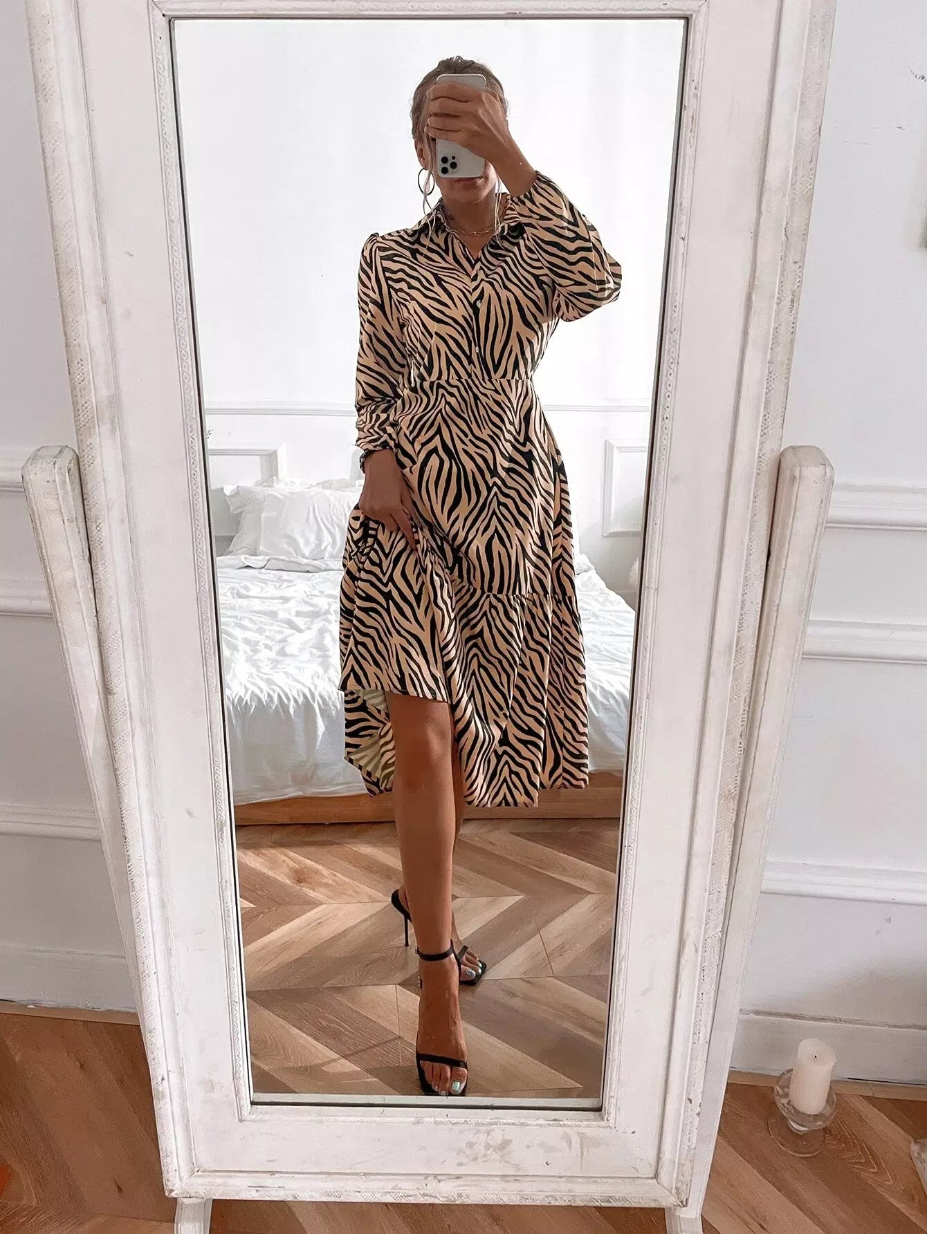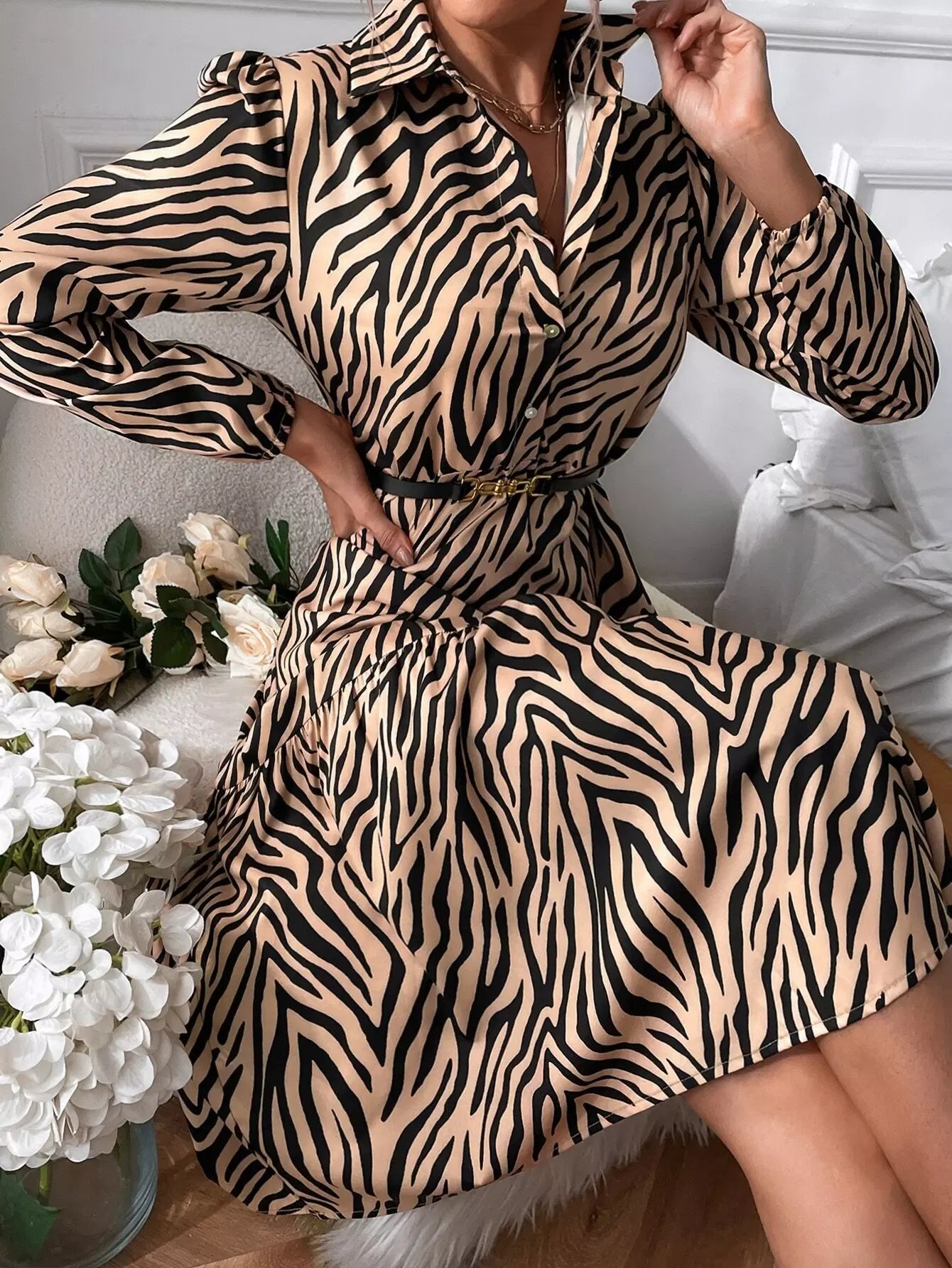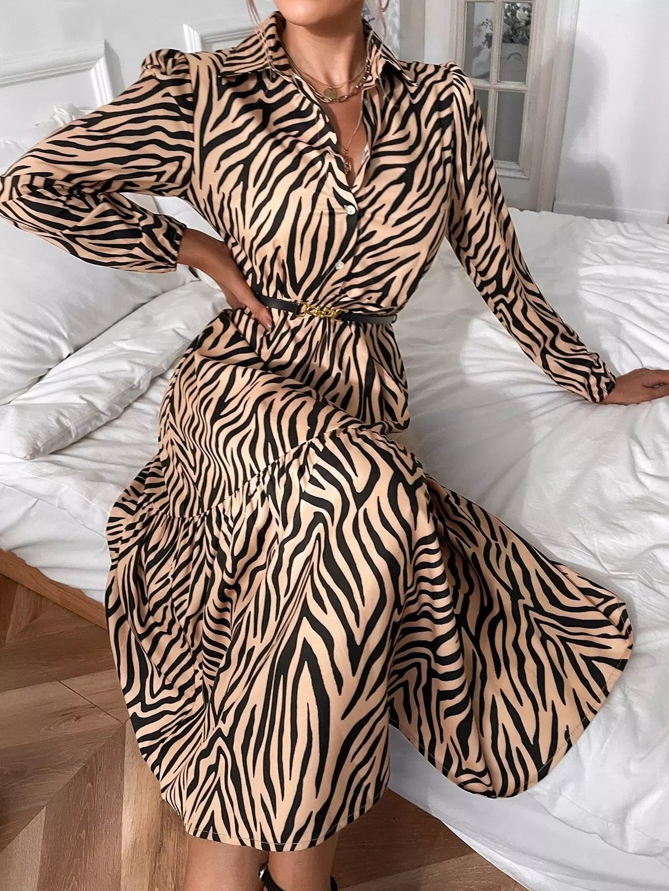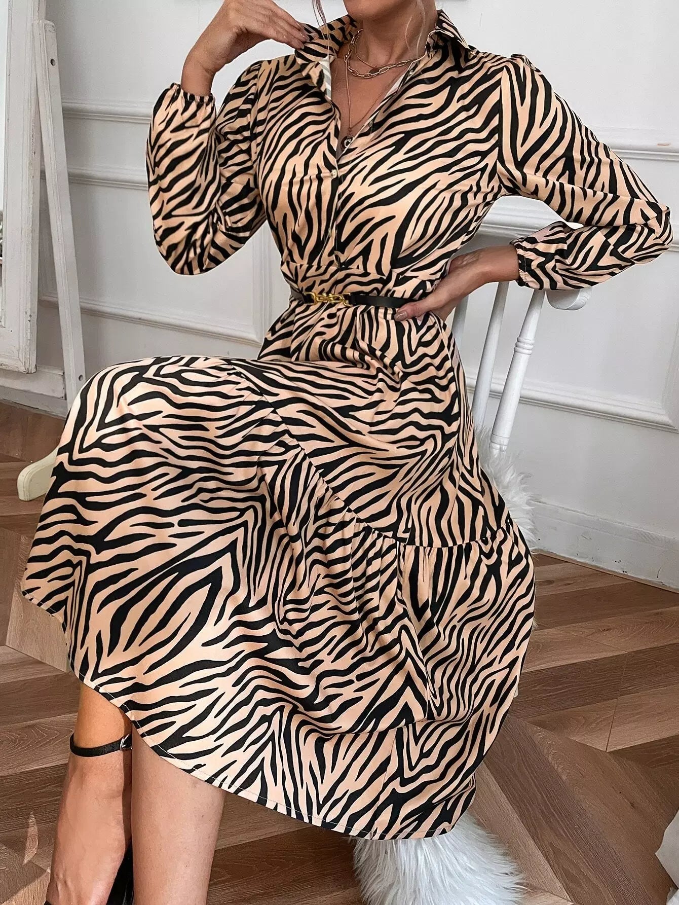 فستان قميص بحواف مكشكشة مخططة على شكل زيبرا