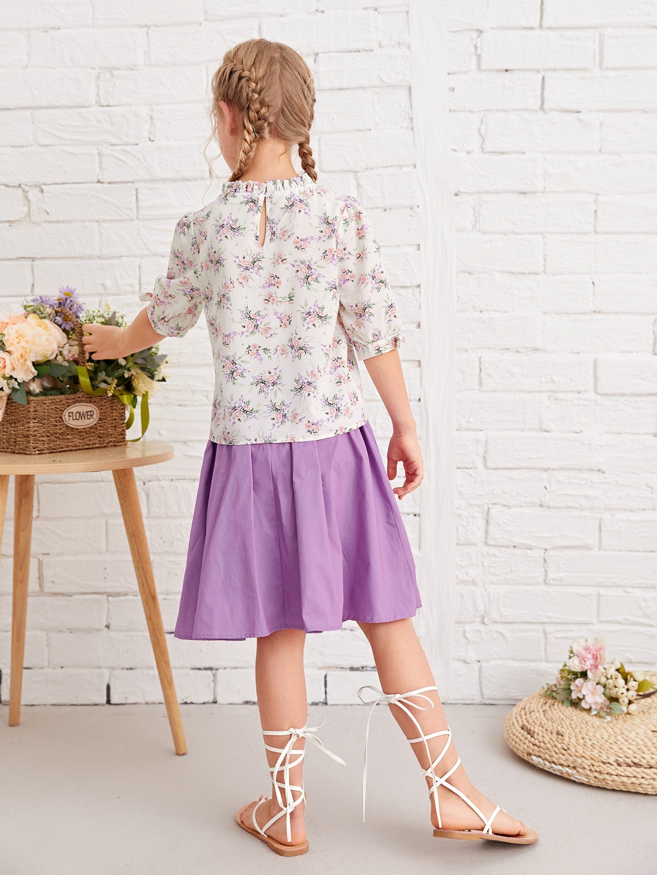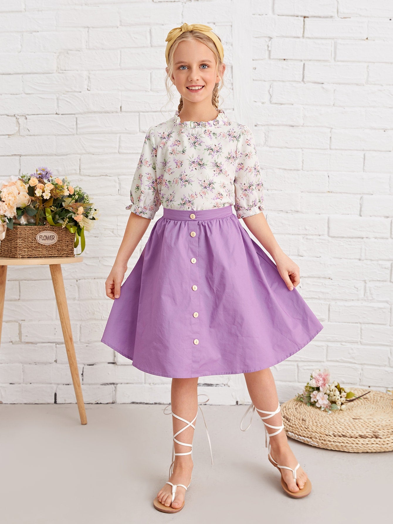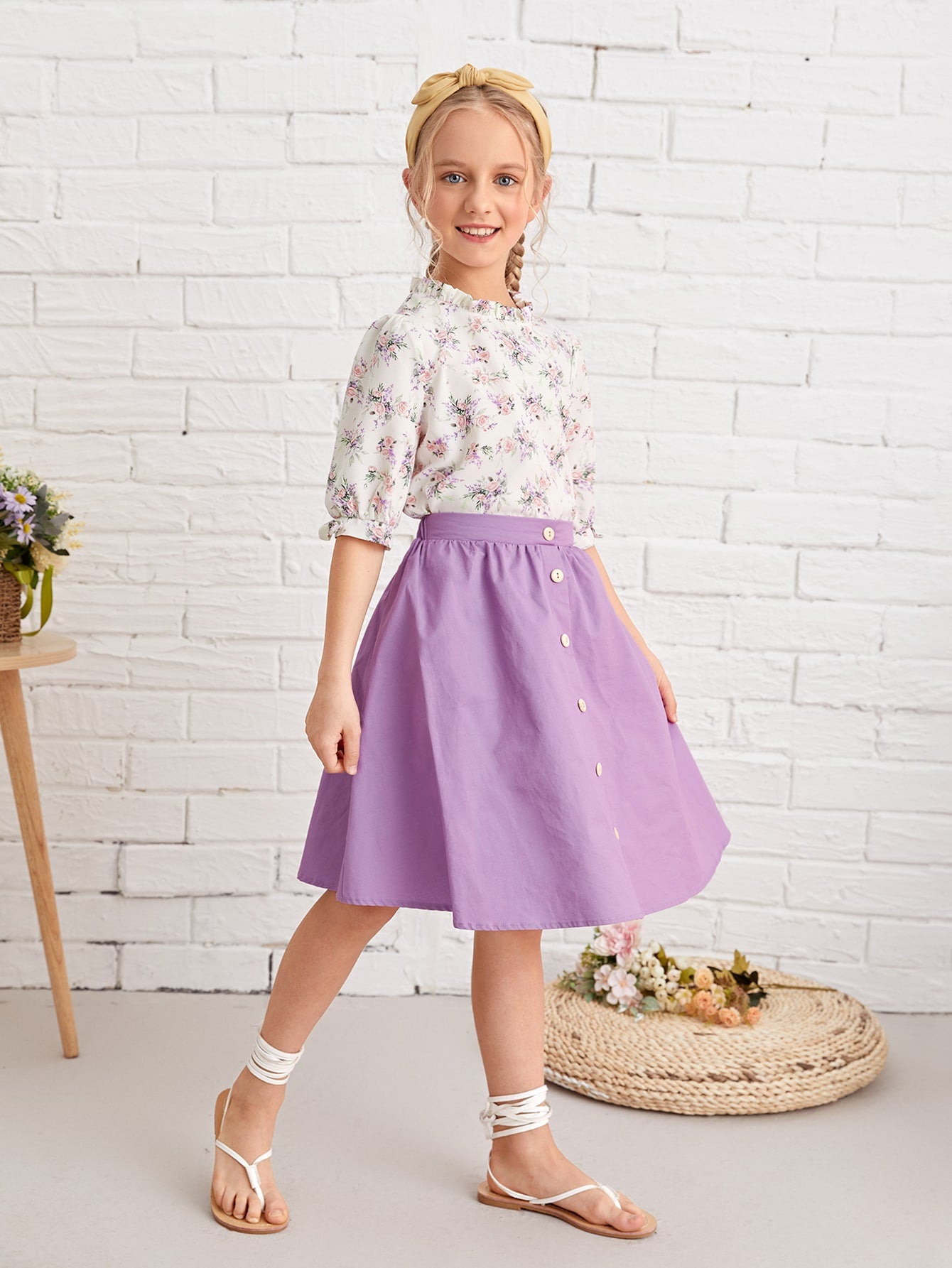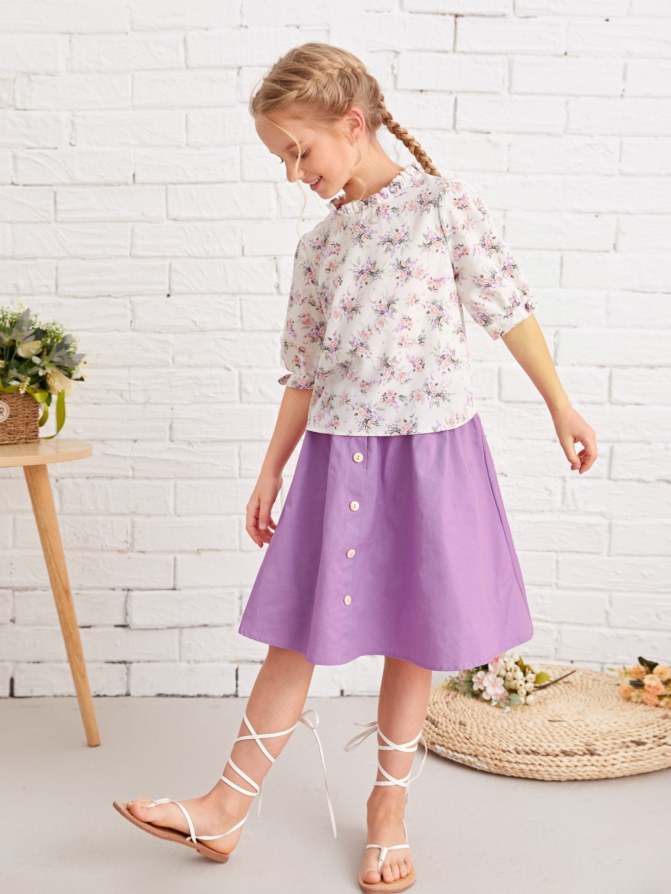 Girls Floral Frill Neck Top & Button Front Skirt Set