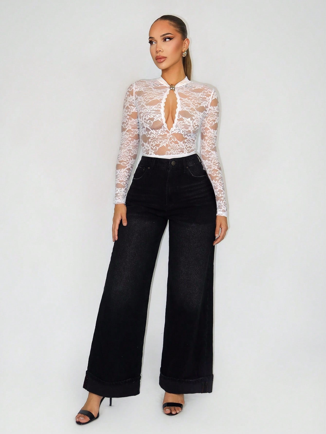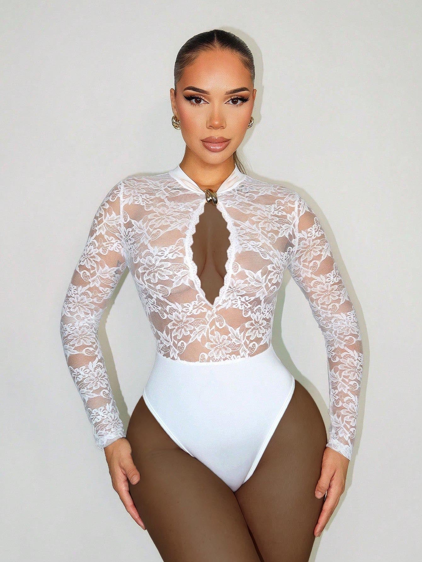 Zolique Sexy Lace Sheer Bodysuit With Long Sleeves