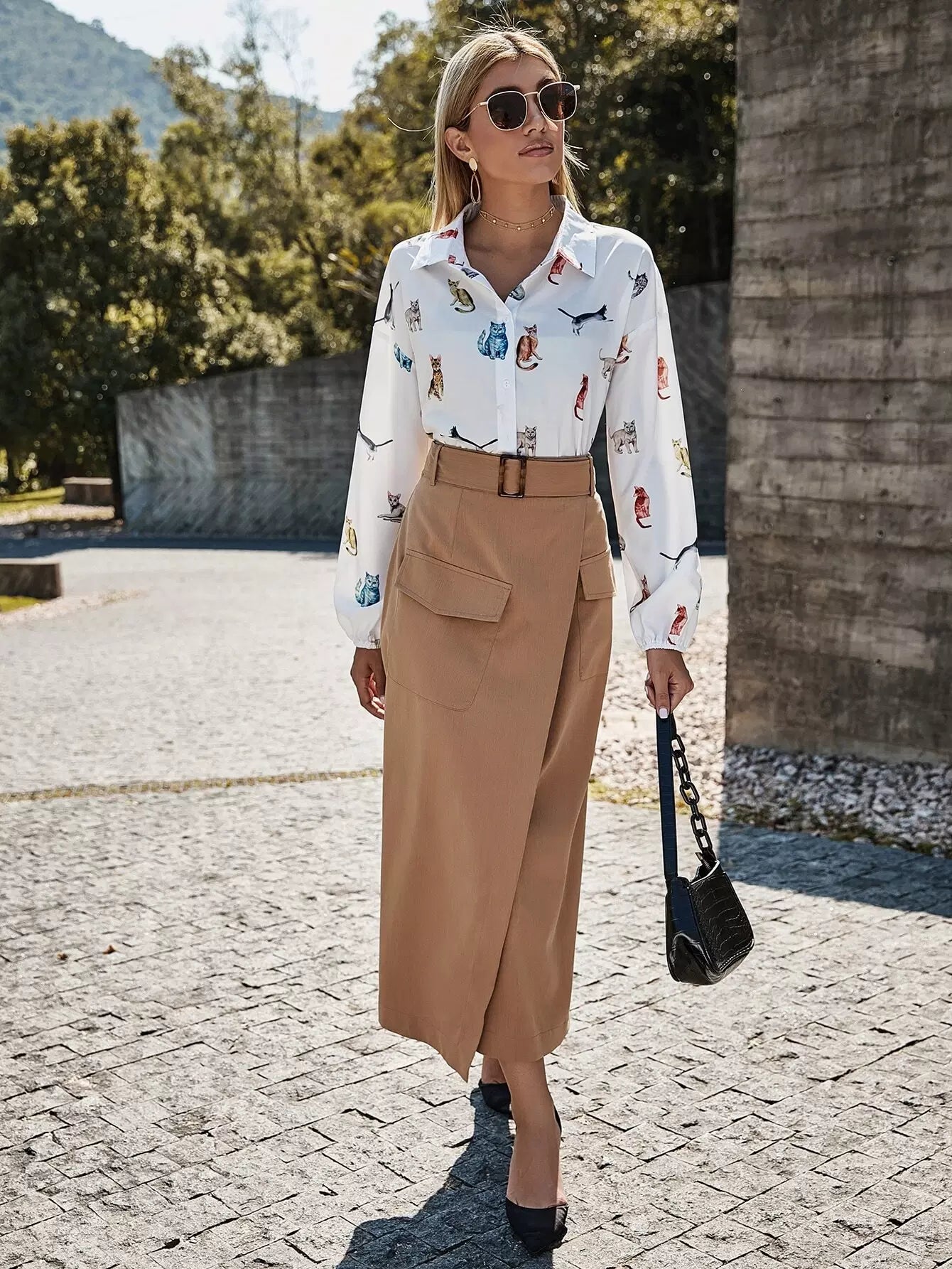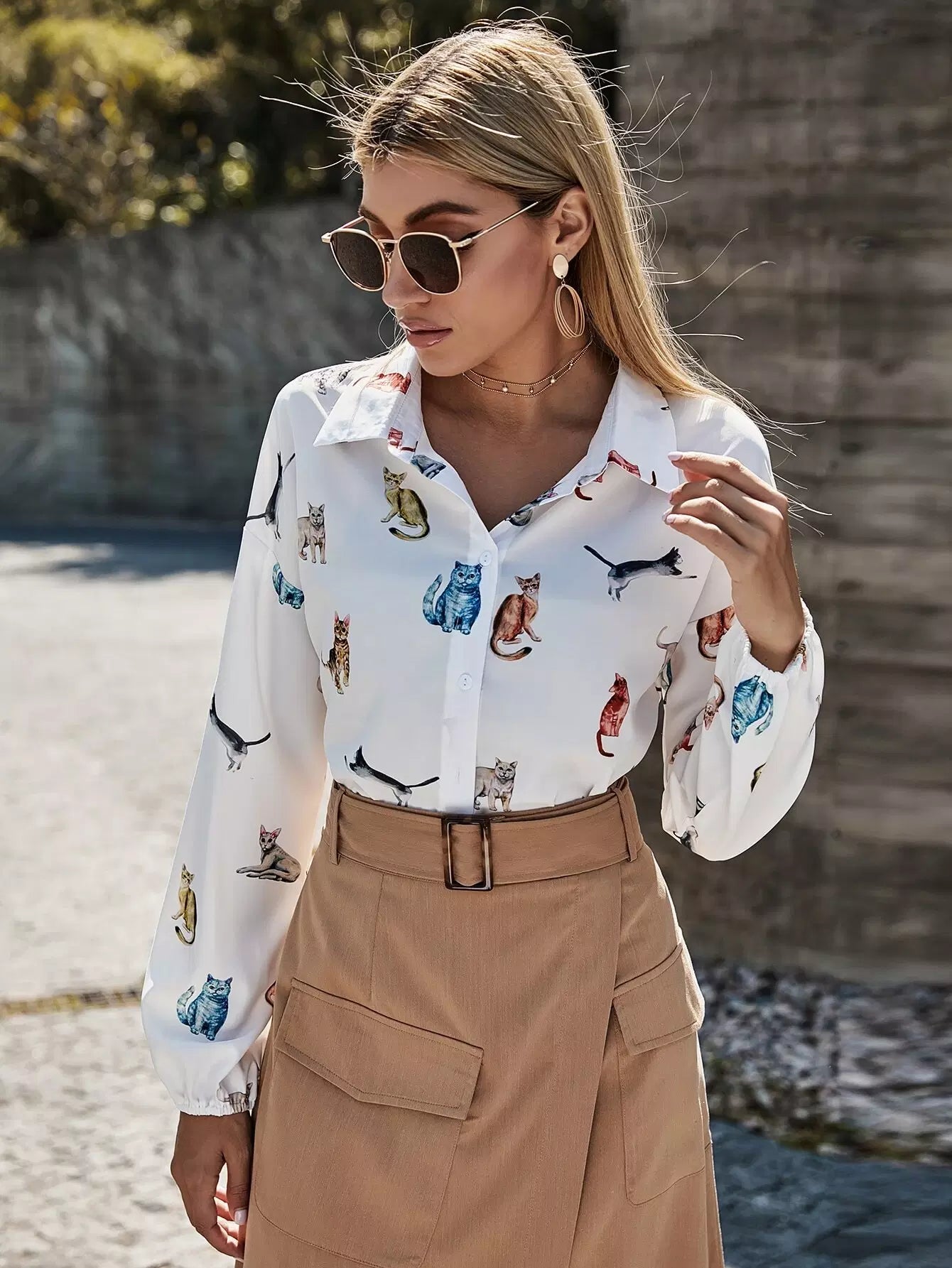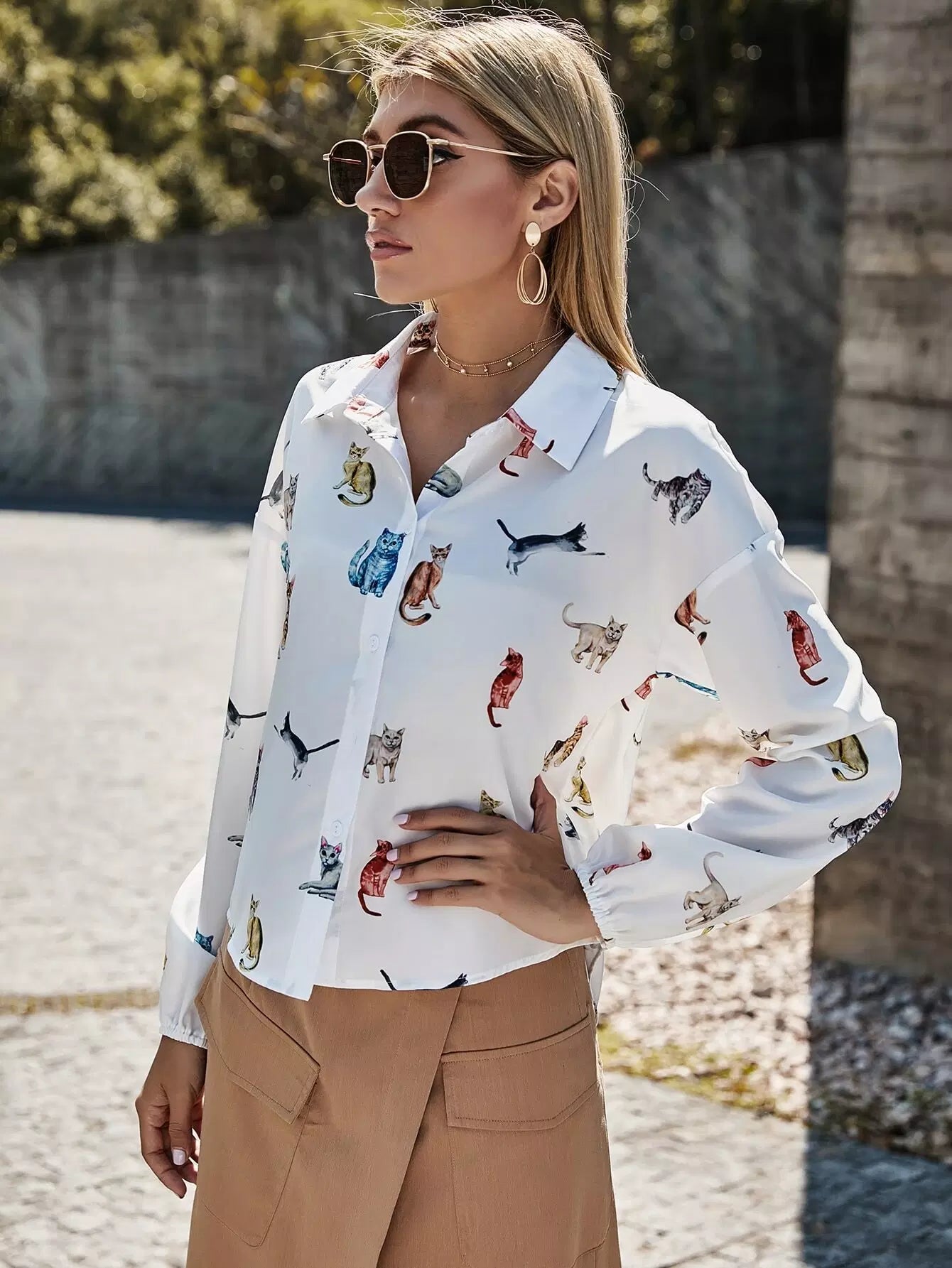 Women - Cat Print Button Front High Low Hem Shirt