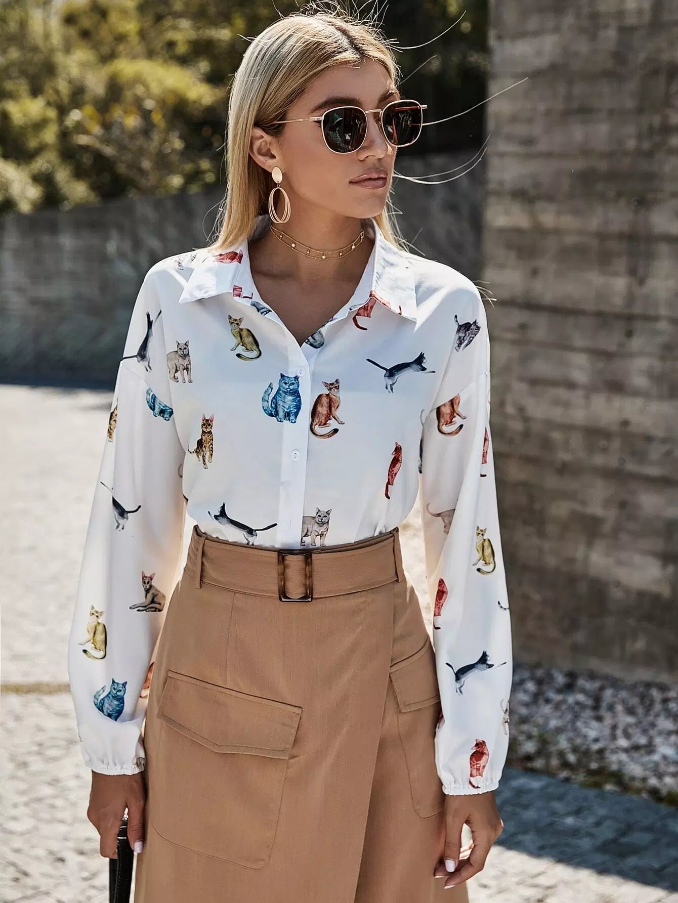 Cat Print Button Front High Low Hem Shirt