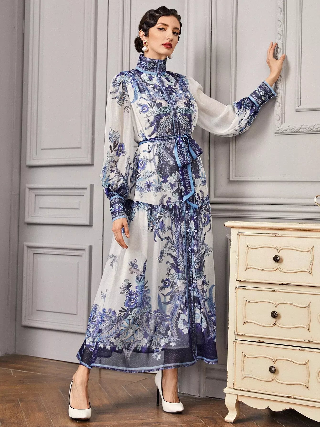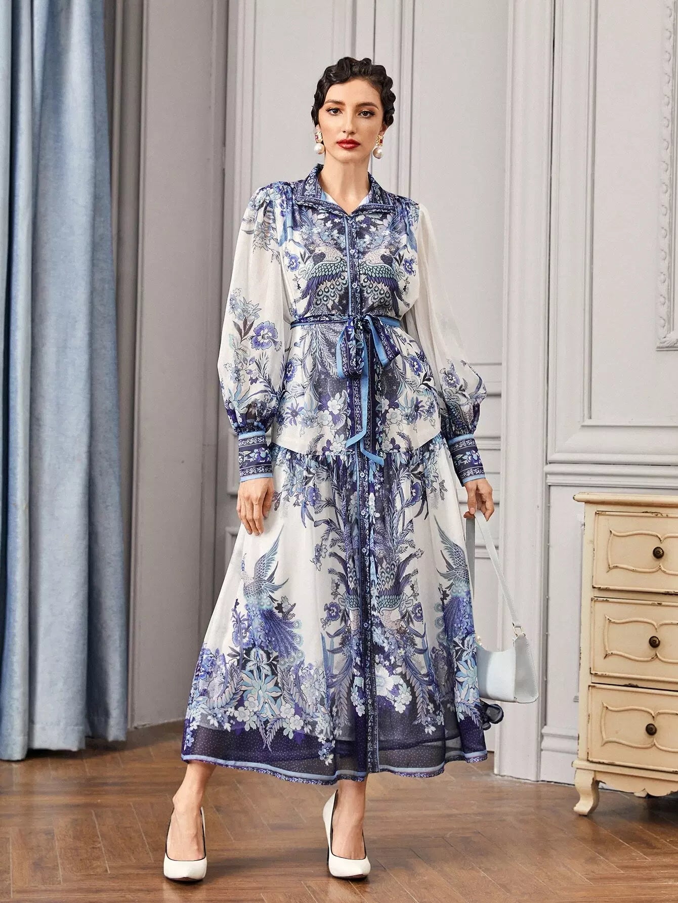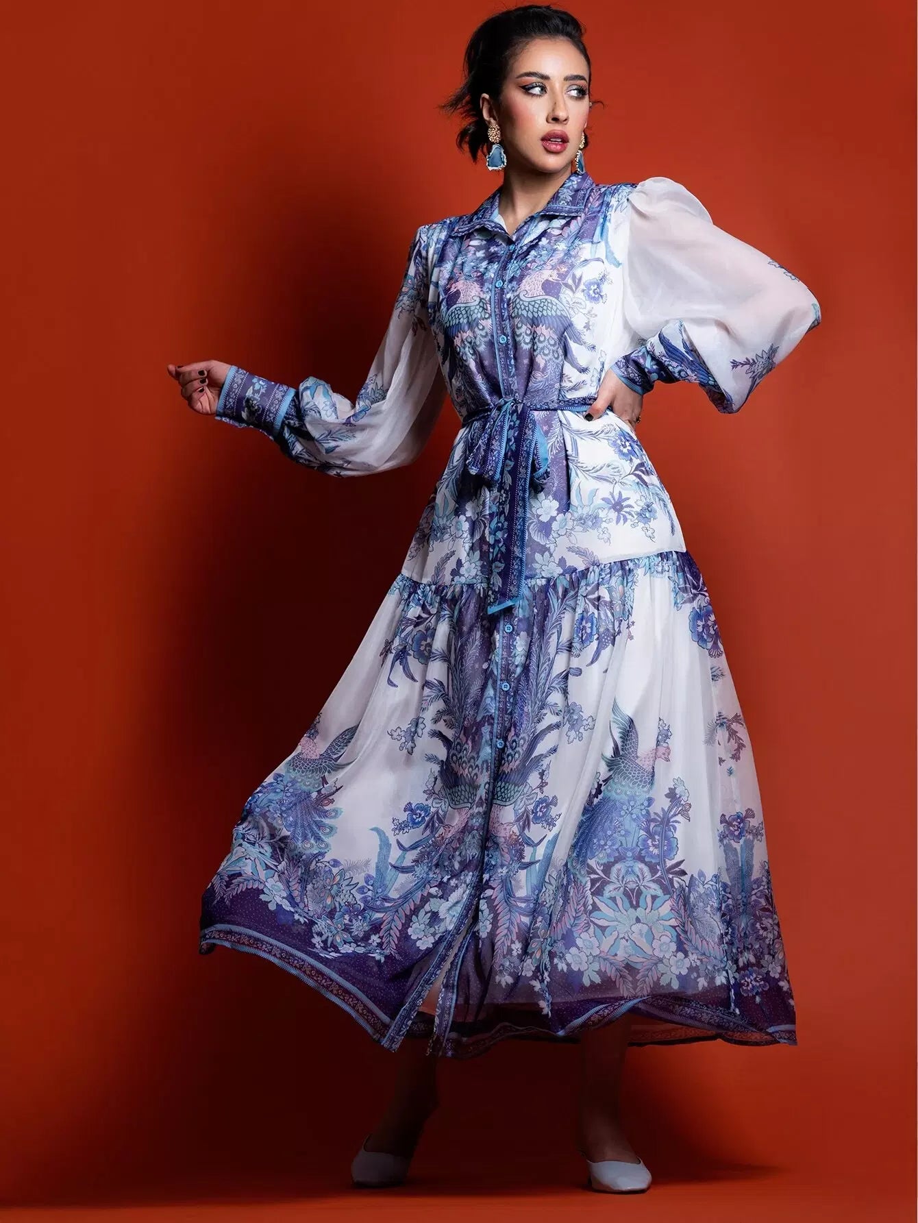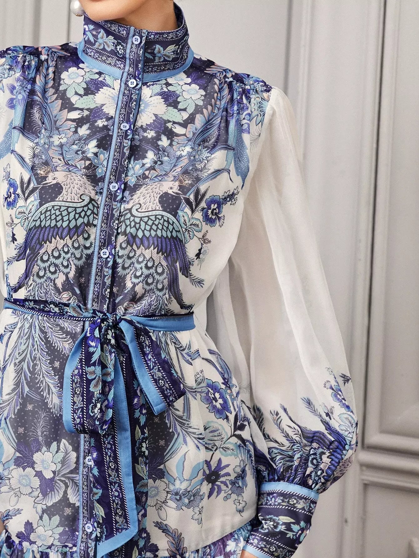 - Collared Buttoned Front Self Belted Peacock and Floral Dress