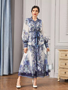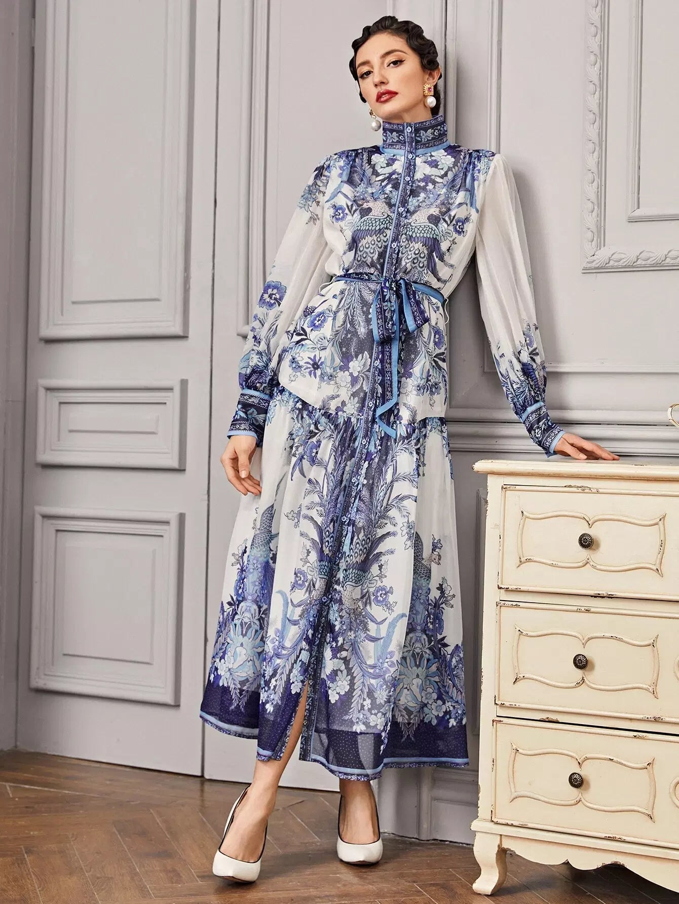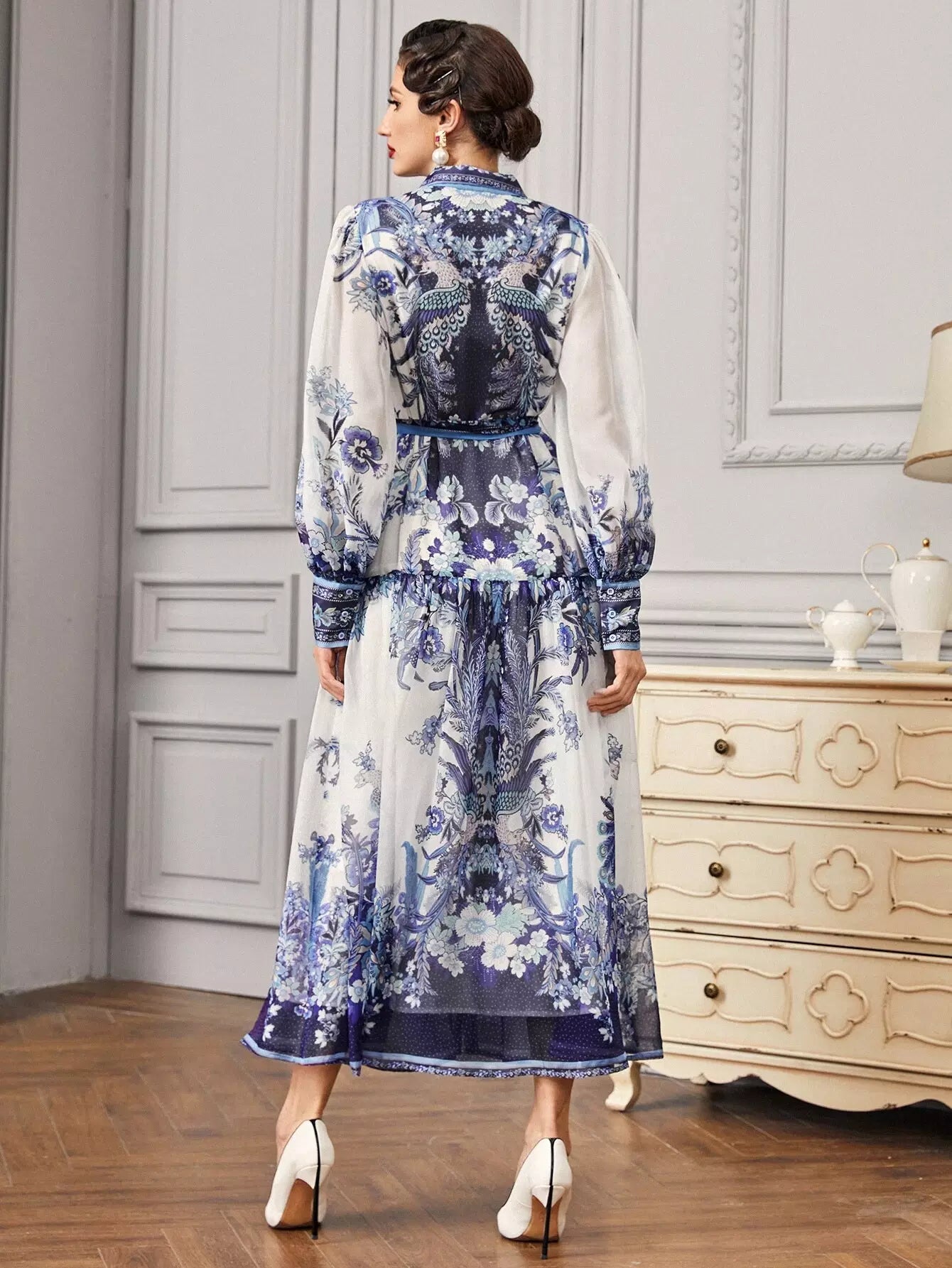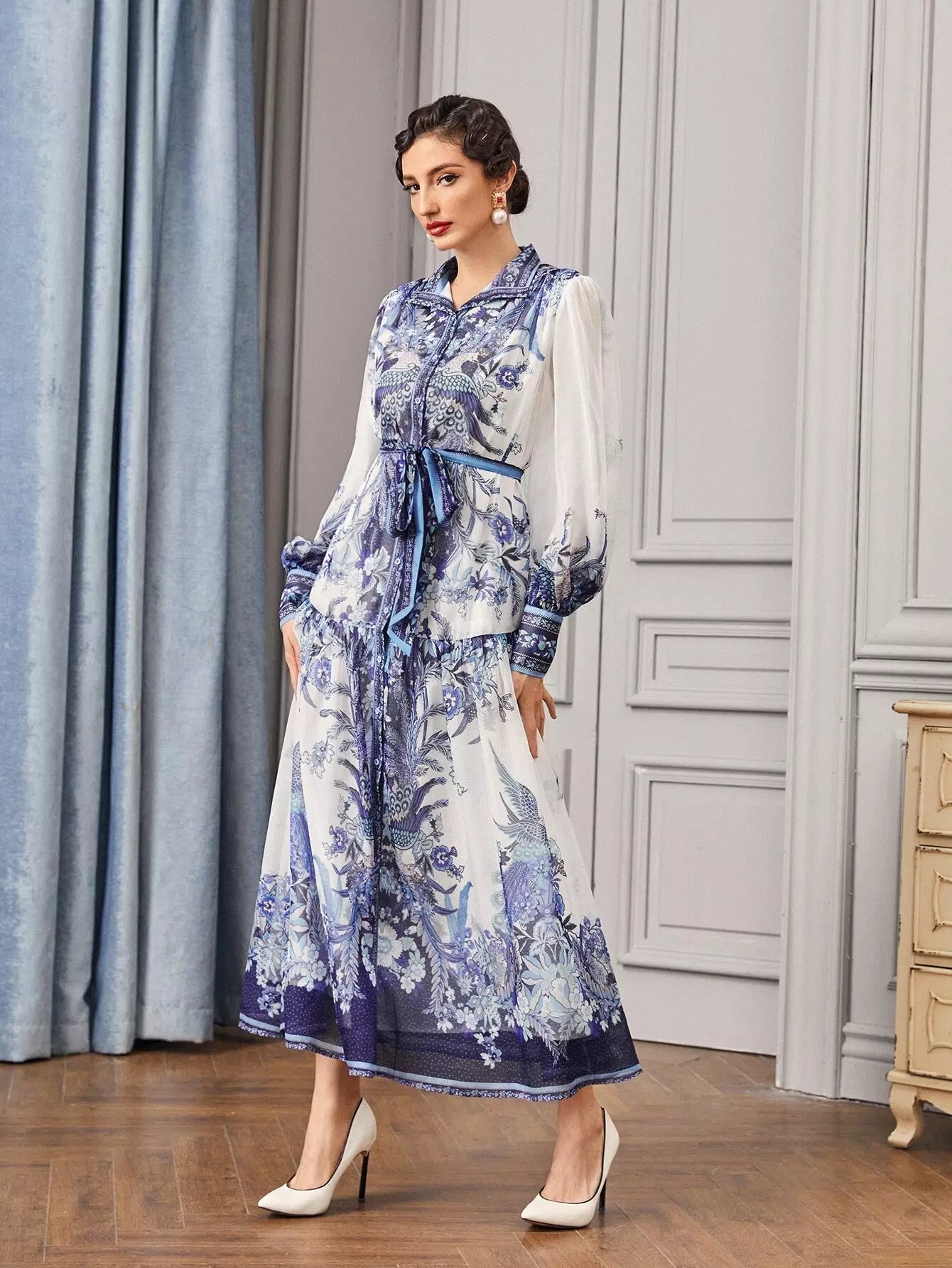 - Collared Buttoned Front Self Belted Peacock and Floral Dress