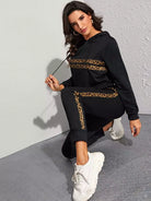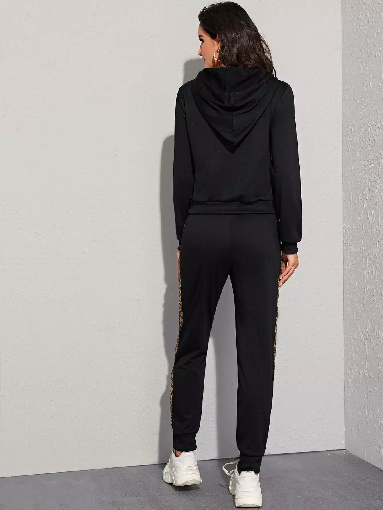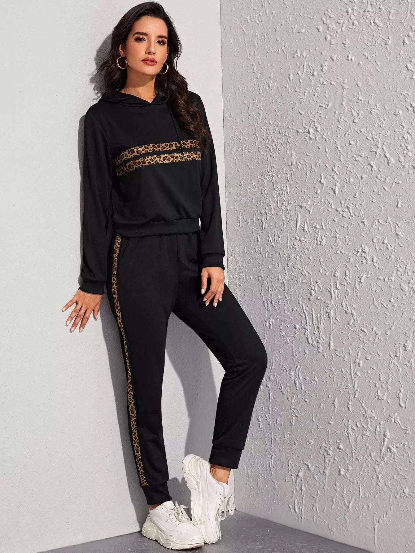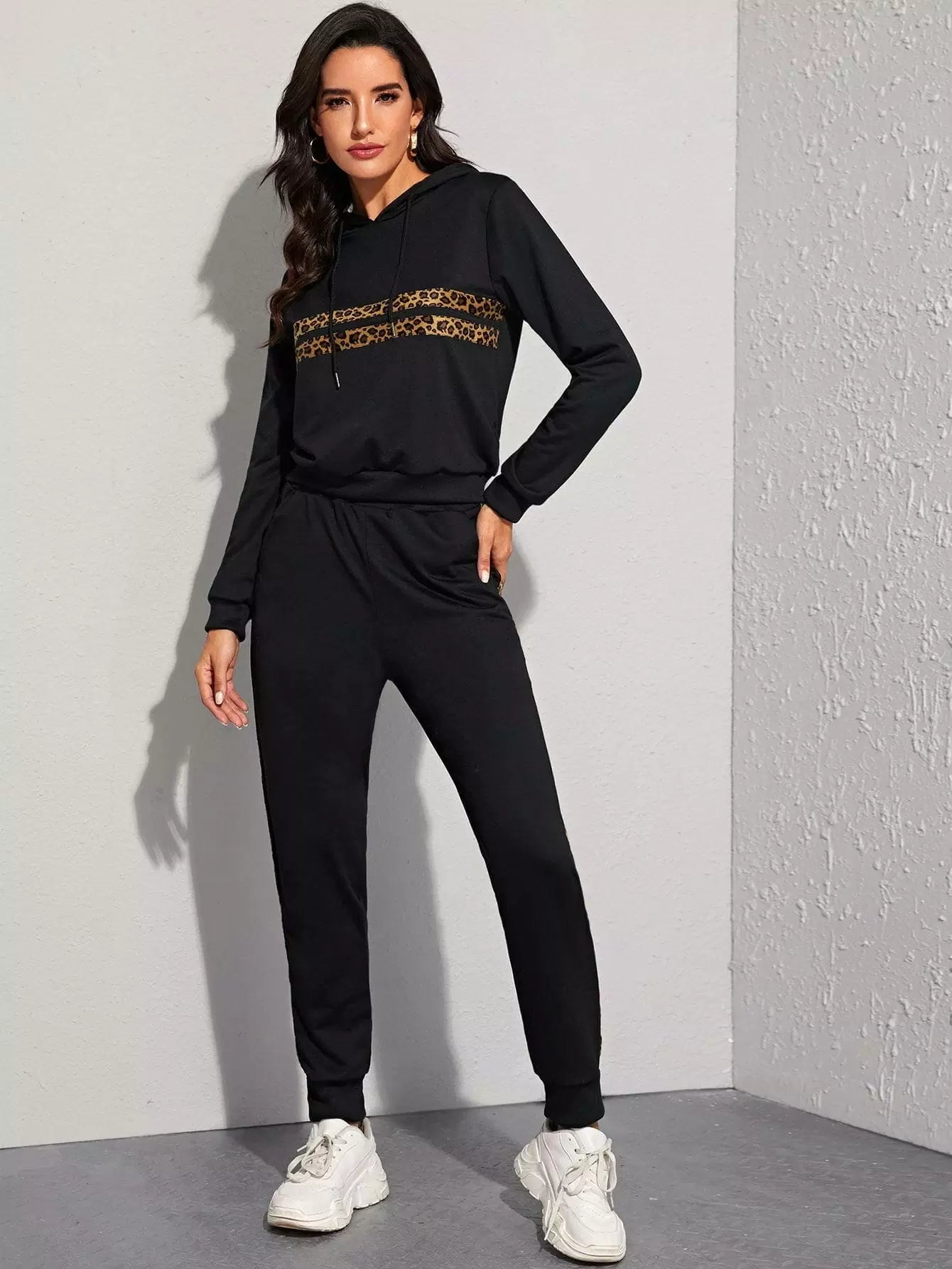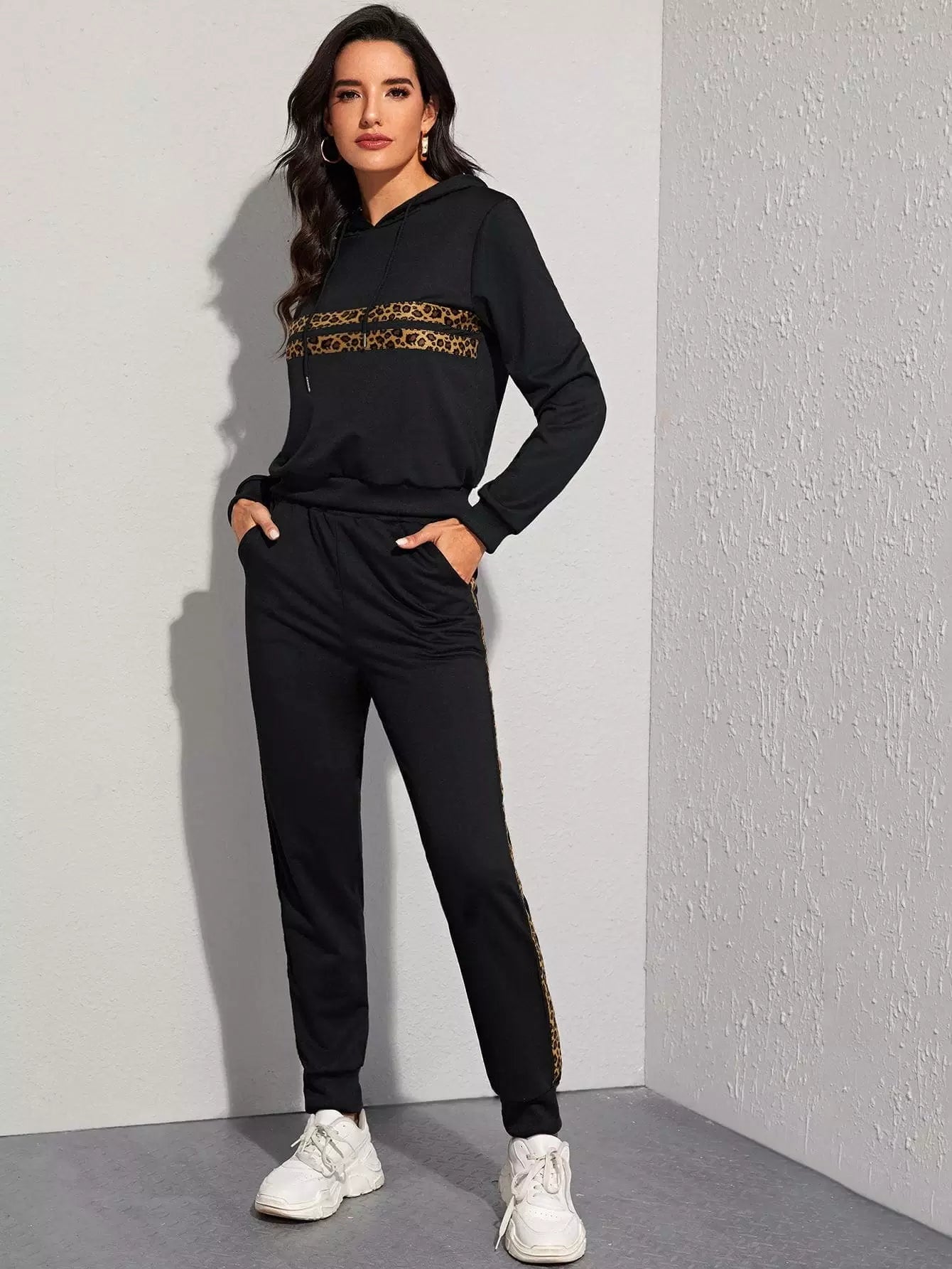 Contrast Leopard Drawstring Hoodie With Sweatpants
