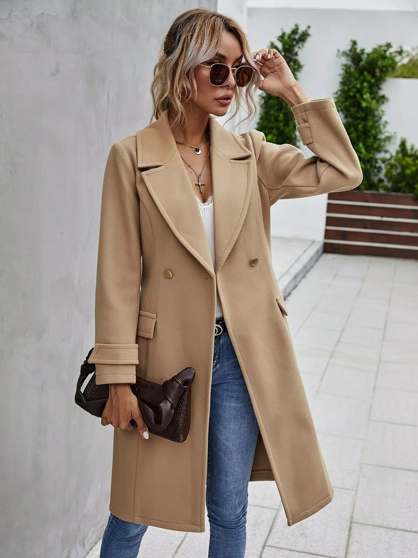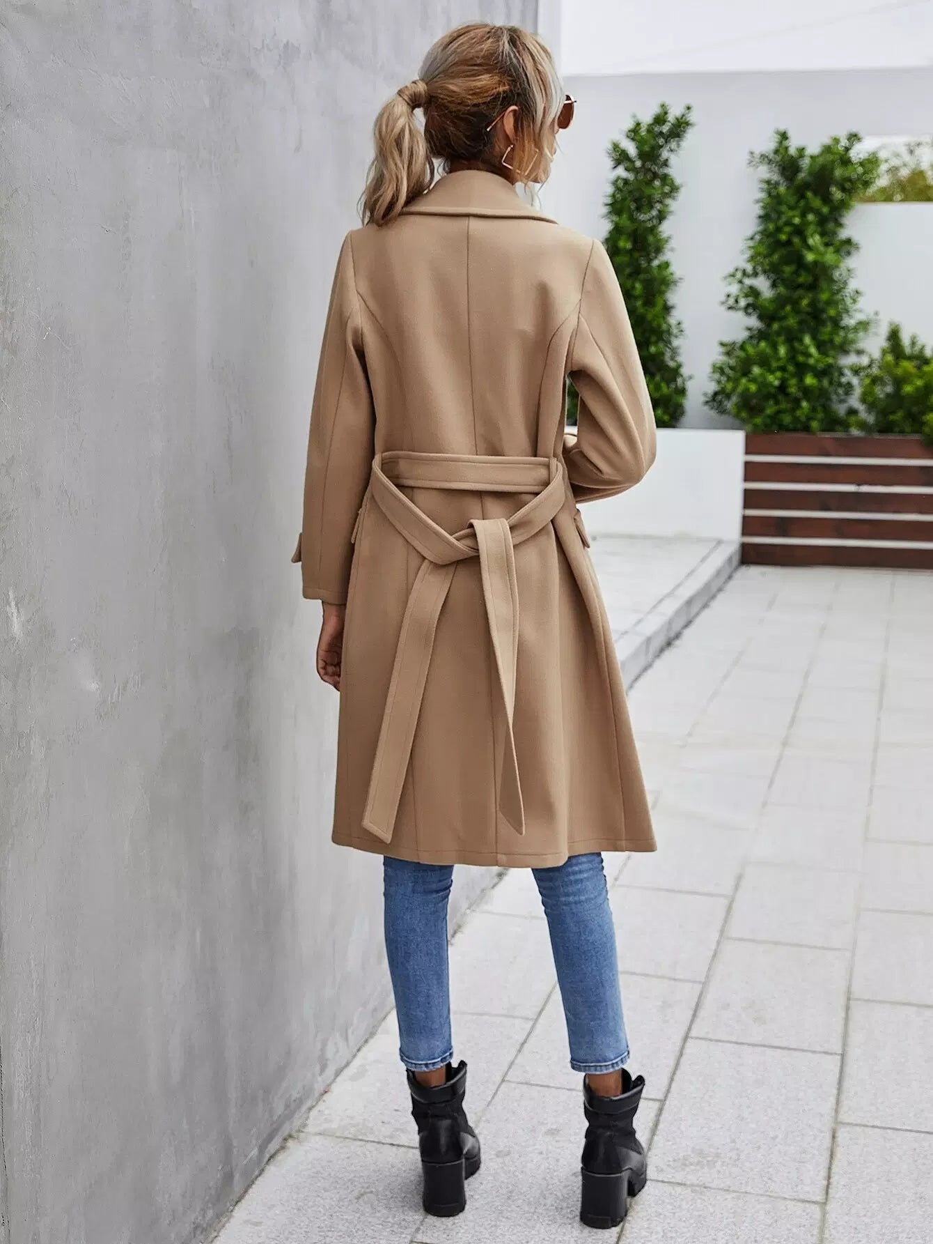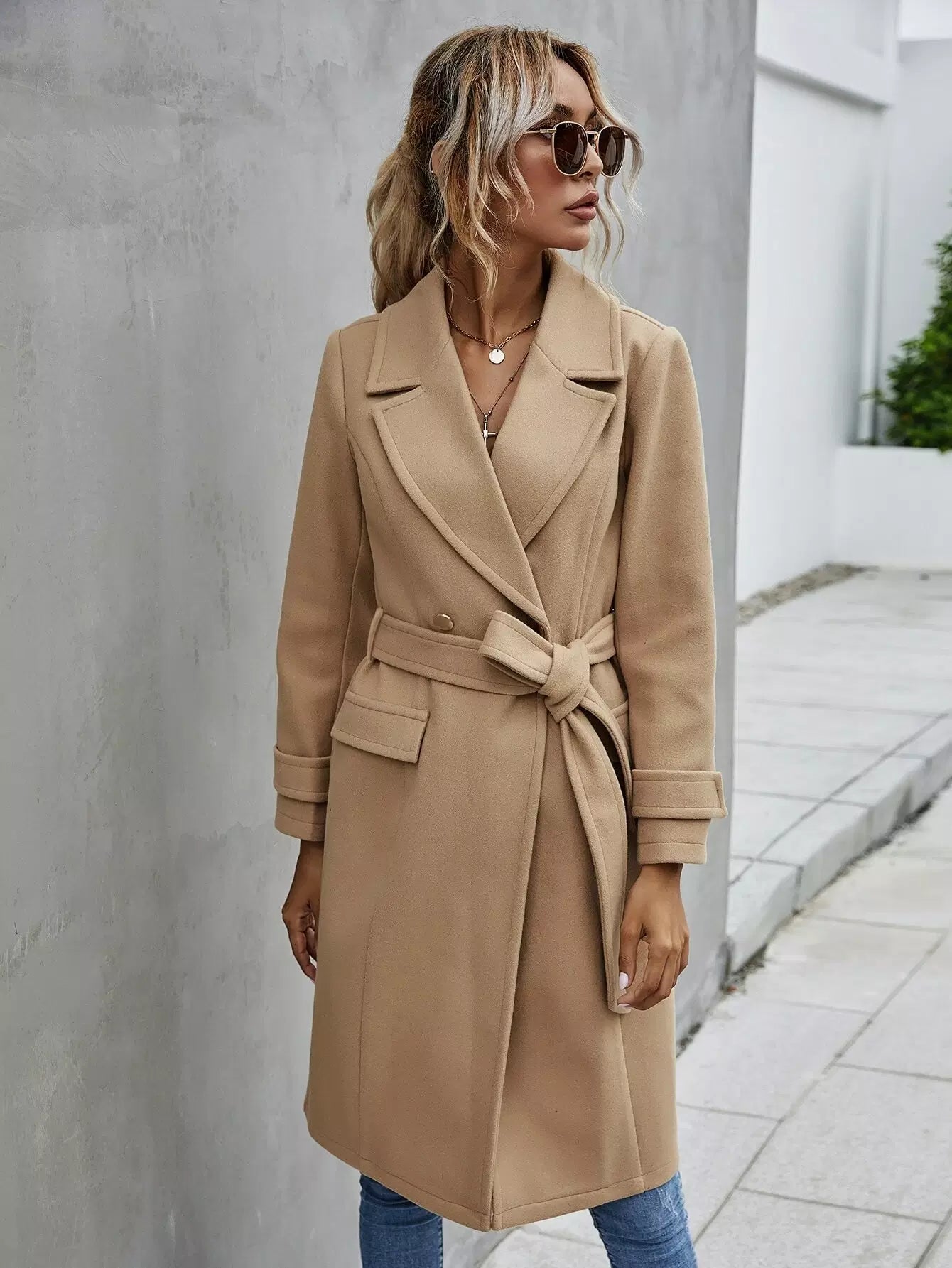 Double Button Lapel Collar Self Tie Overcoat