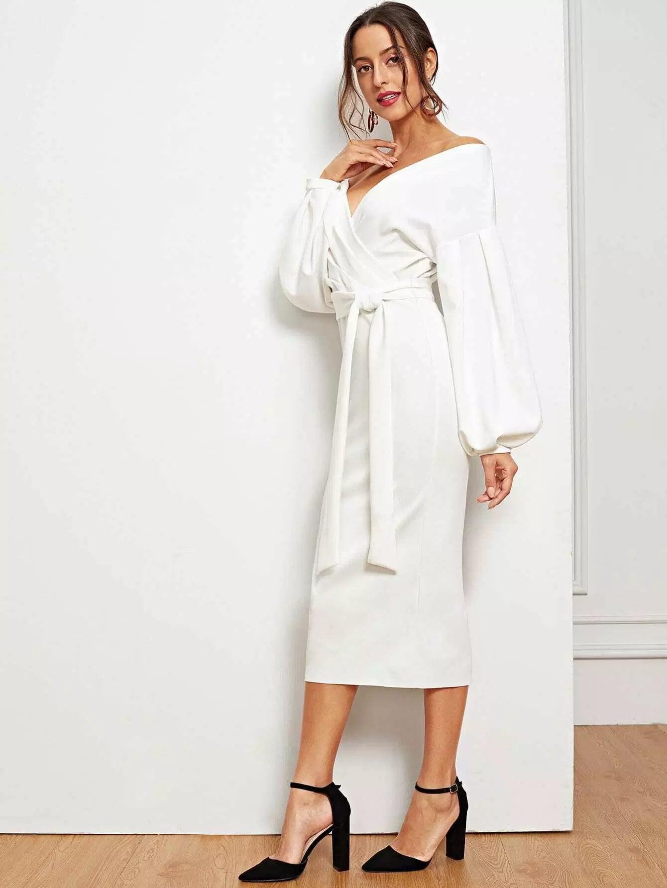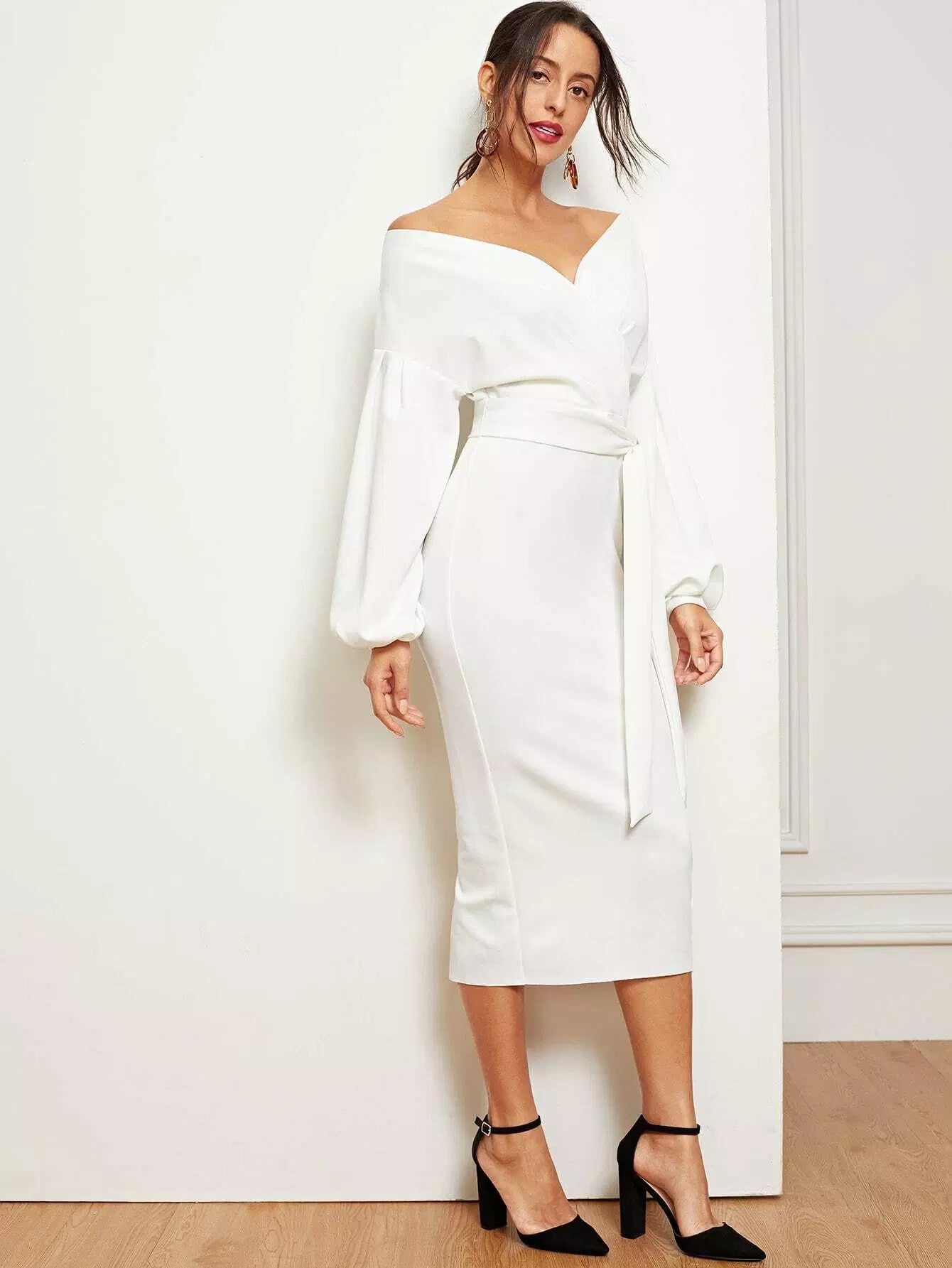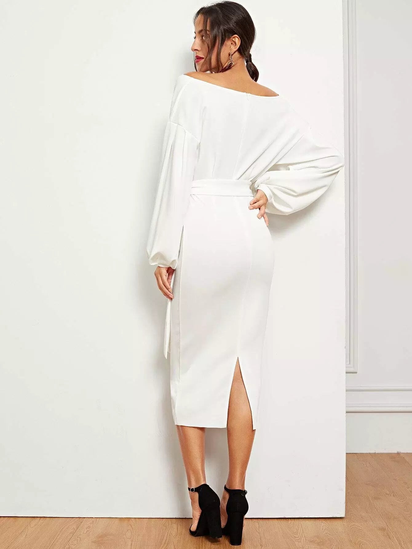 Lantern Sleeve Surplice Wrap Split Hem Bardot Dress