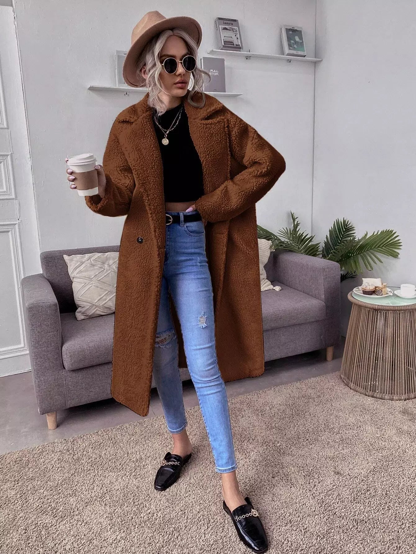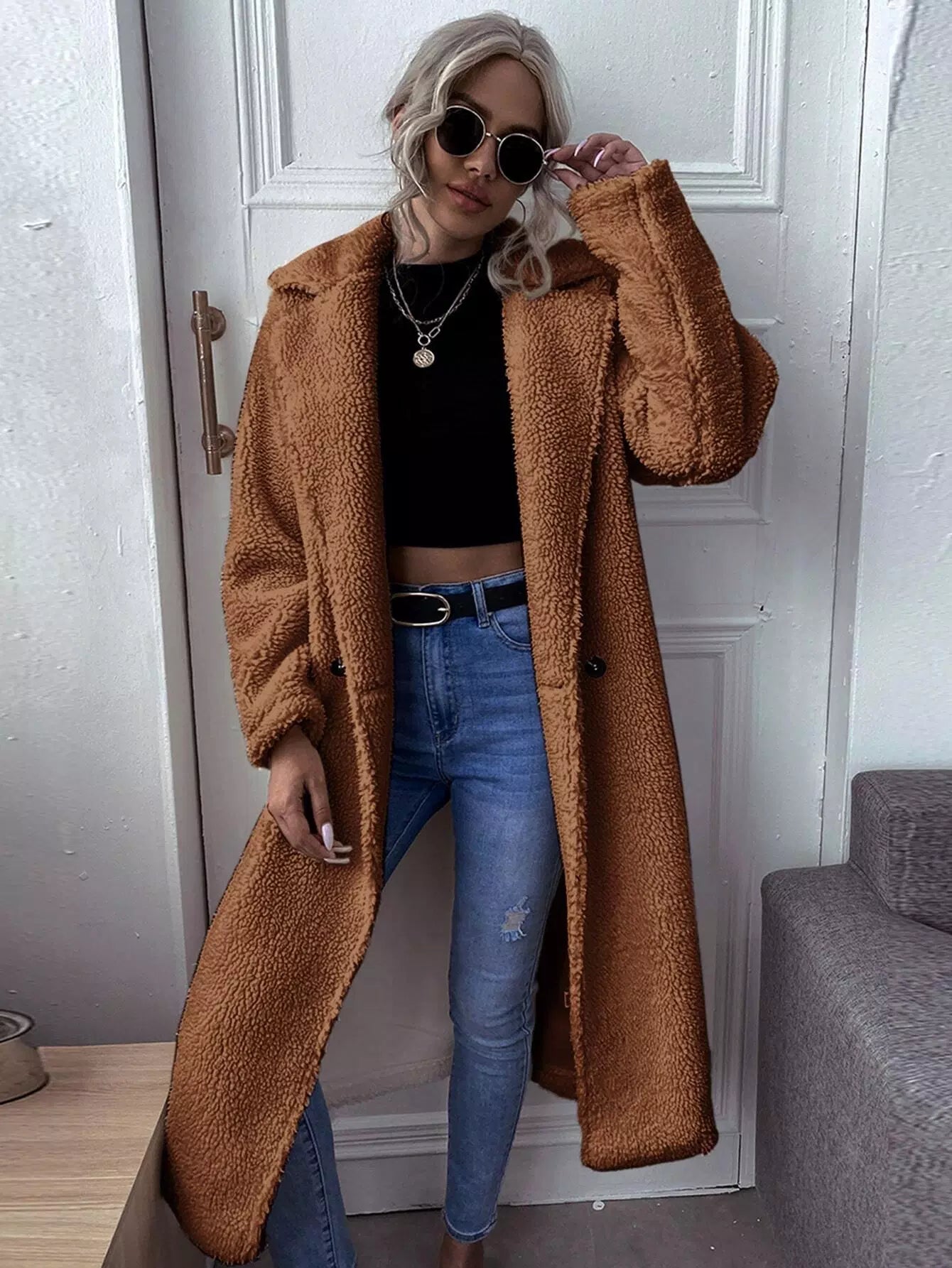 Lapel Collar Double Button Teddy Coat