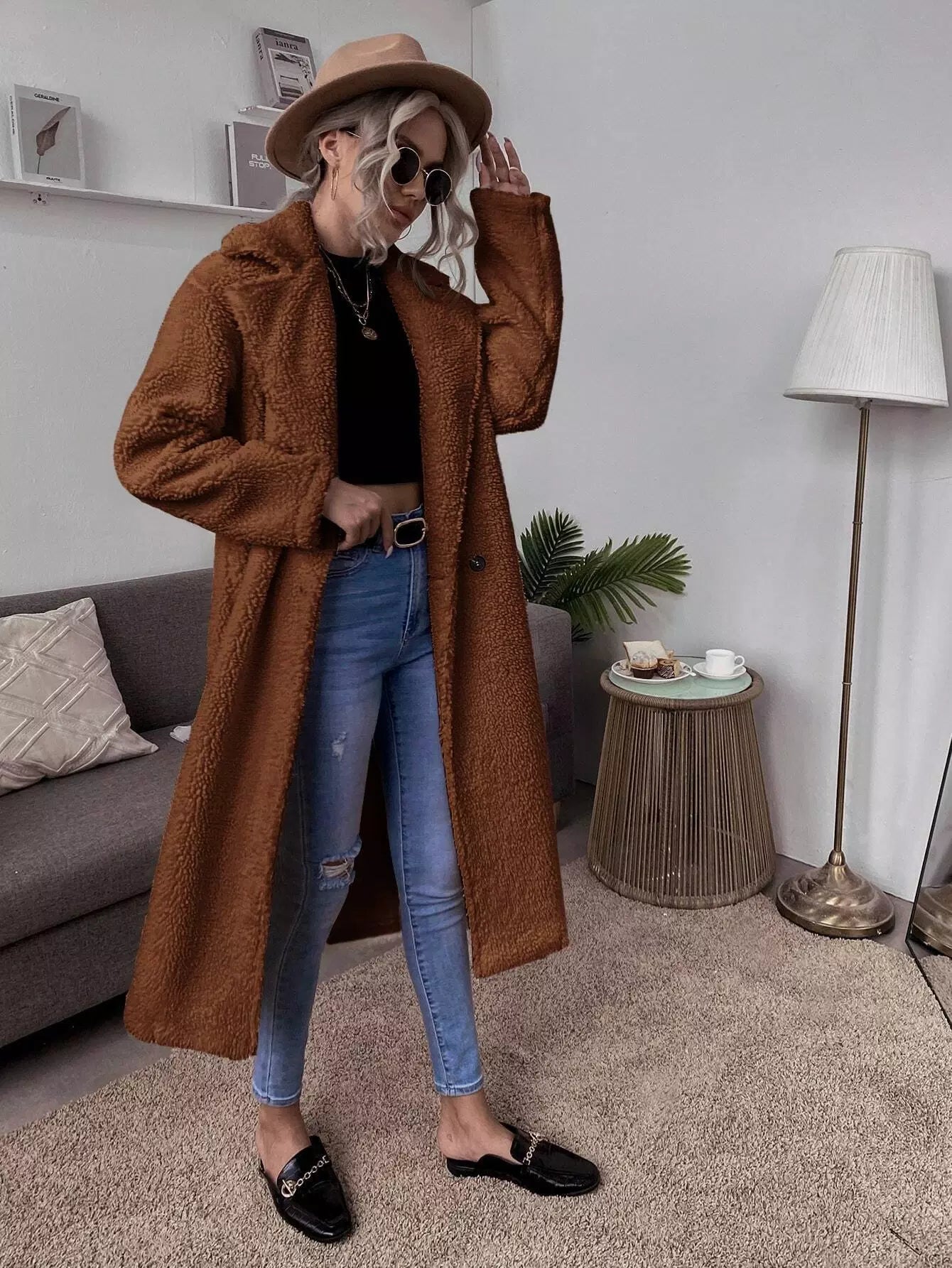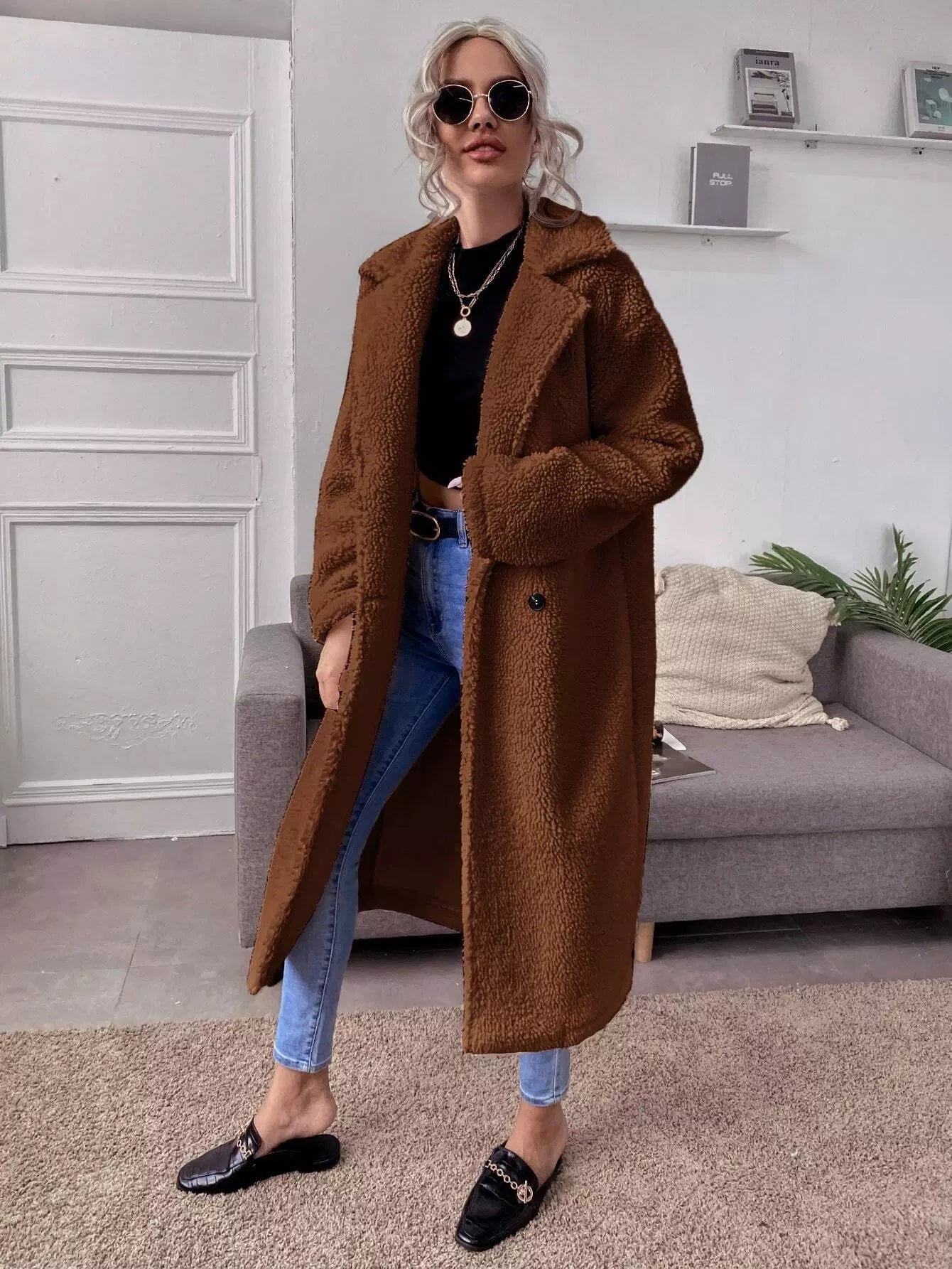 Women - Lapel Collar Double Button Teddy Coat