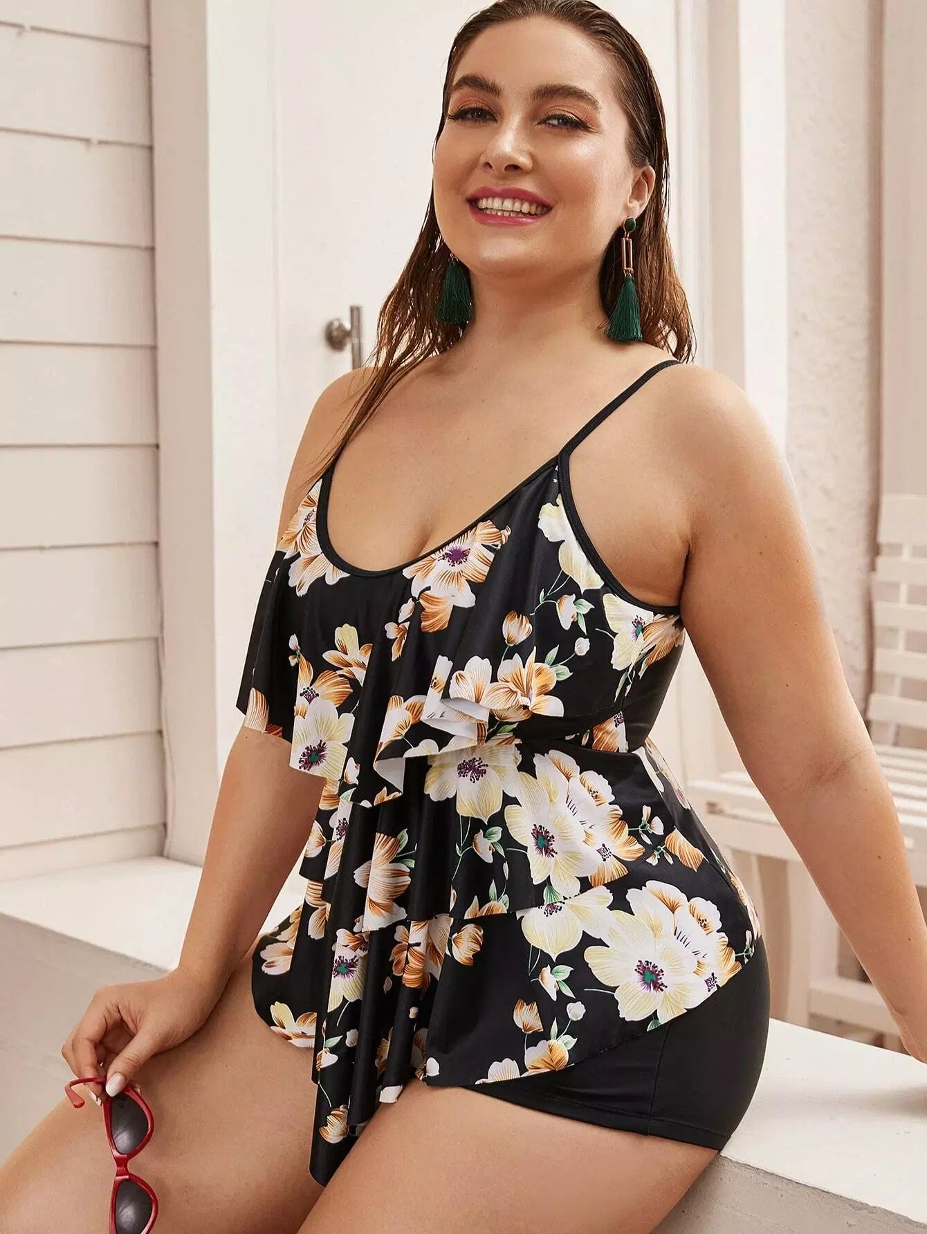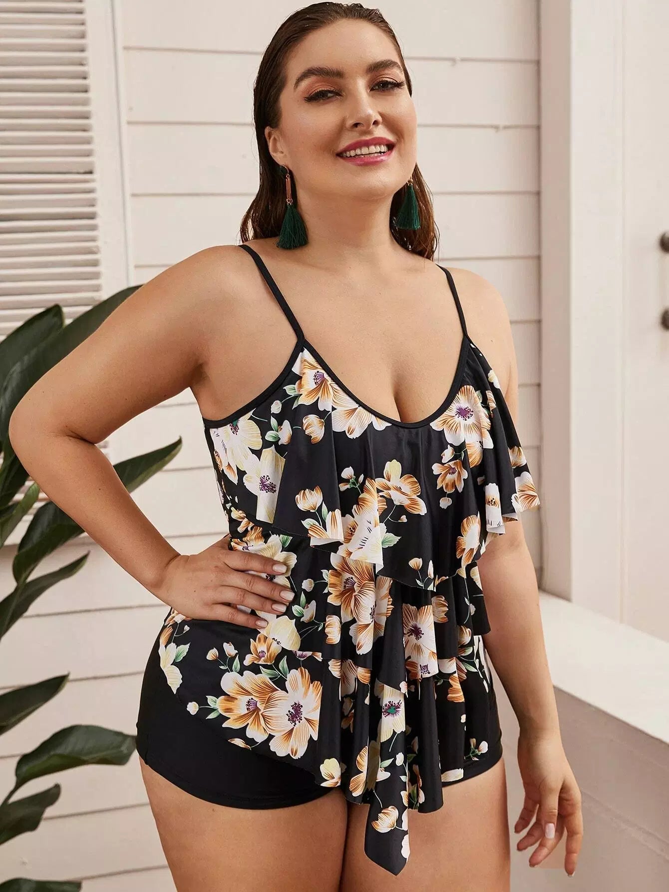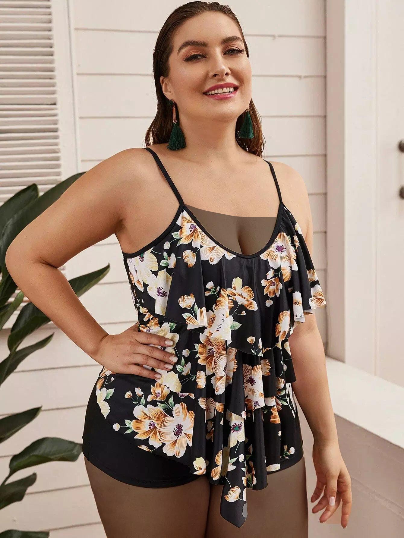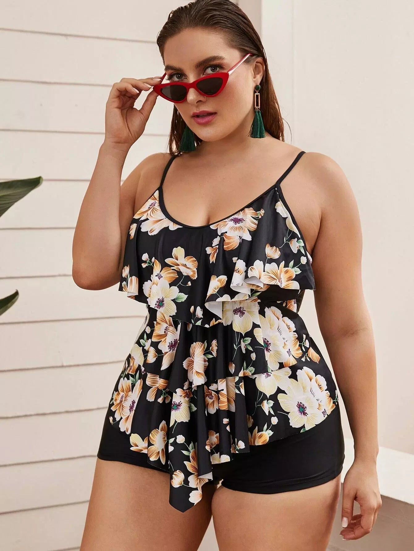 Women - Plus Floral Random Print Tiered Layer Top With Shorts Tankini