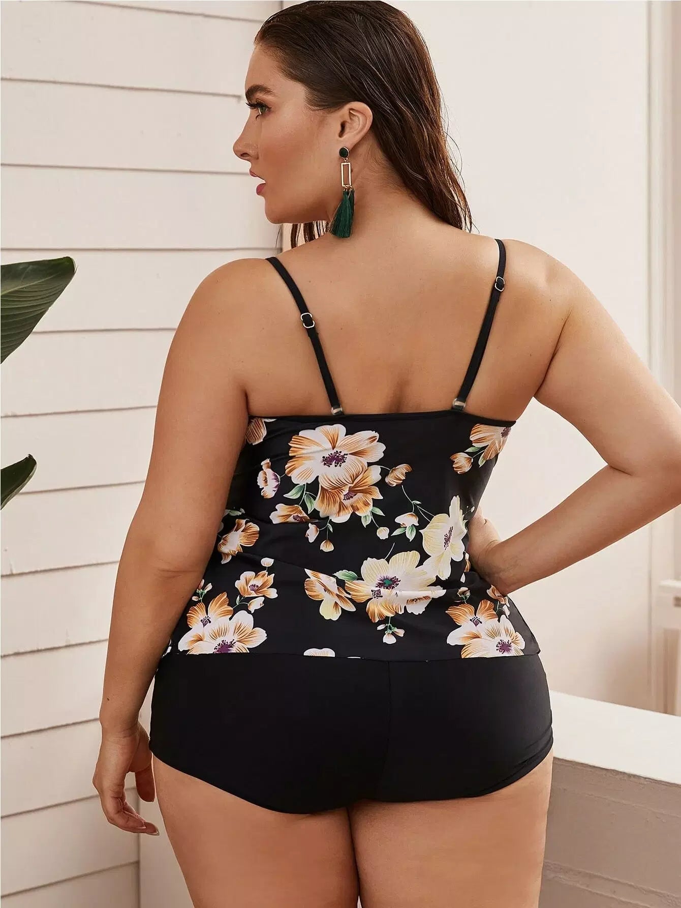 Plus Floral Random Print Tiered Layer Top With Shorts Tankini