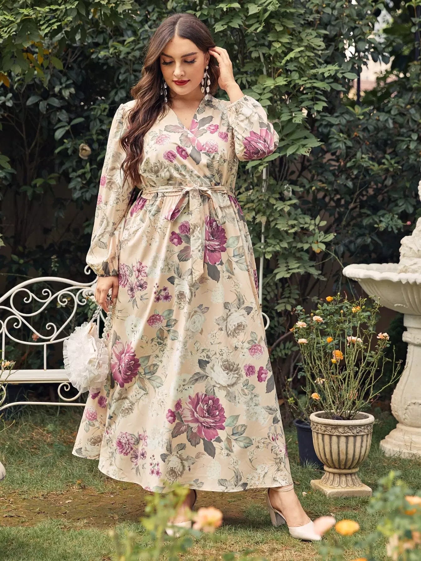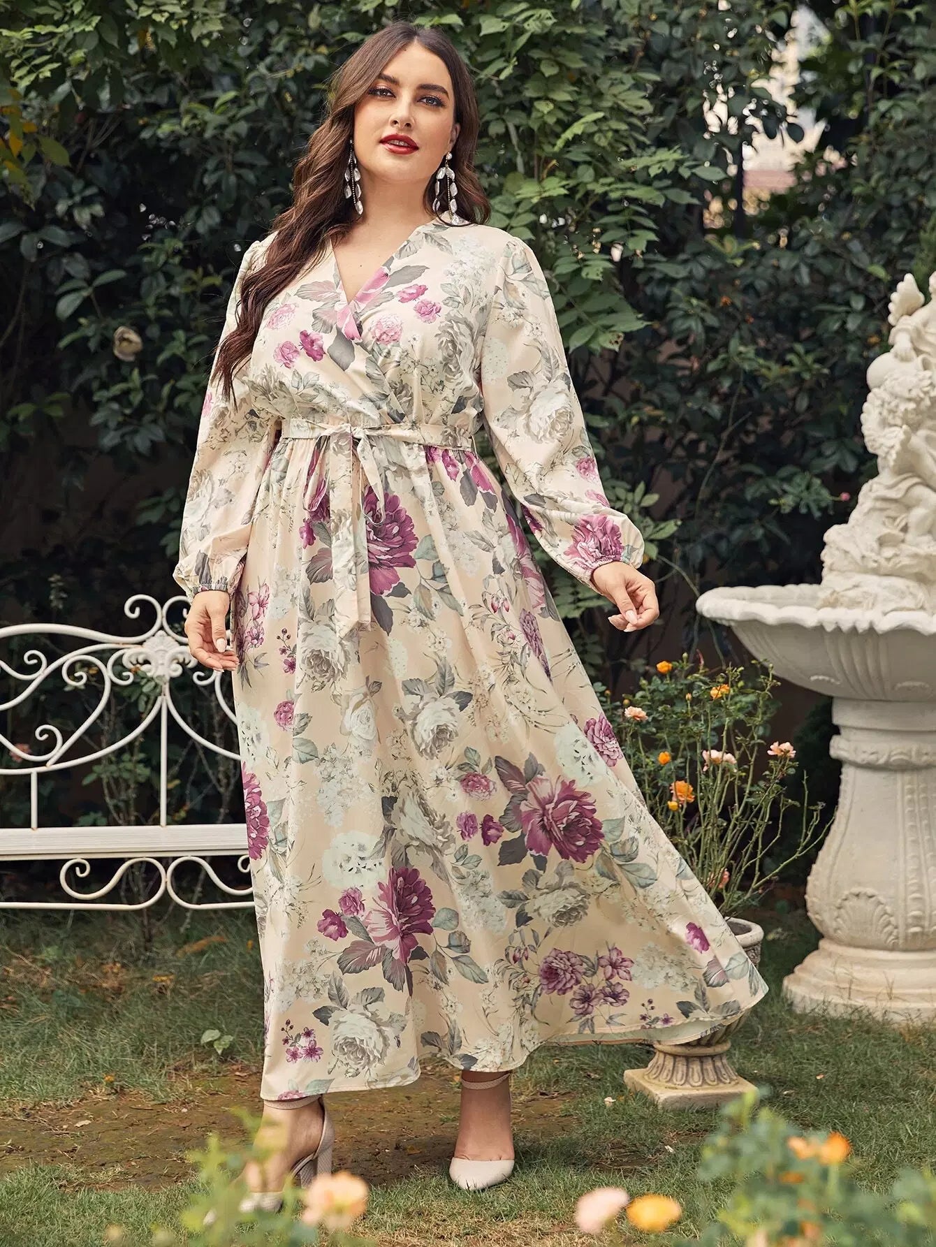 Women - Plus Surplice Front Floral Print Belted A-line Dress