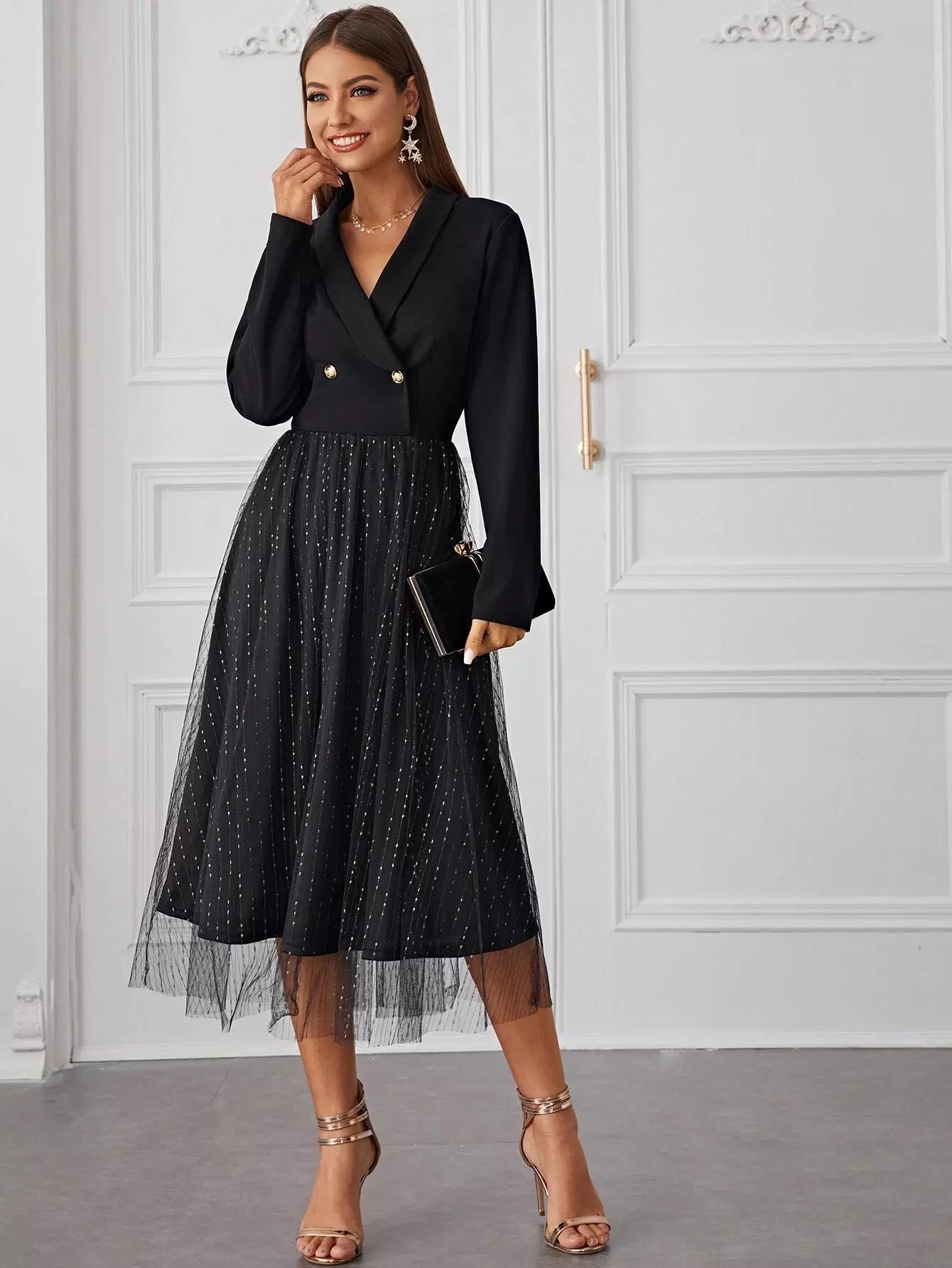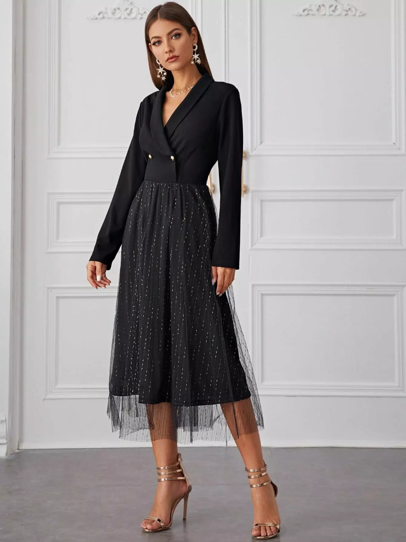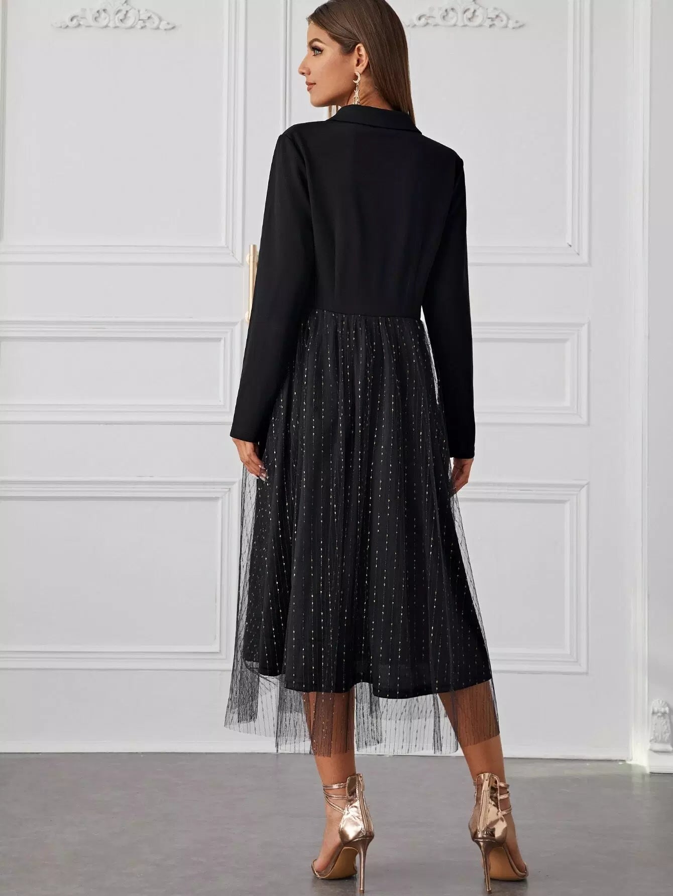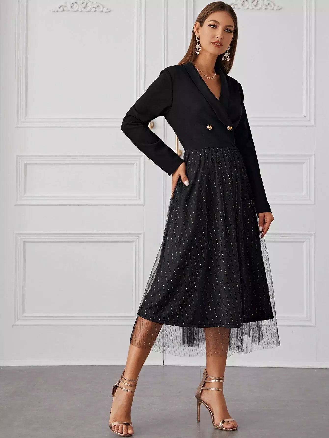 Shawl Collar Double Breasted Glitter Mesh Overlay Dress
