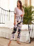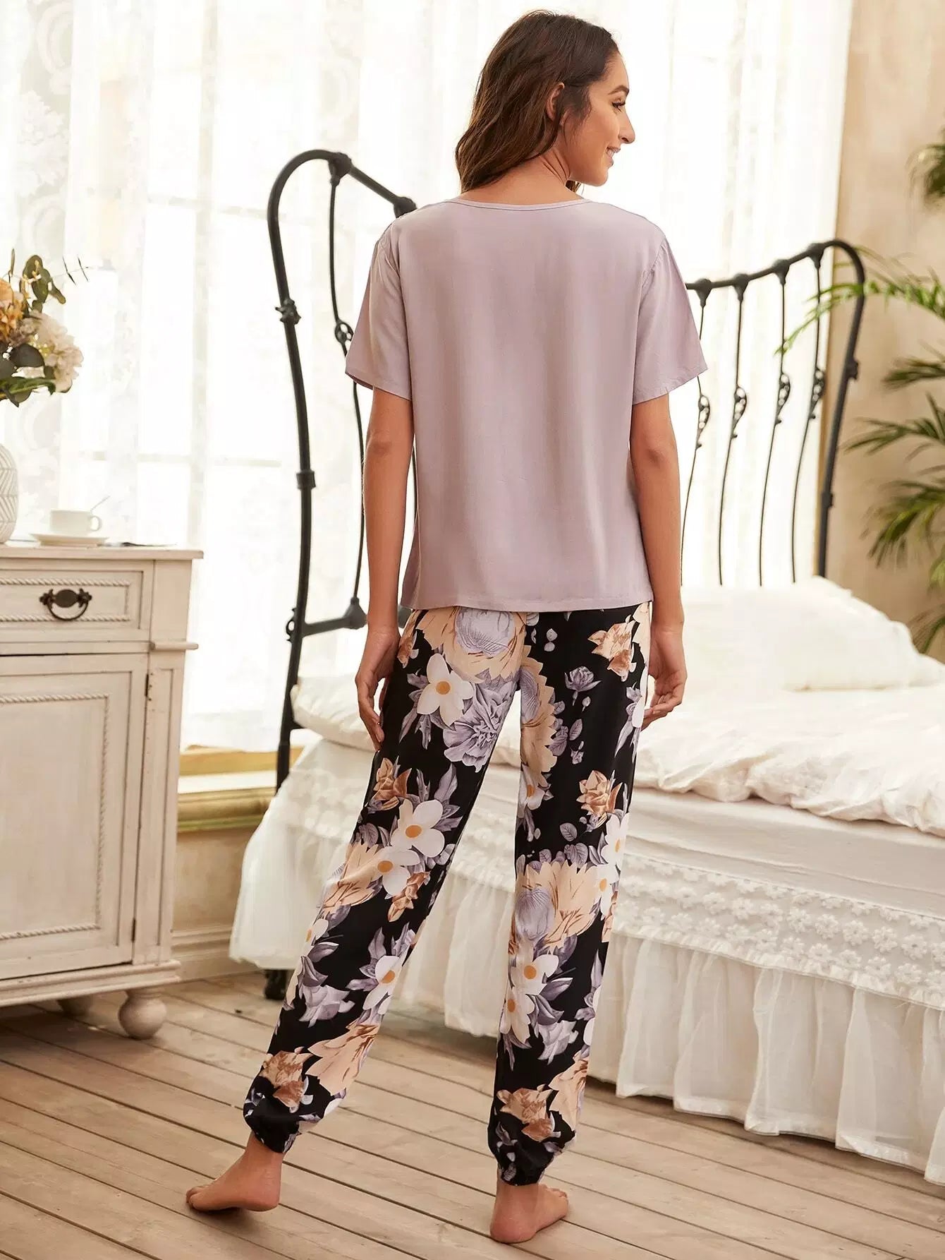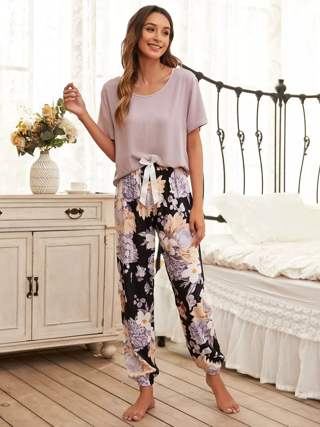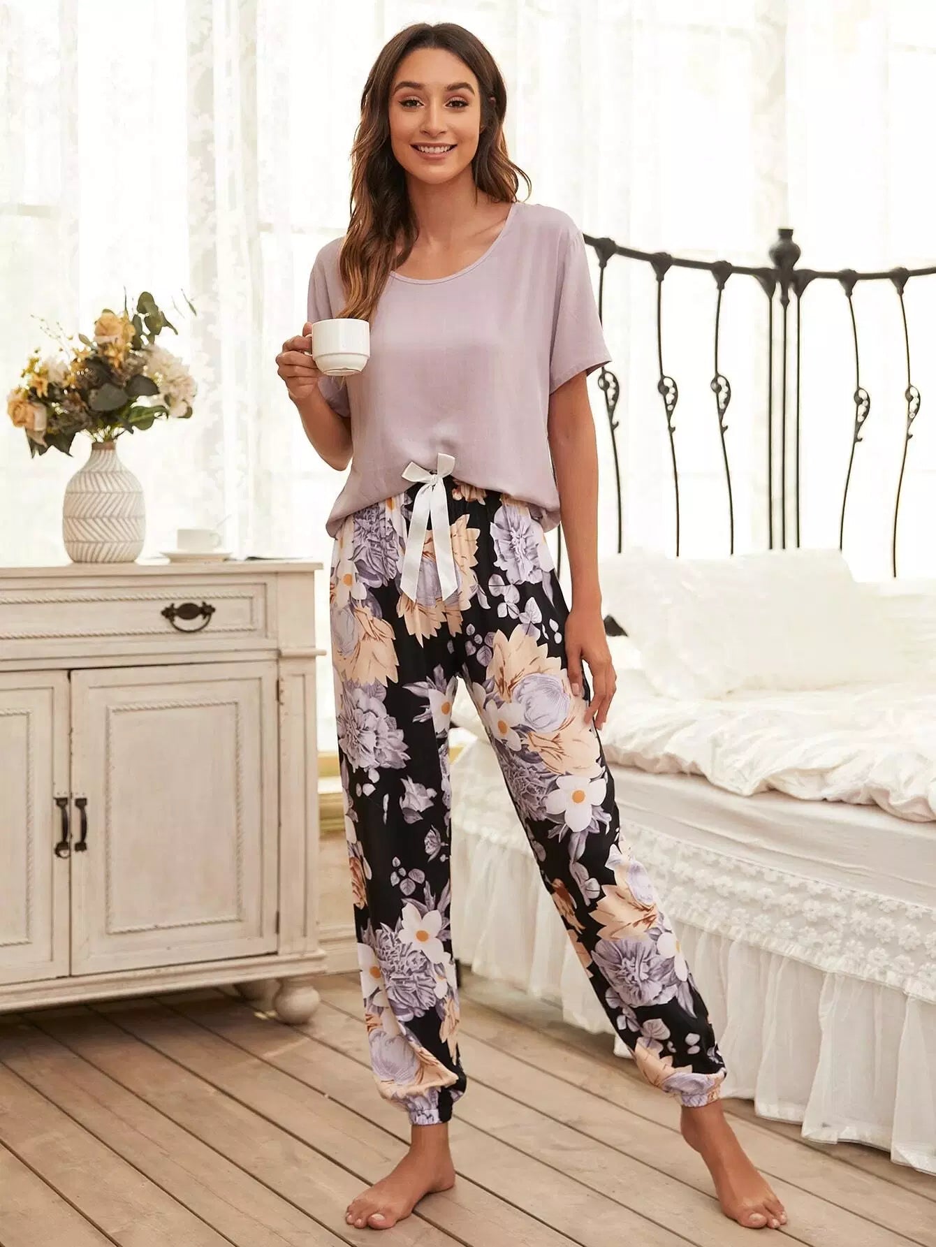 Women - Solid Tee & Bow Front Floral Pants PJ Set