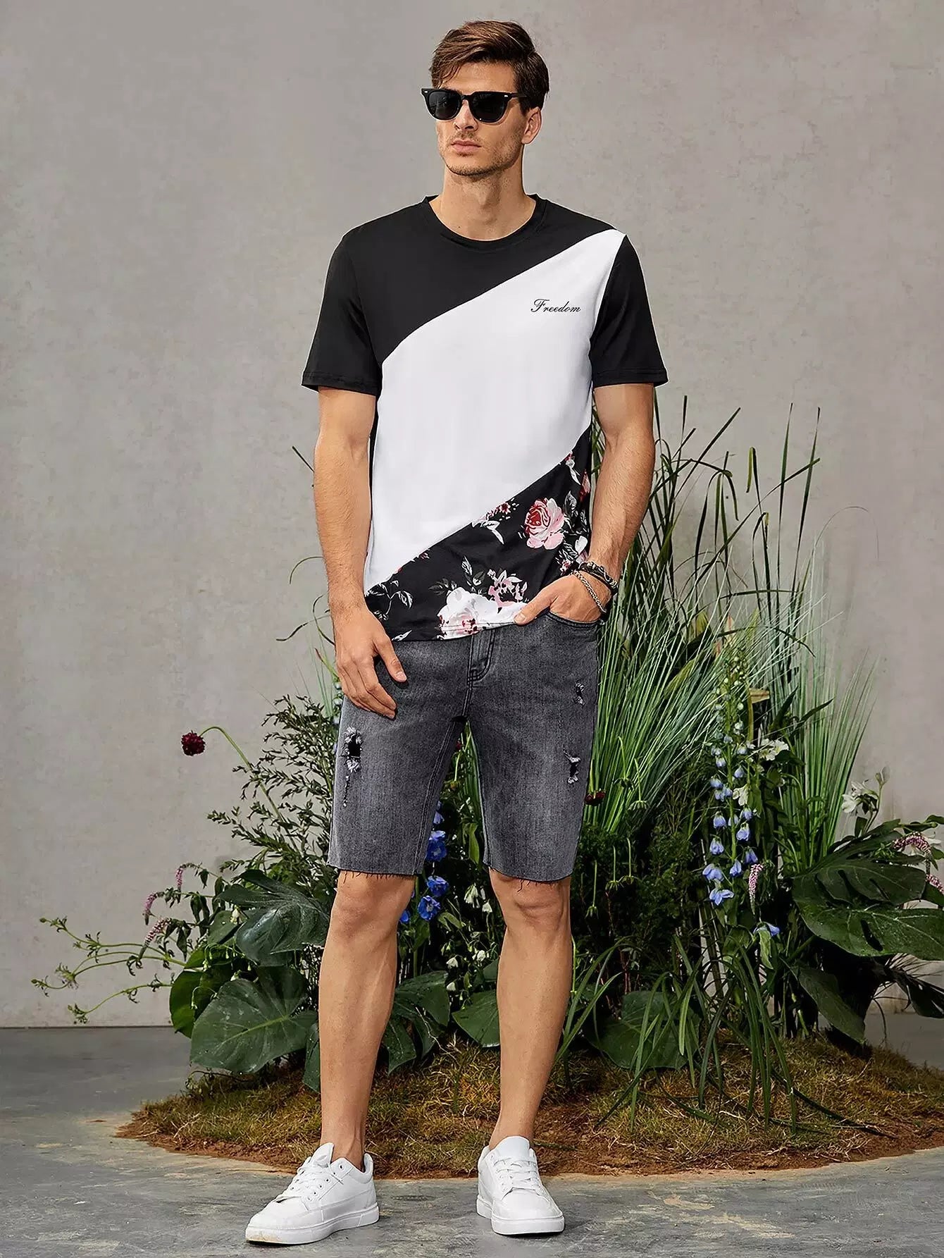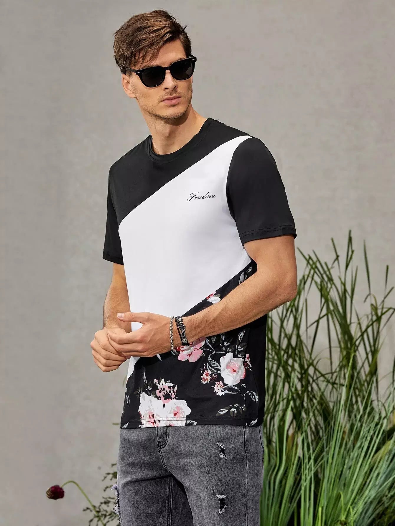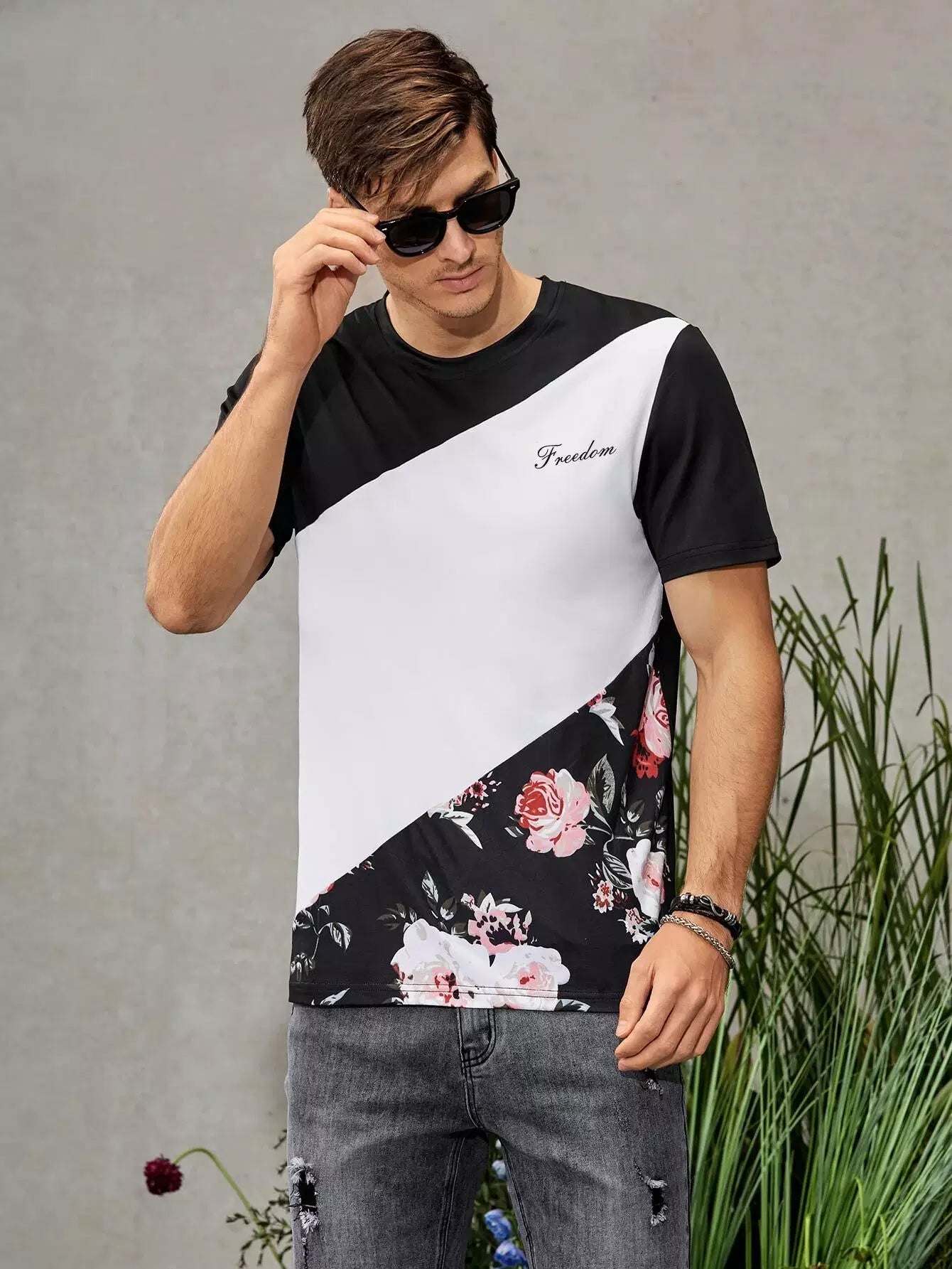 Men Color Block Letter & Floral Print Tee