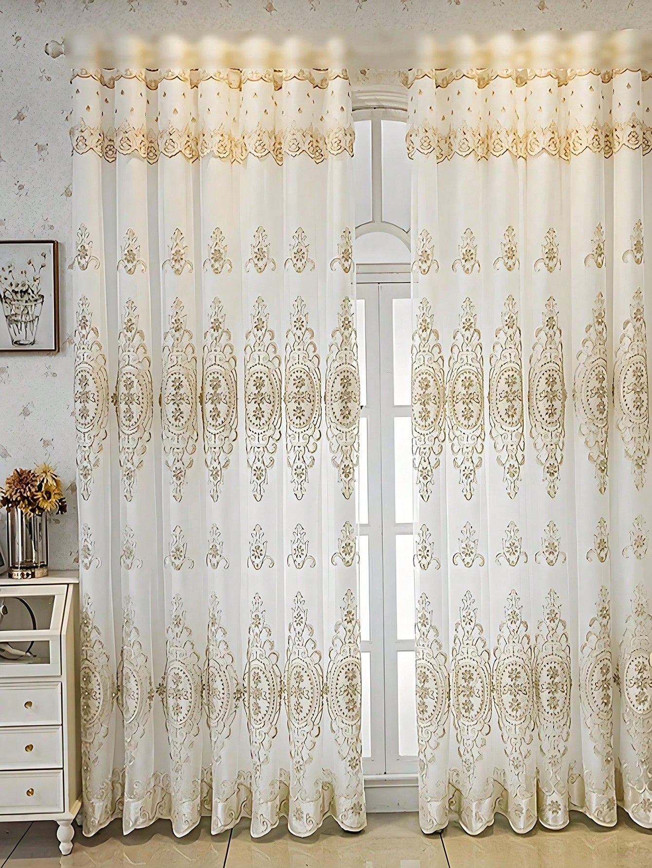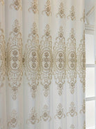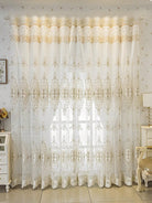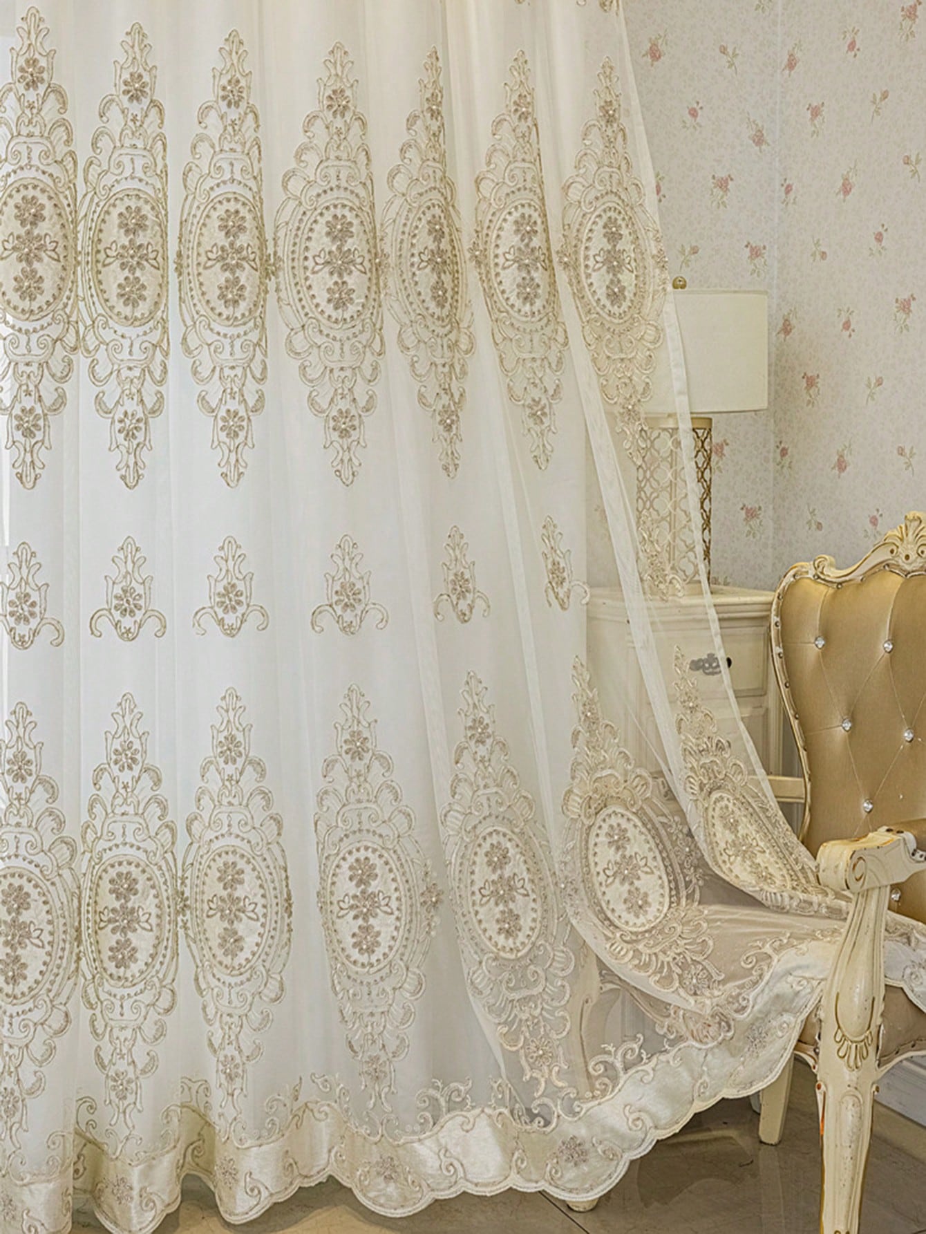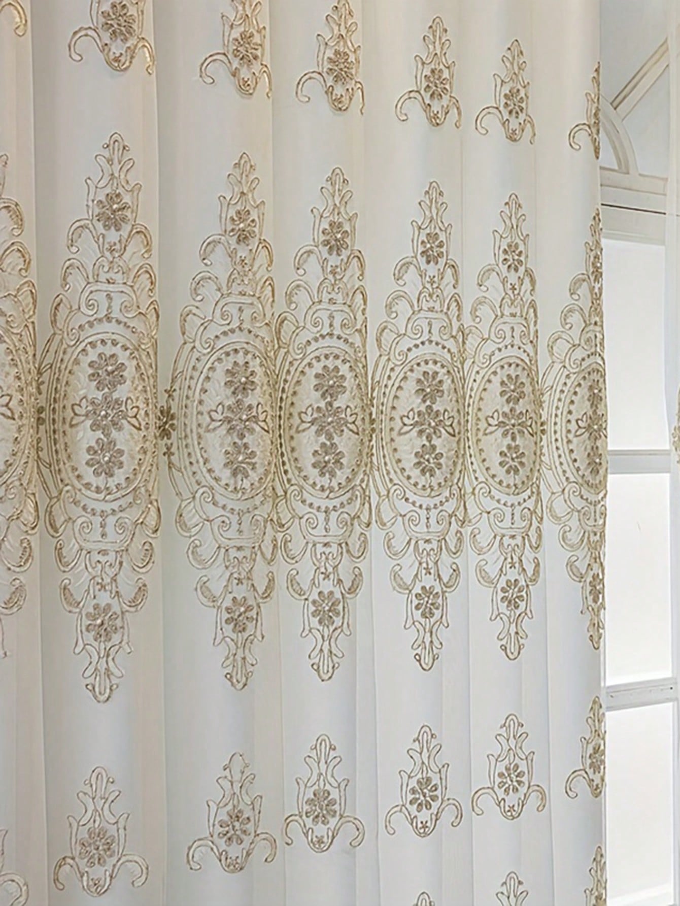 1pc Beige Bead Decor Semi-Sheer Curtain - Embroidered Voile