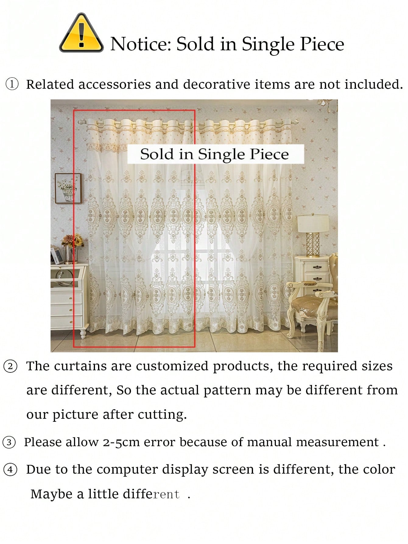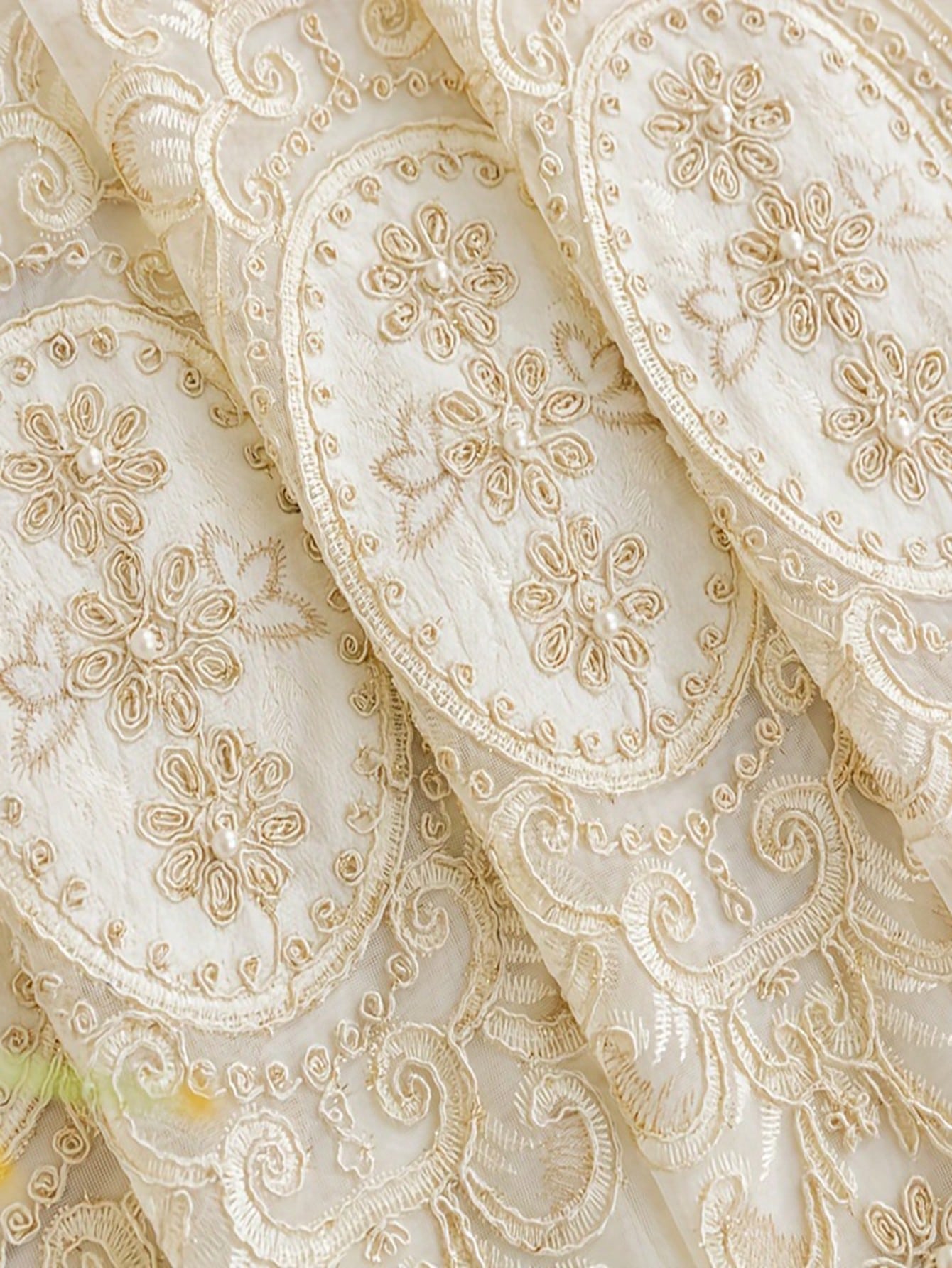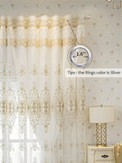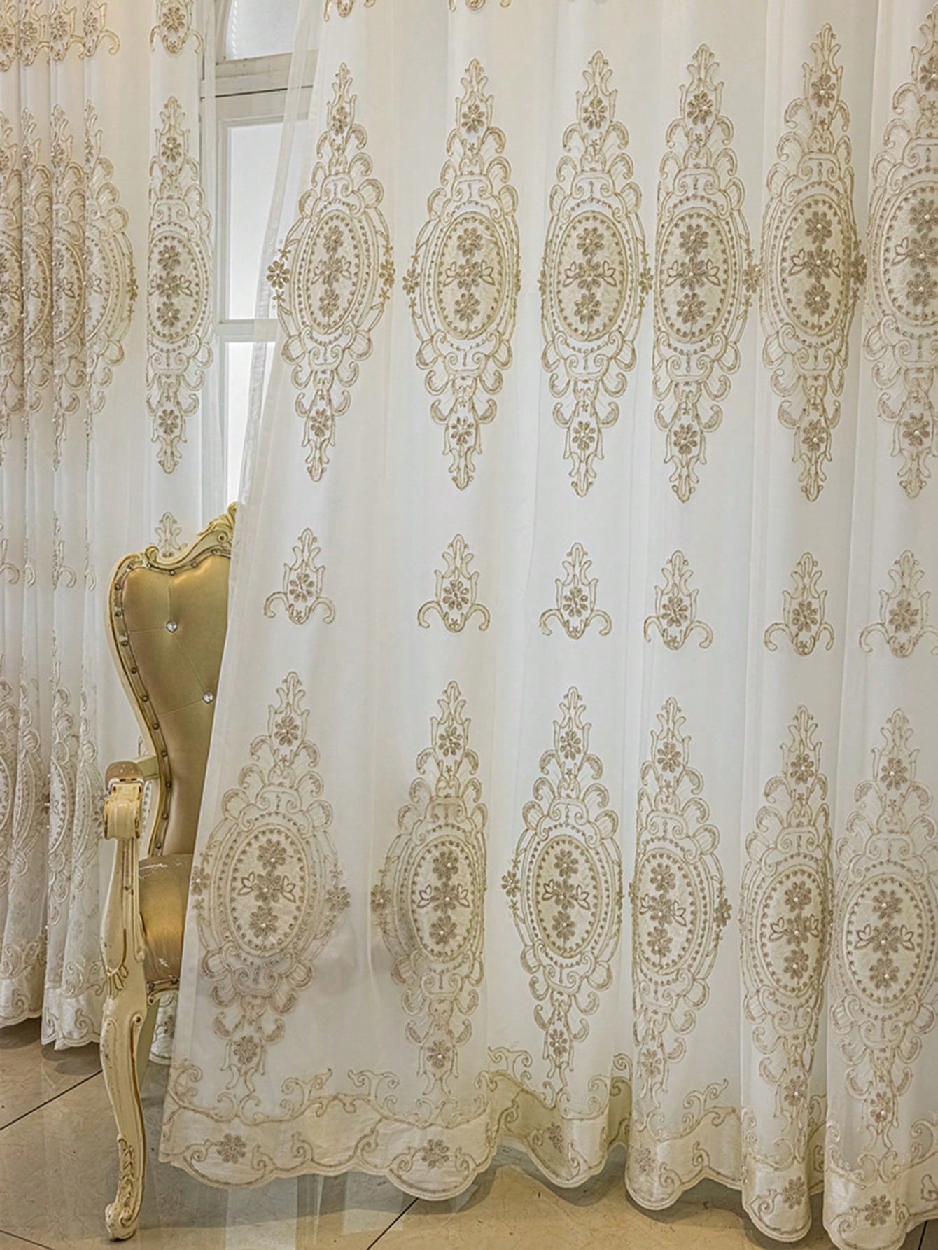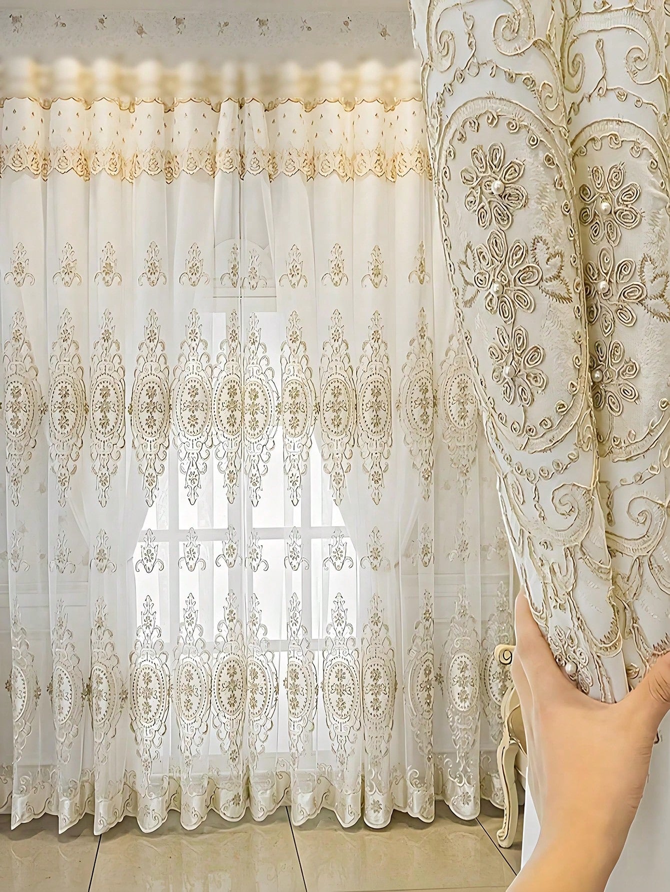 1pc Beige Bead Decor Semi-Sheer Curtain - Embroidered Voile