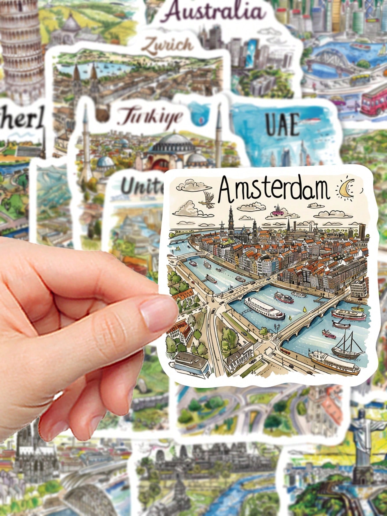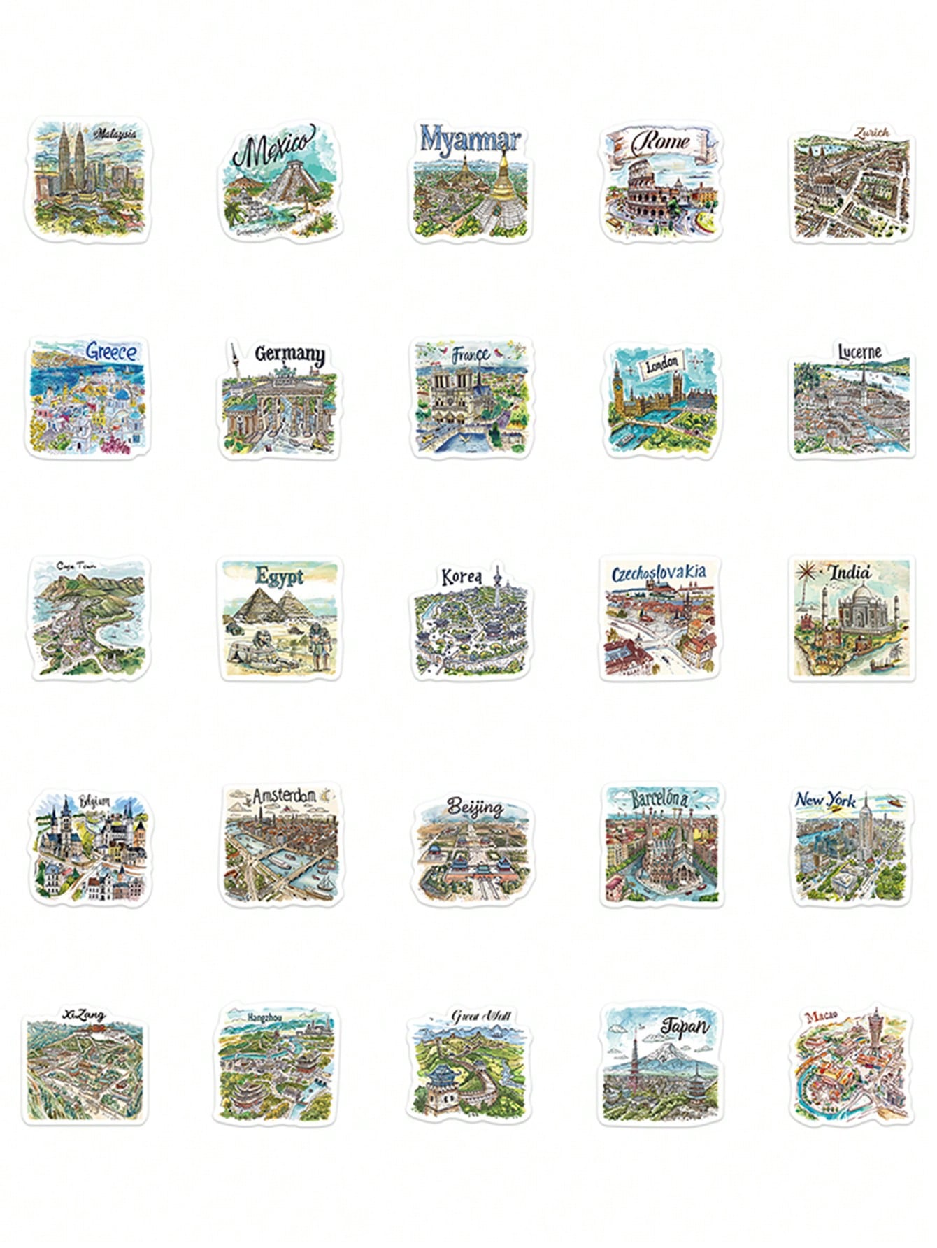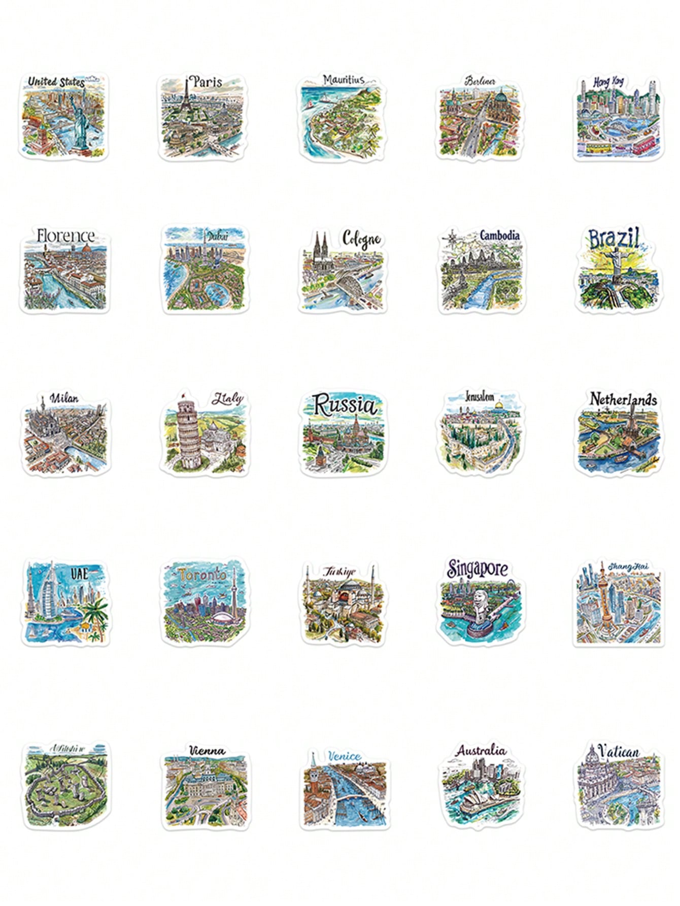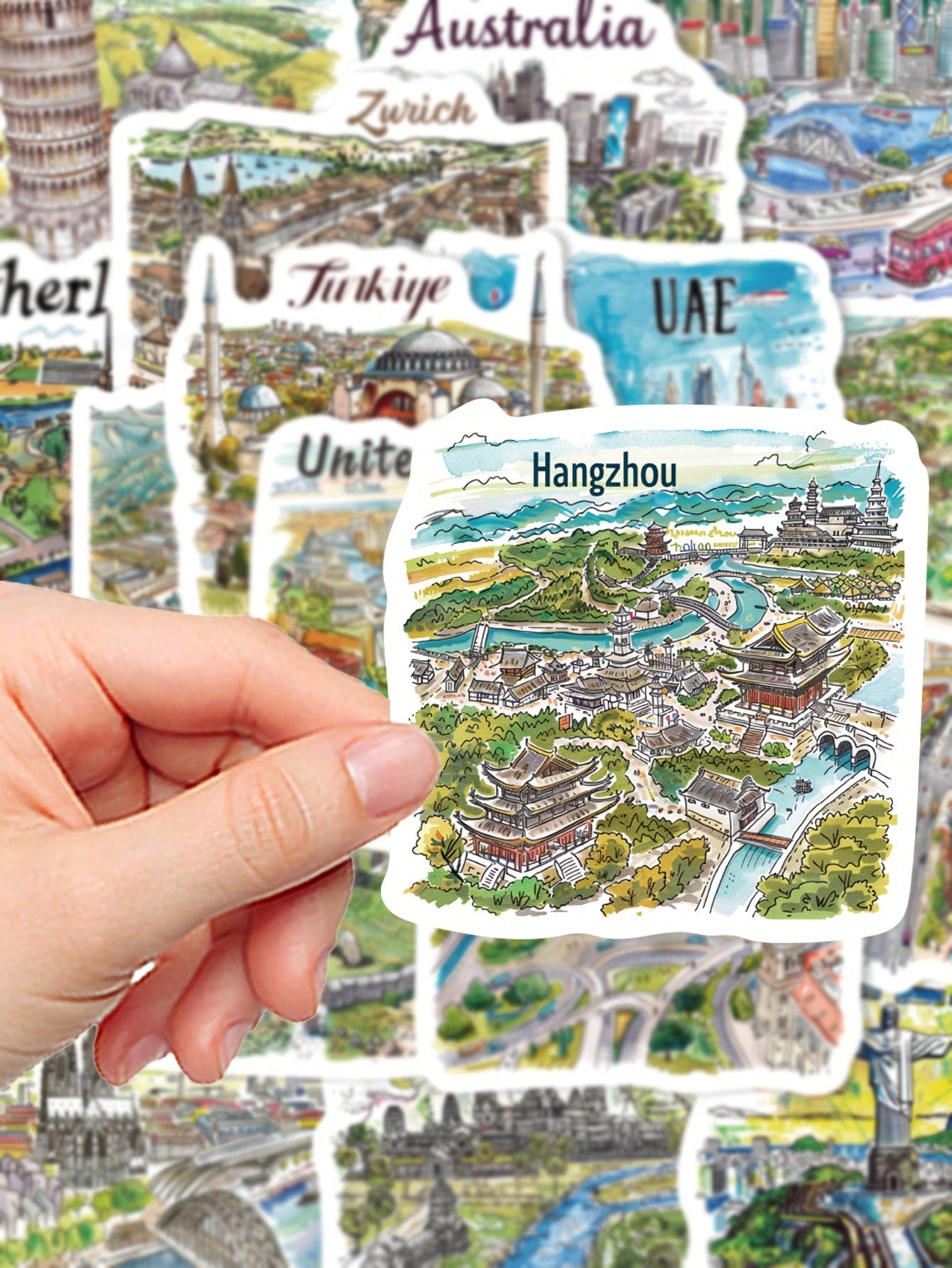 50pcs Handpainted Travel Map Stickers Cartoon City Style High-Quality DIY For Phone Case Waterproof