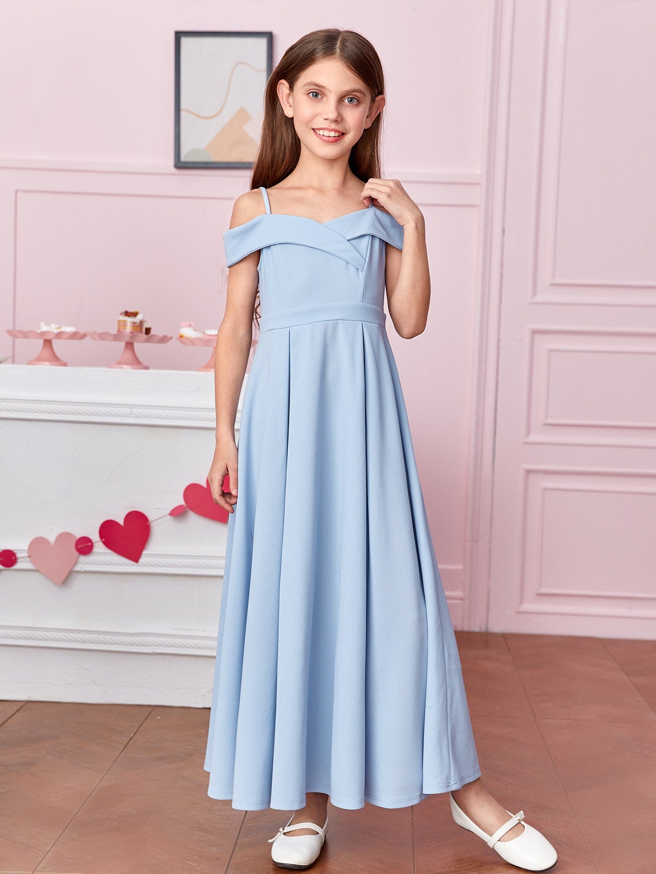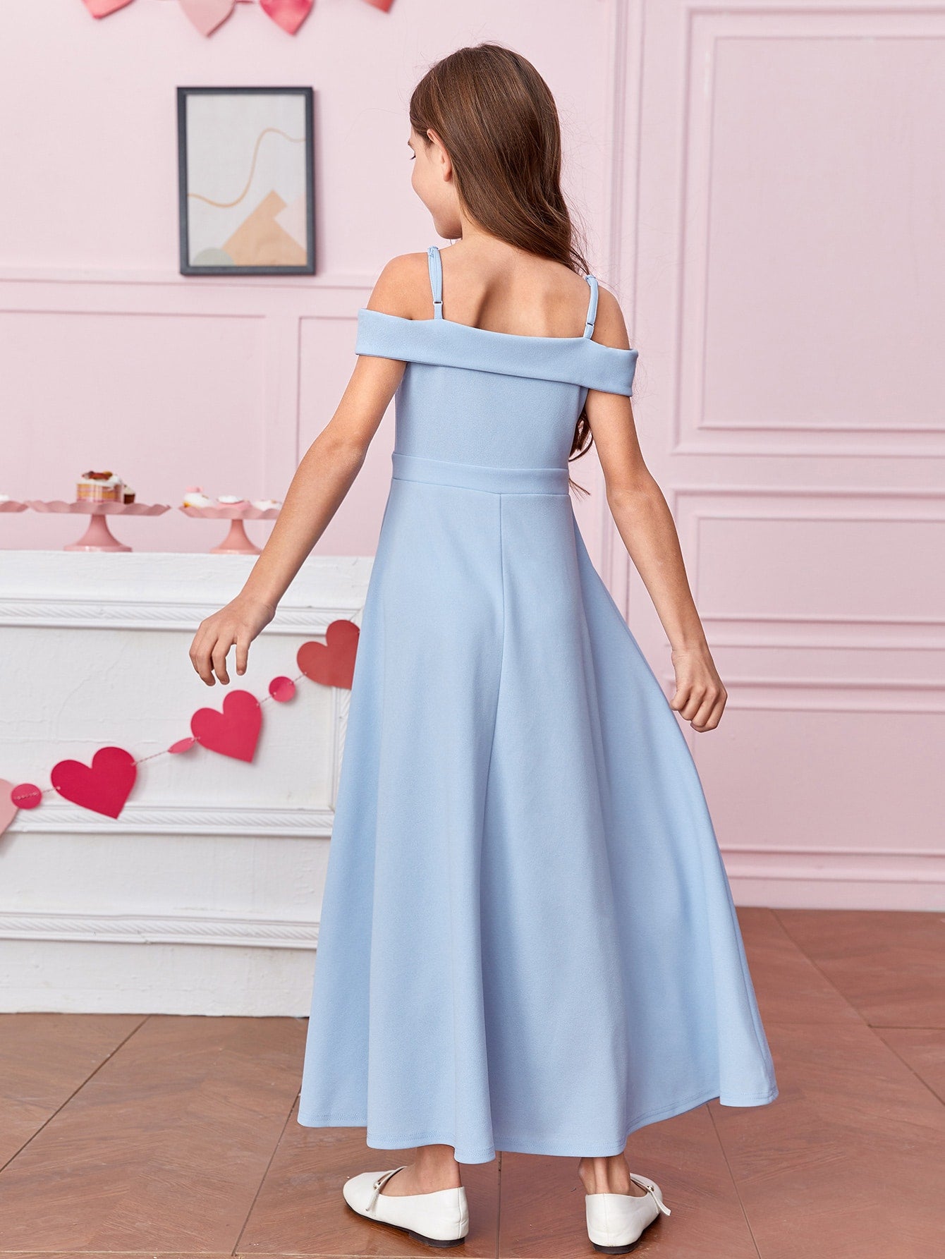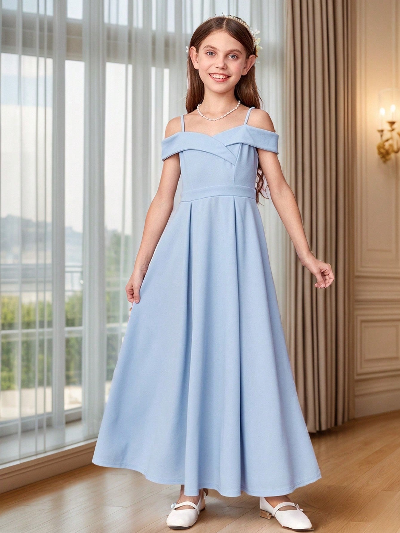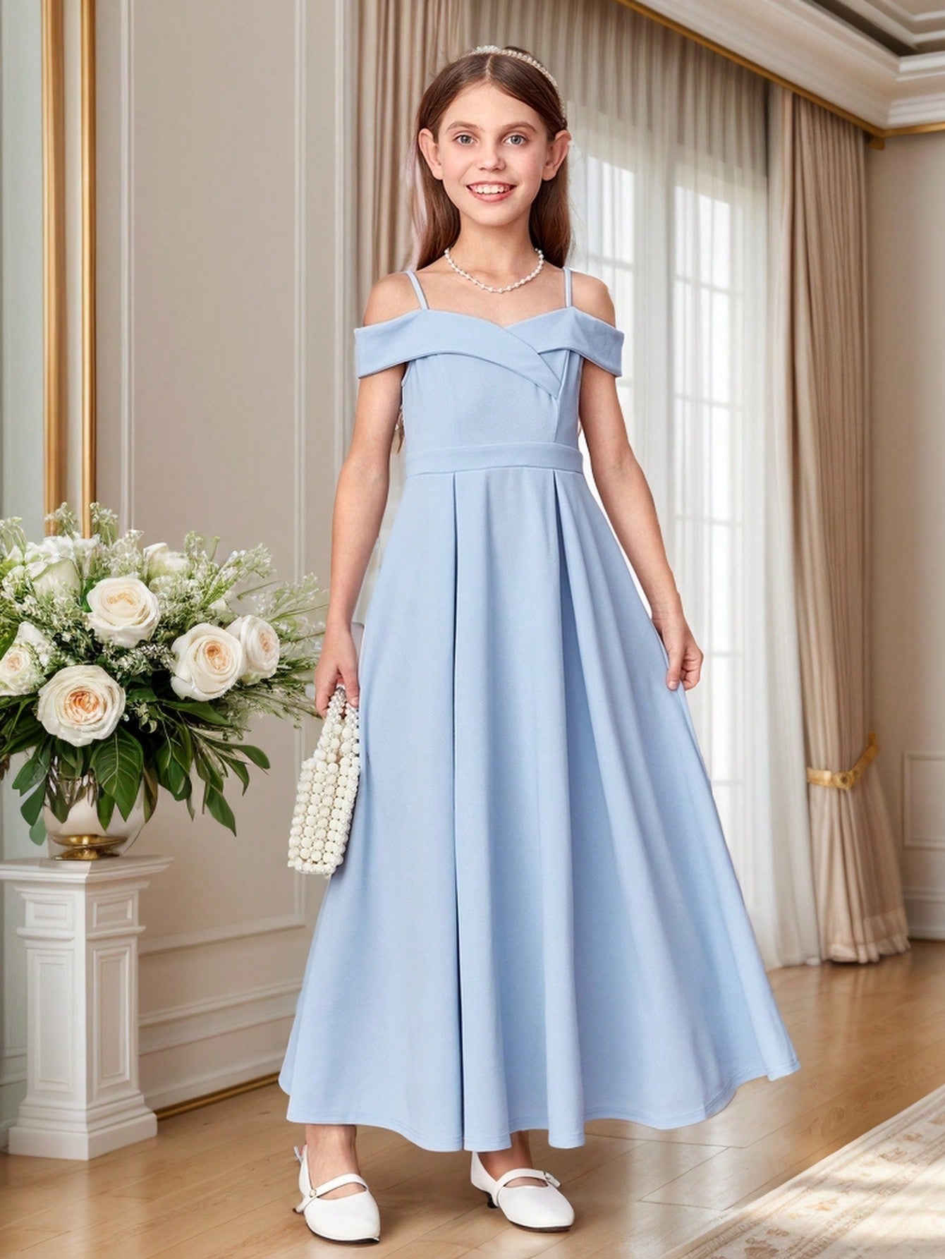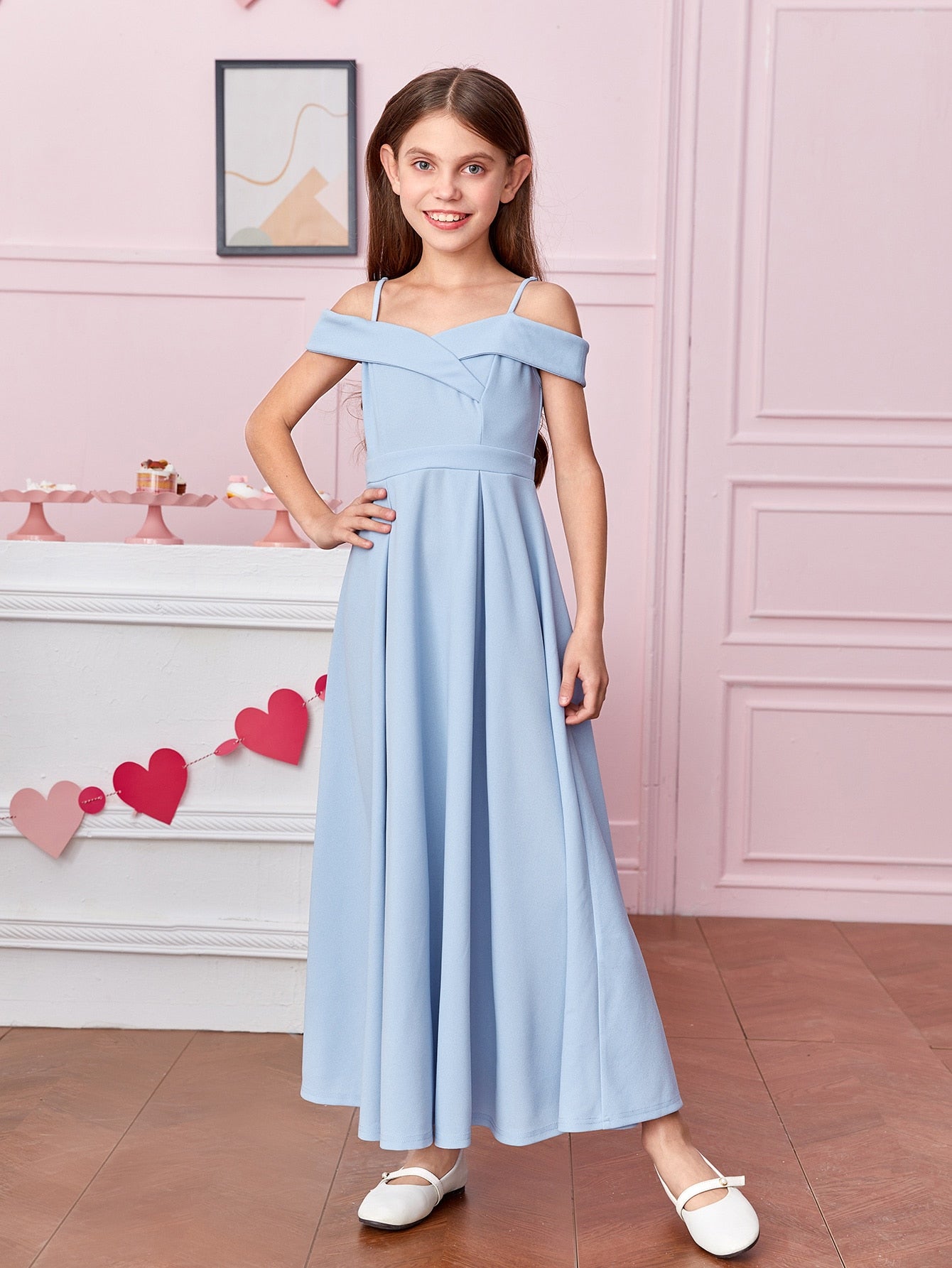 1pc Tween Girls' Solid Color Fitted Ruched Shoulder Sweet Knit Dress