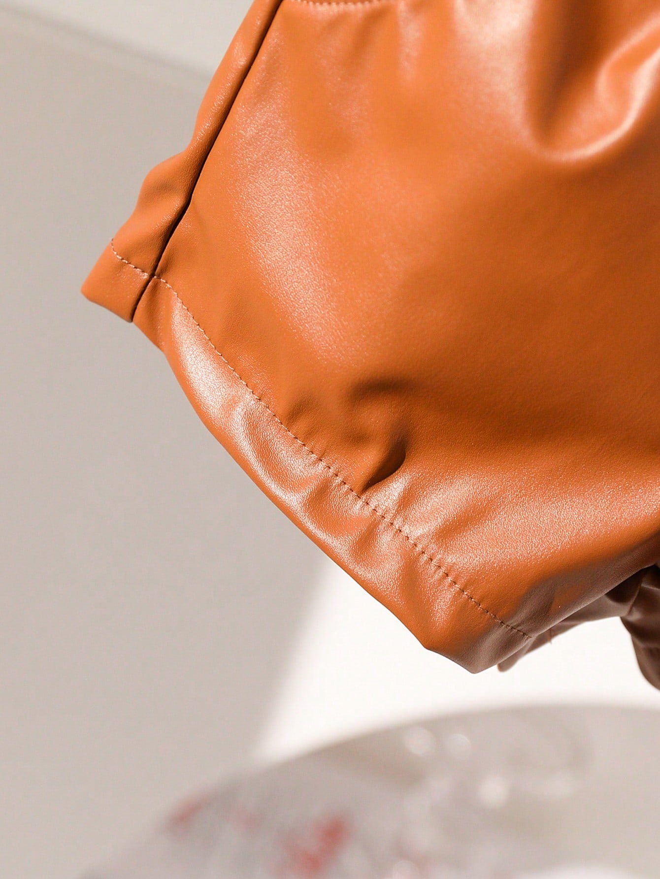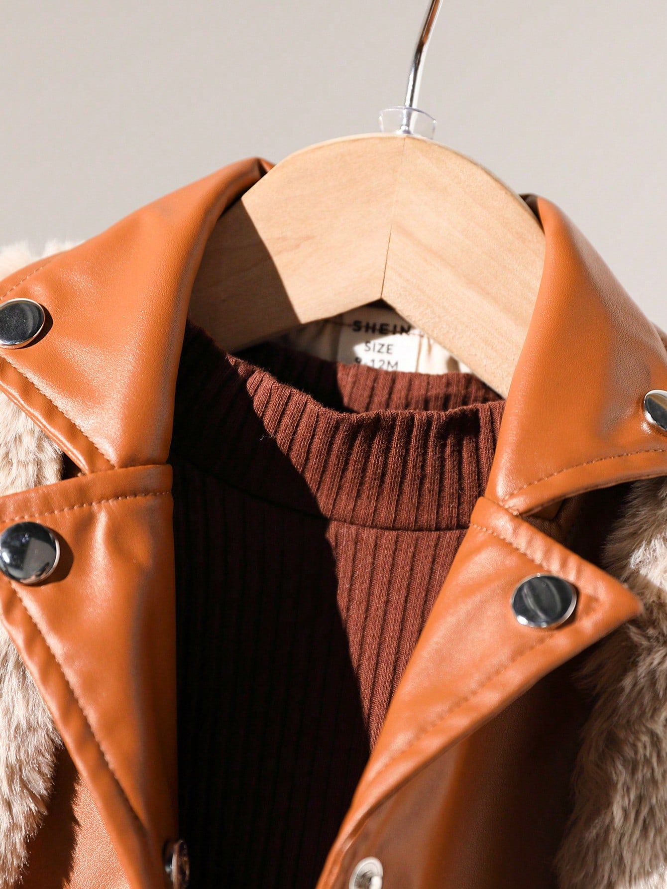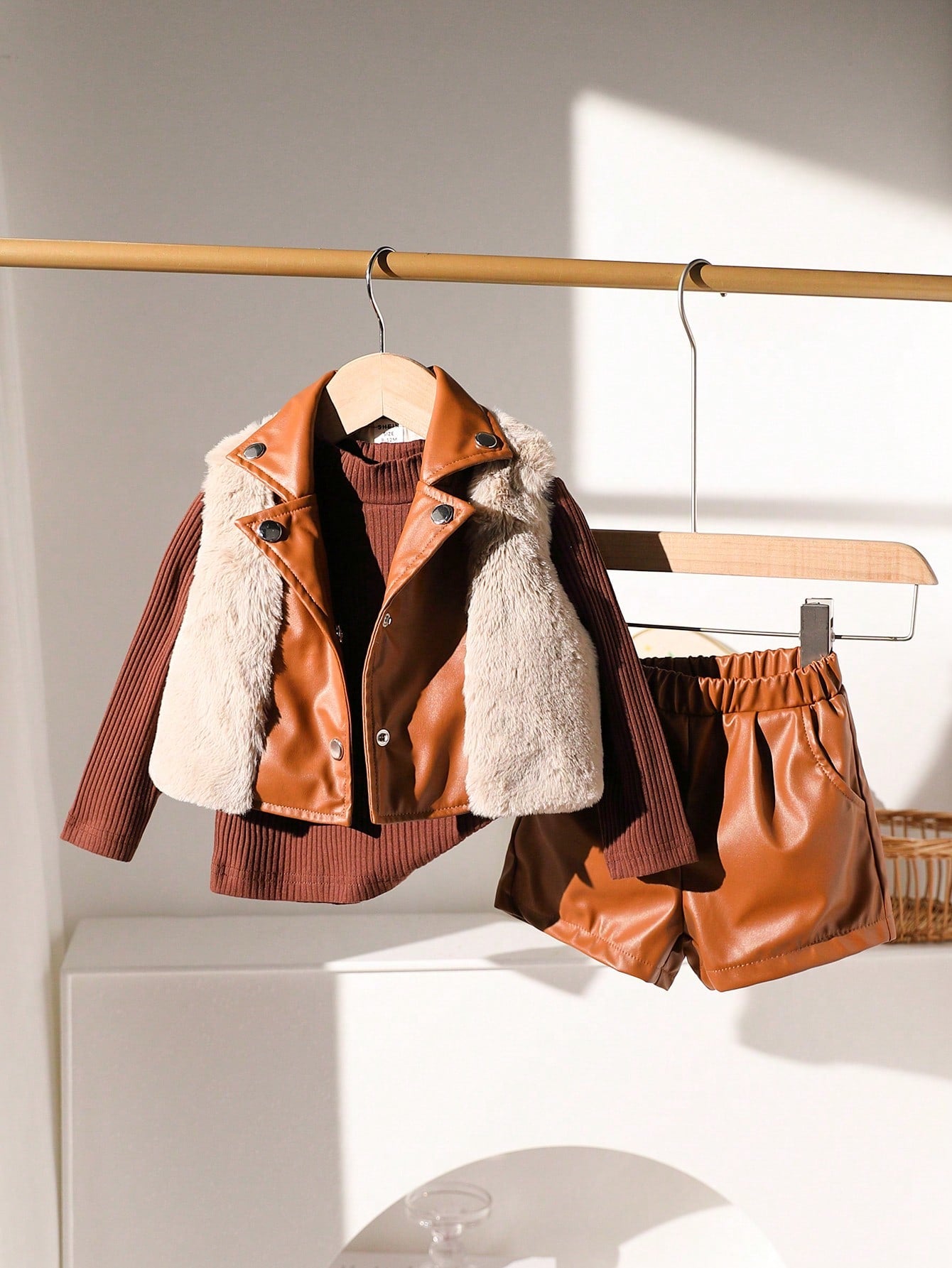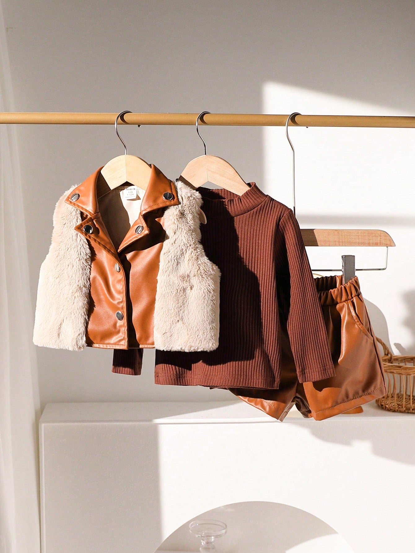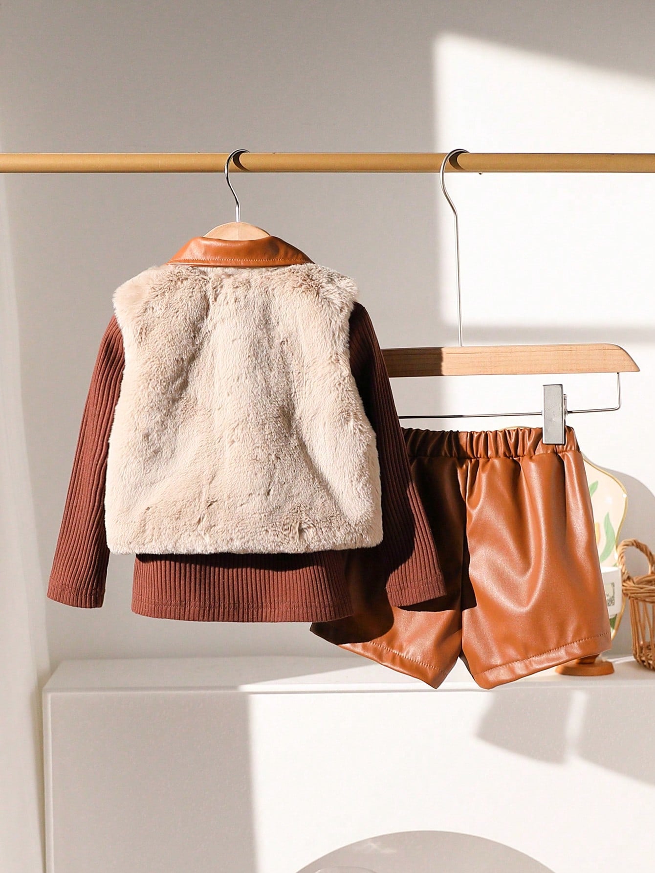 2pcs Baby Girl Casual Furry Patchwork Vest And Long Sleeve Top With Shorts Set, Autumn/Winter