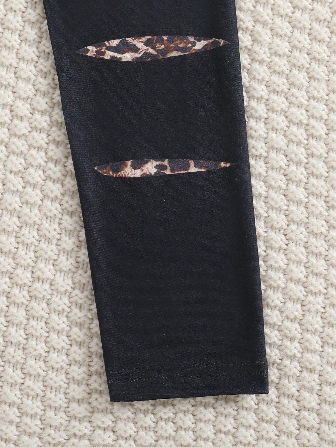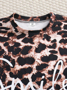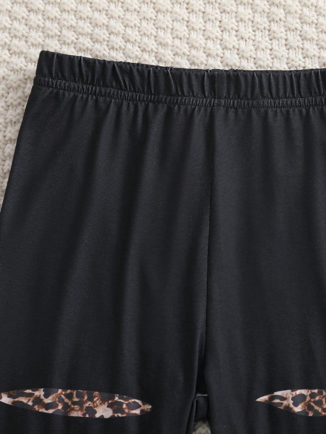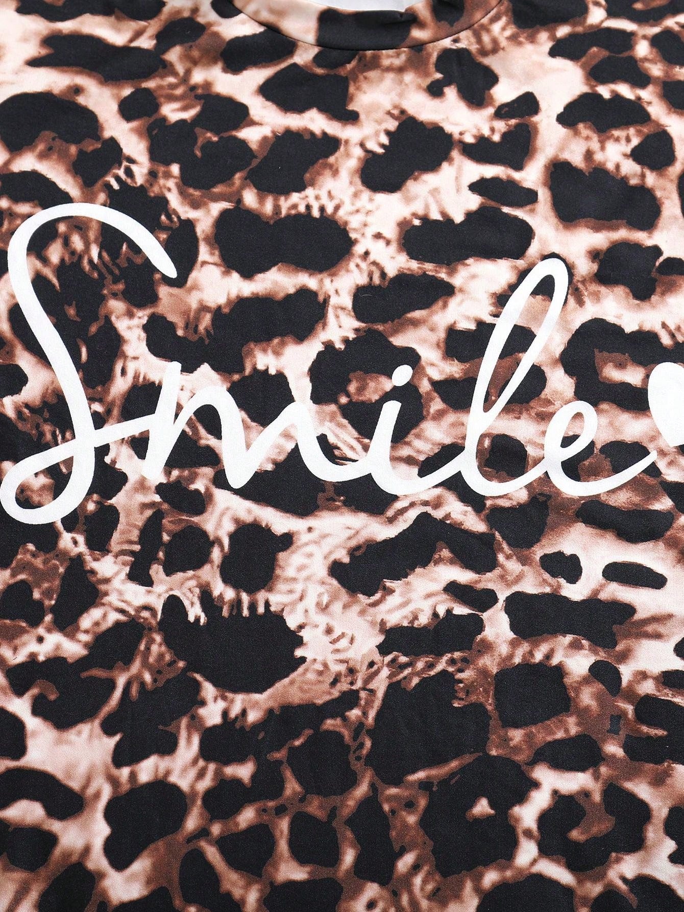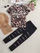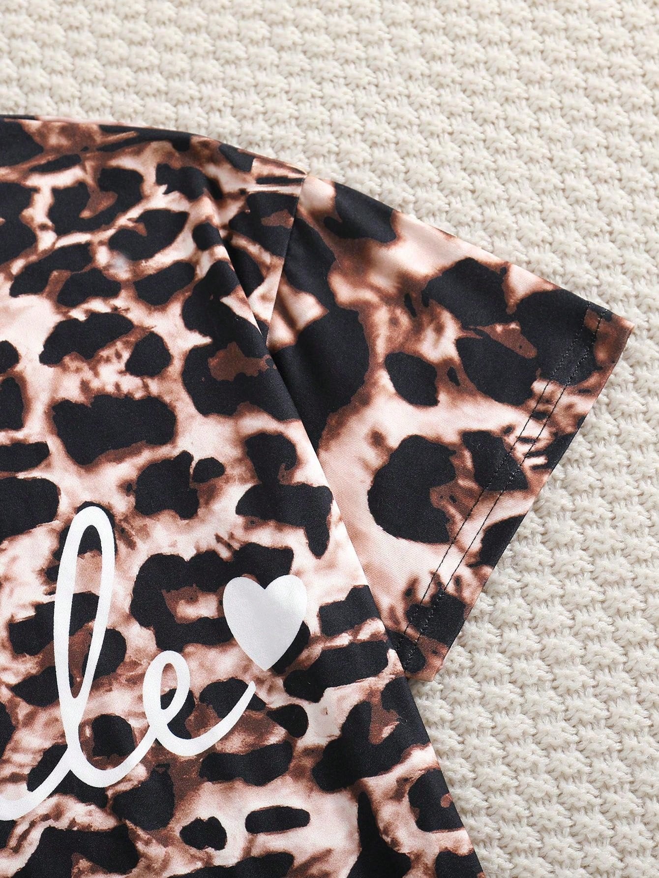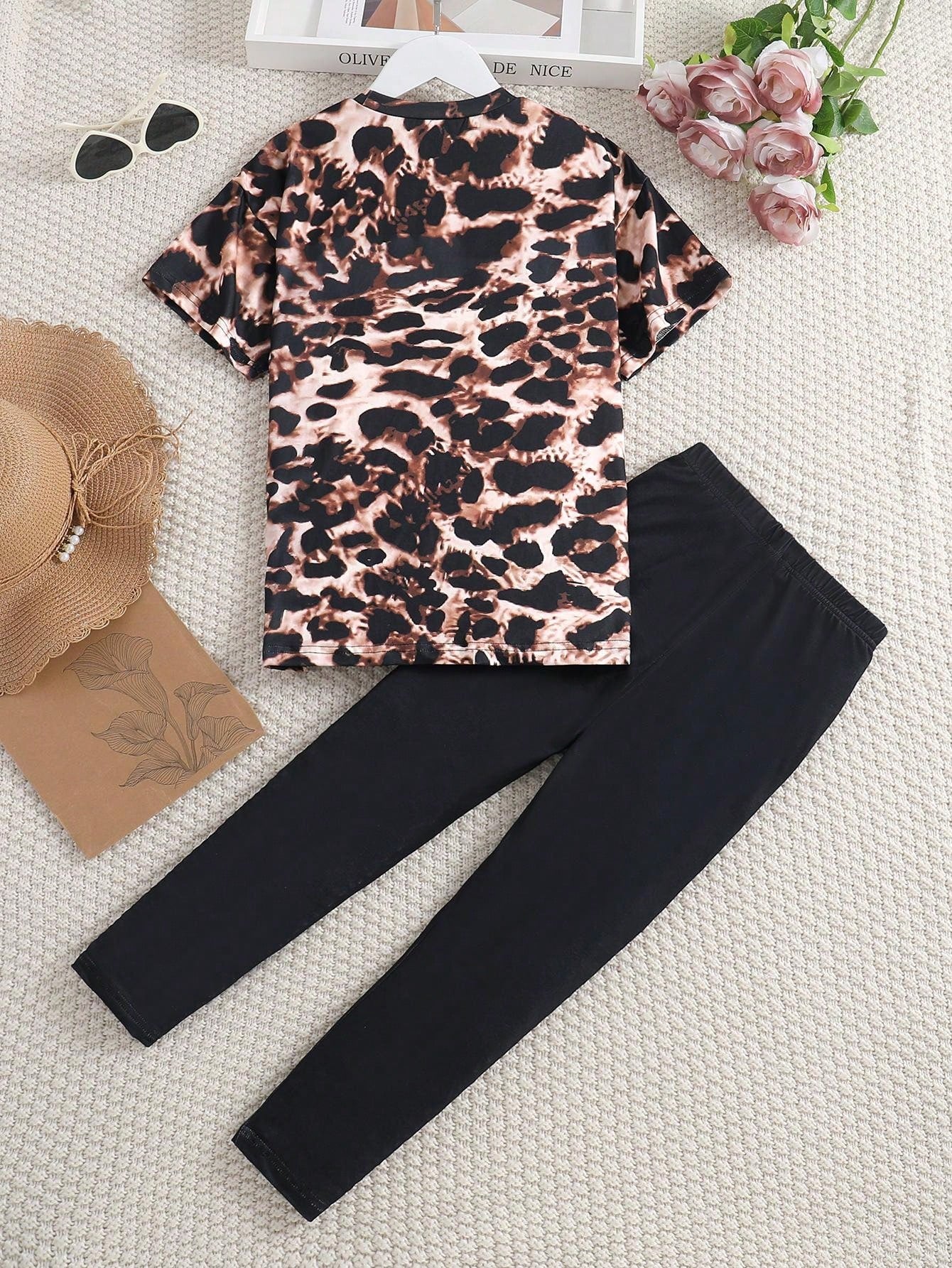 2pcs Tween Girl Fashionable Leopard Print Round Neck Short Sleeve T-Shirt And Letter Printed Knit Pants