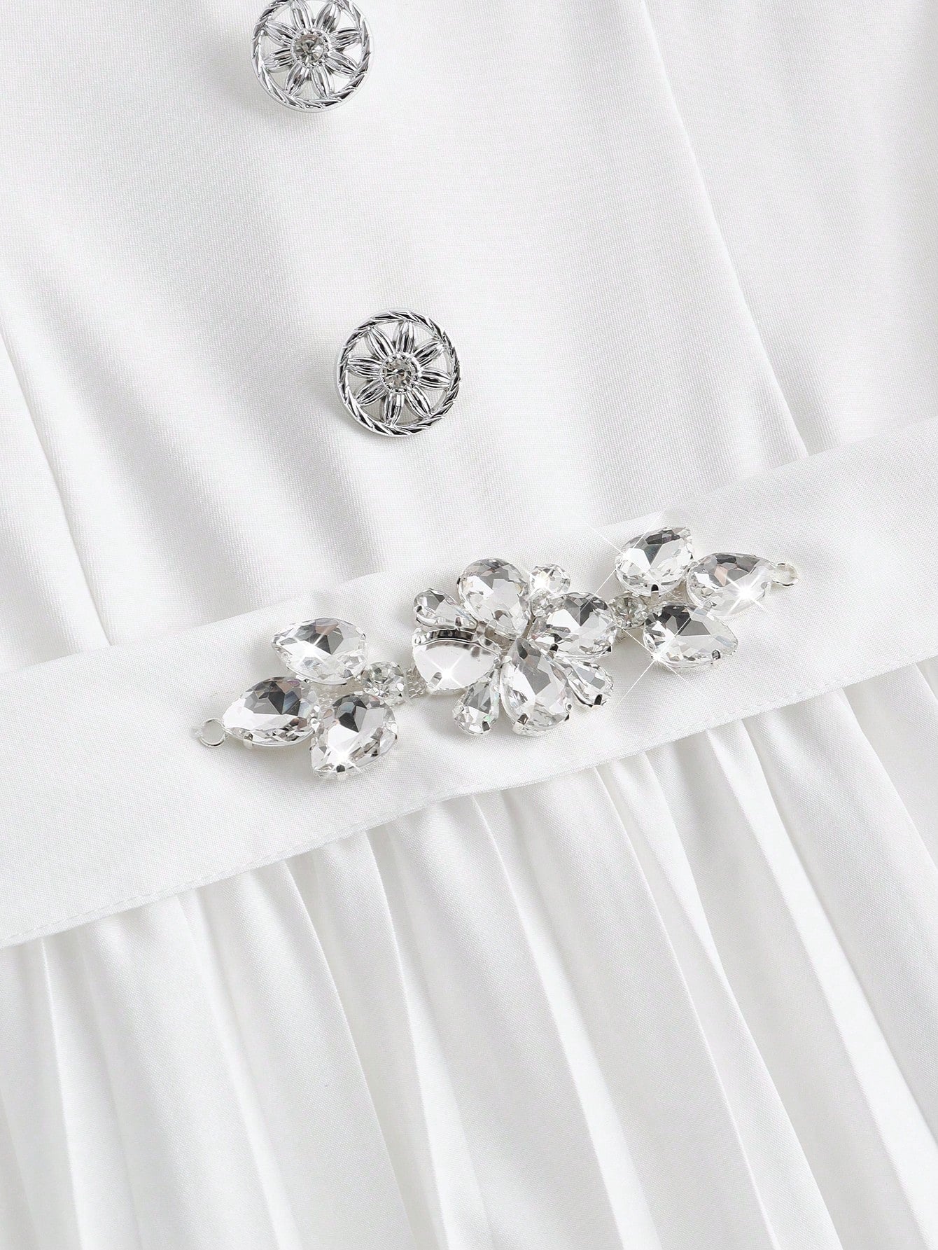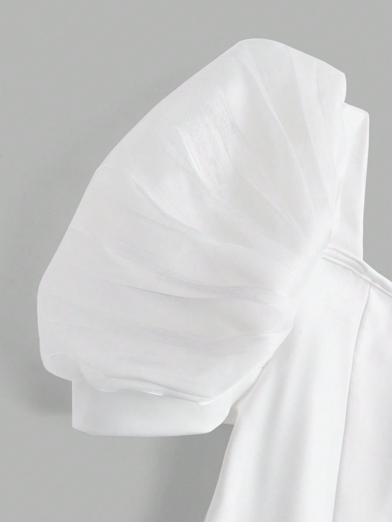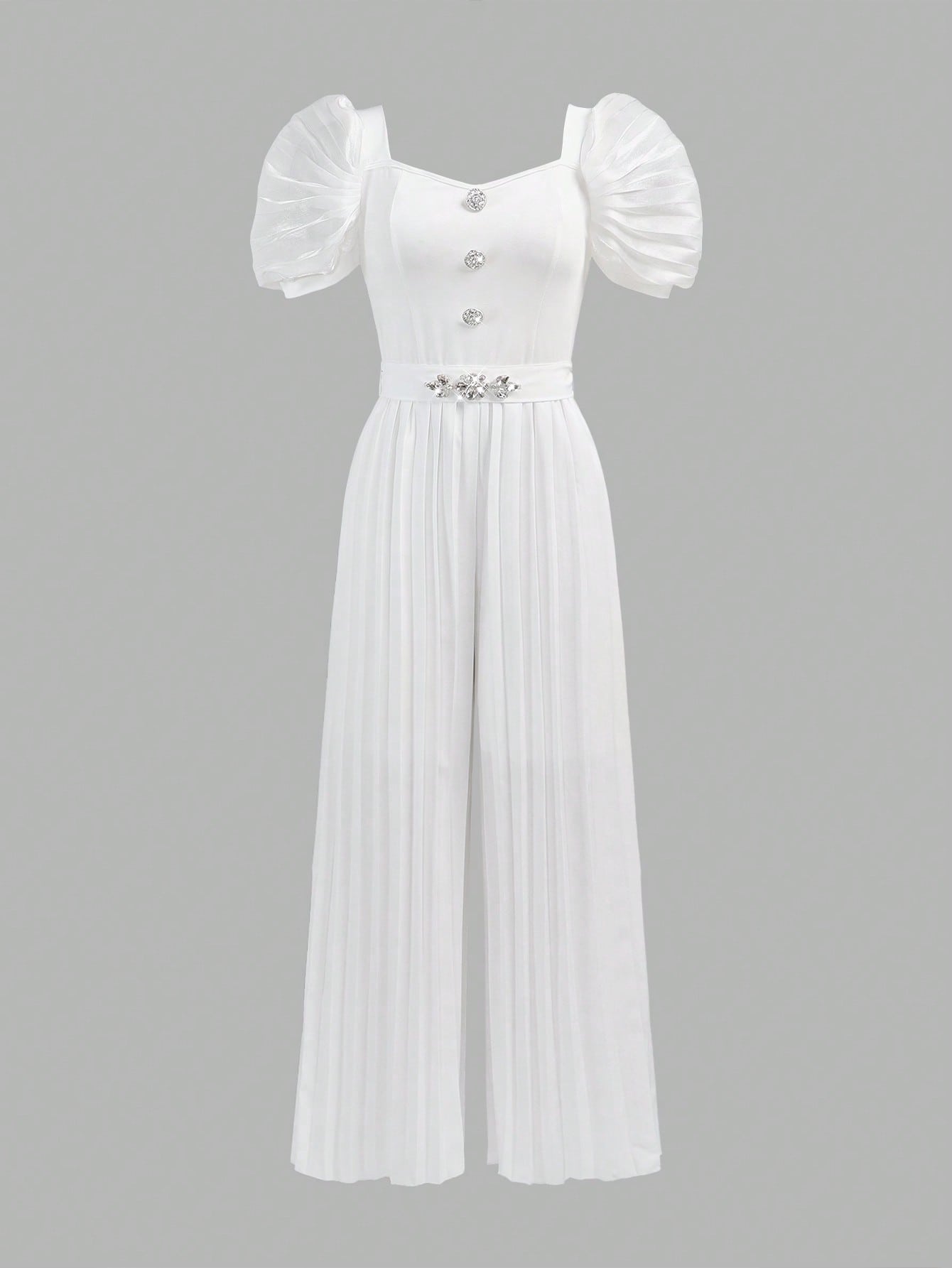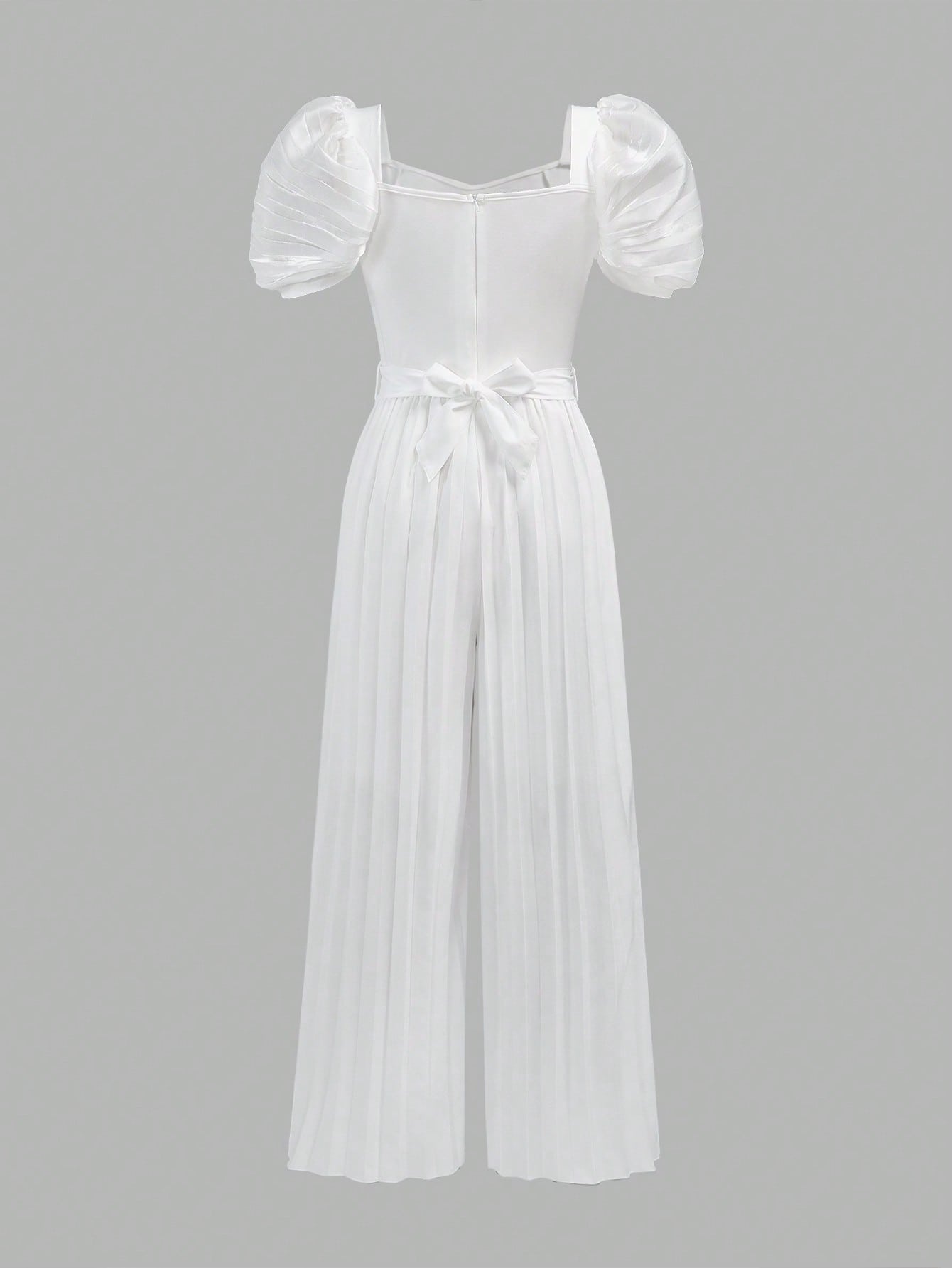 Teen Girl' White Puff Sleeve Jumpsuit, Elegant Luxurious Style Suitable For Banquets, Parties