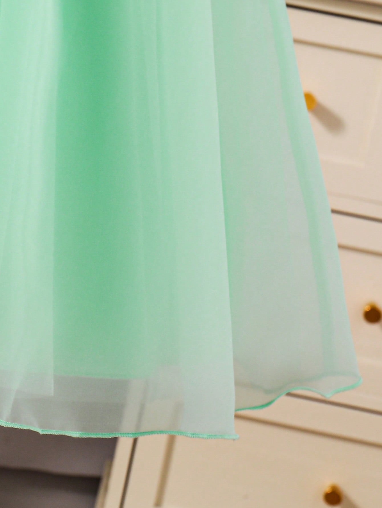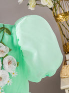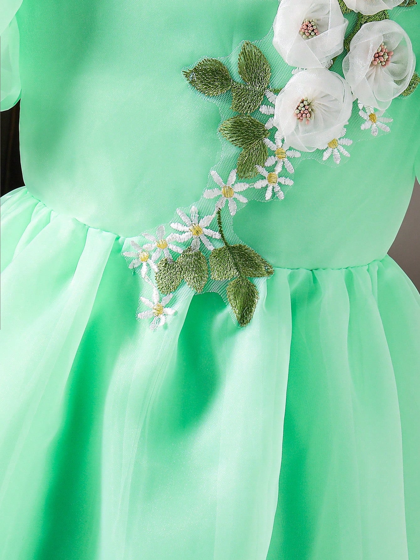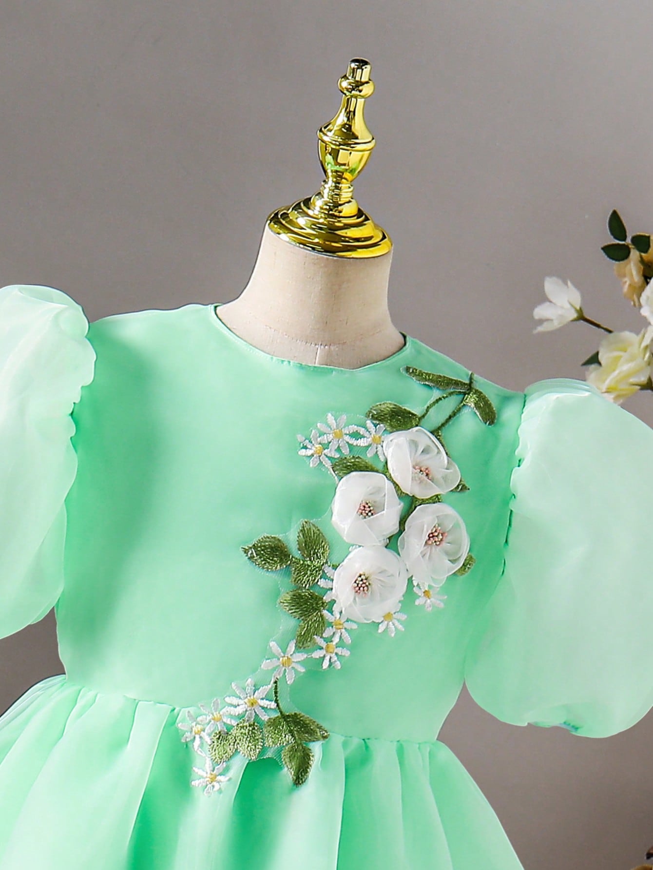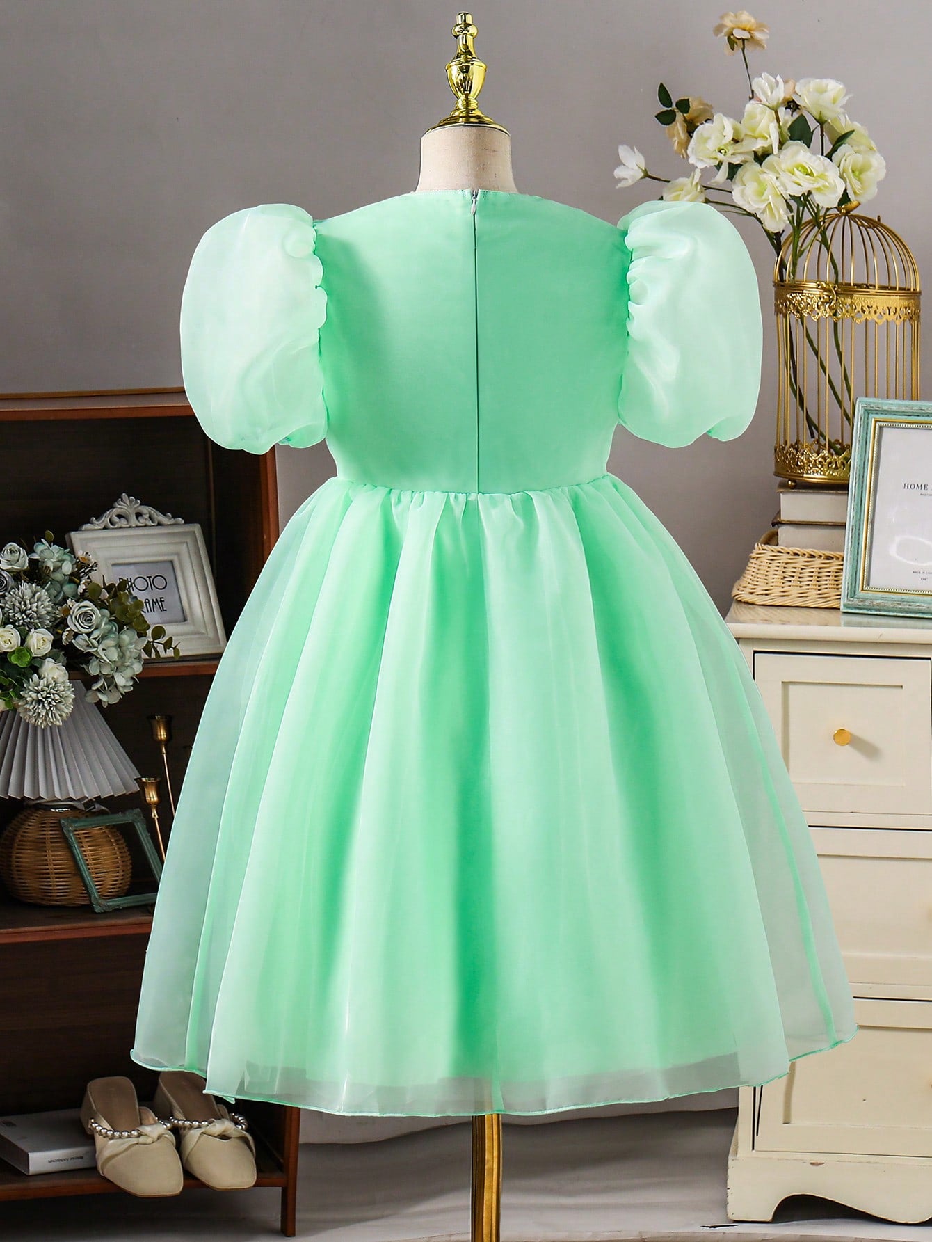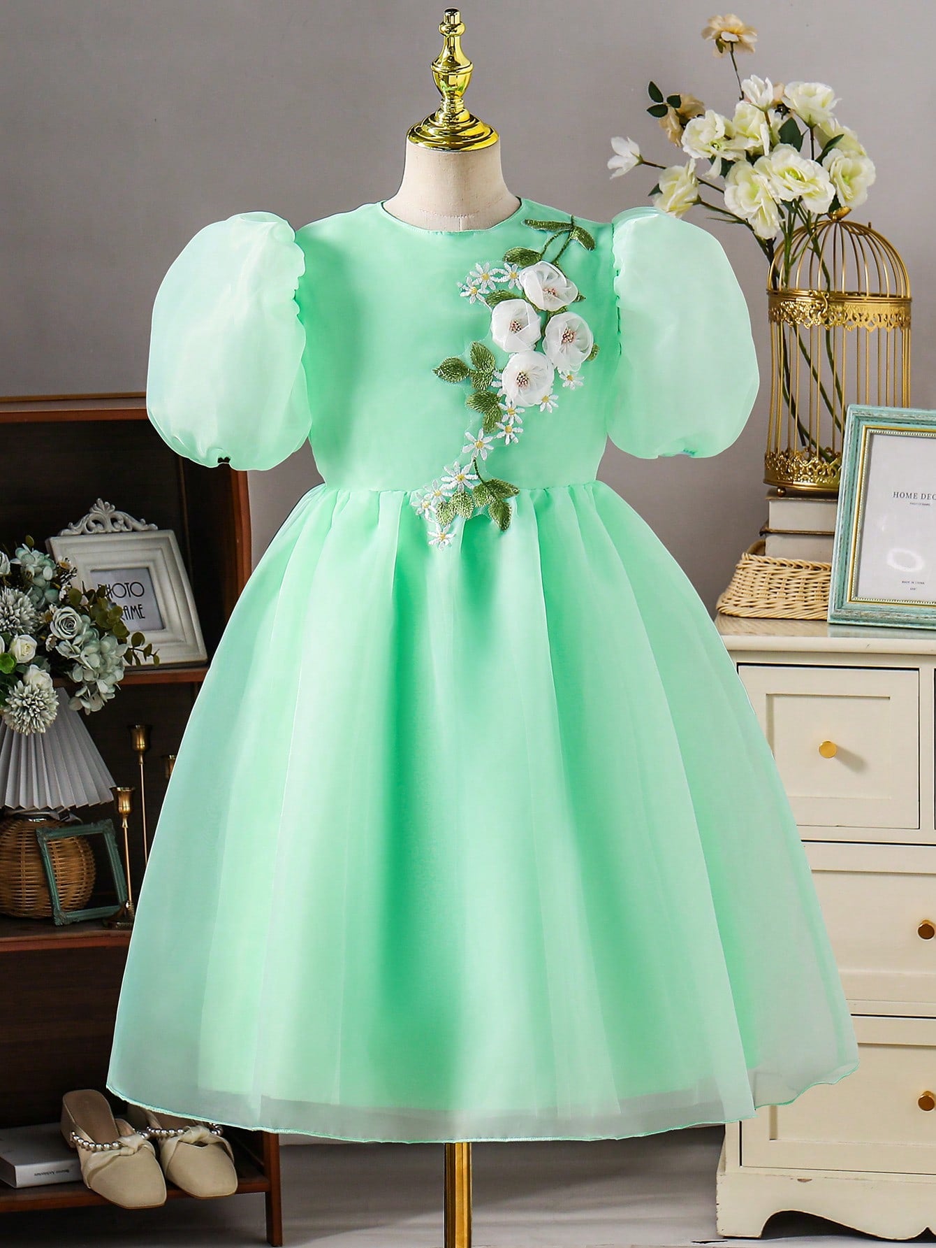 Tween Girl Elegant Casual Versatile Puff Sleeve Midi Dress, Organza Floral Hem Decor, Suitable For Outings,
