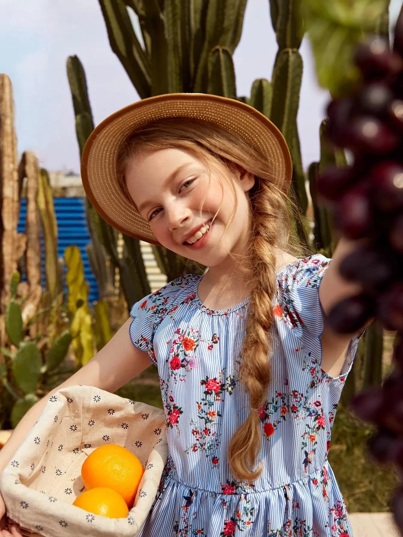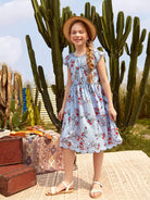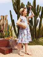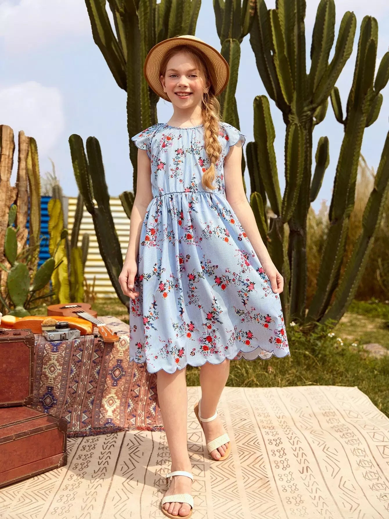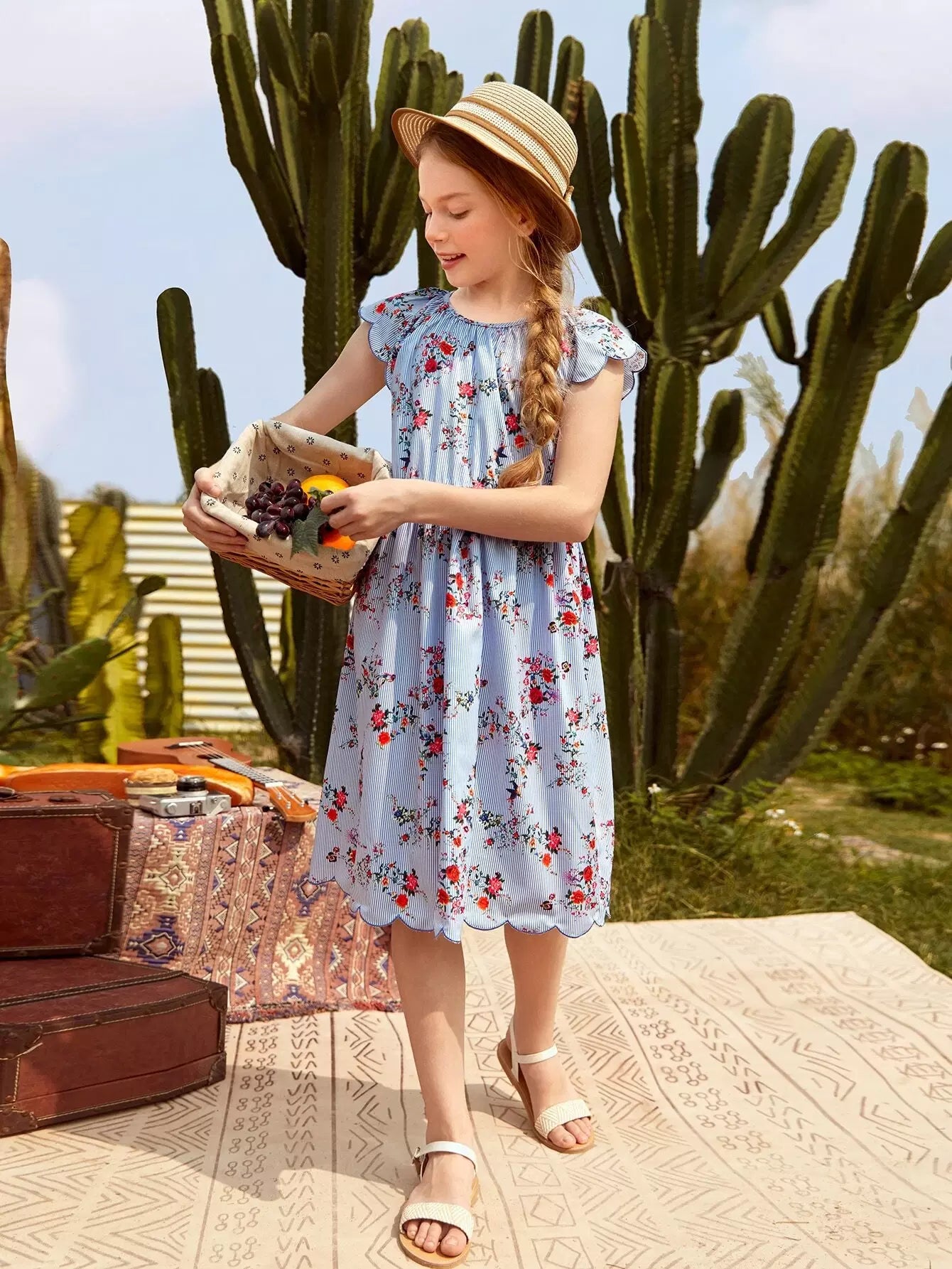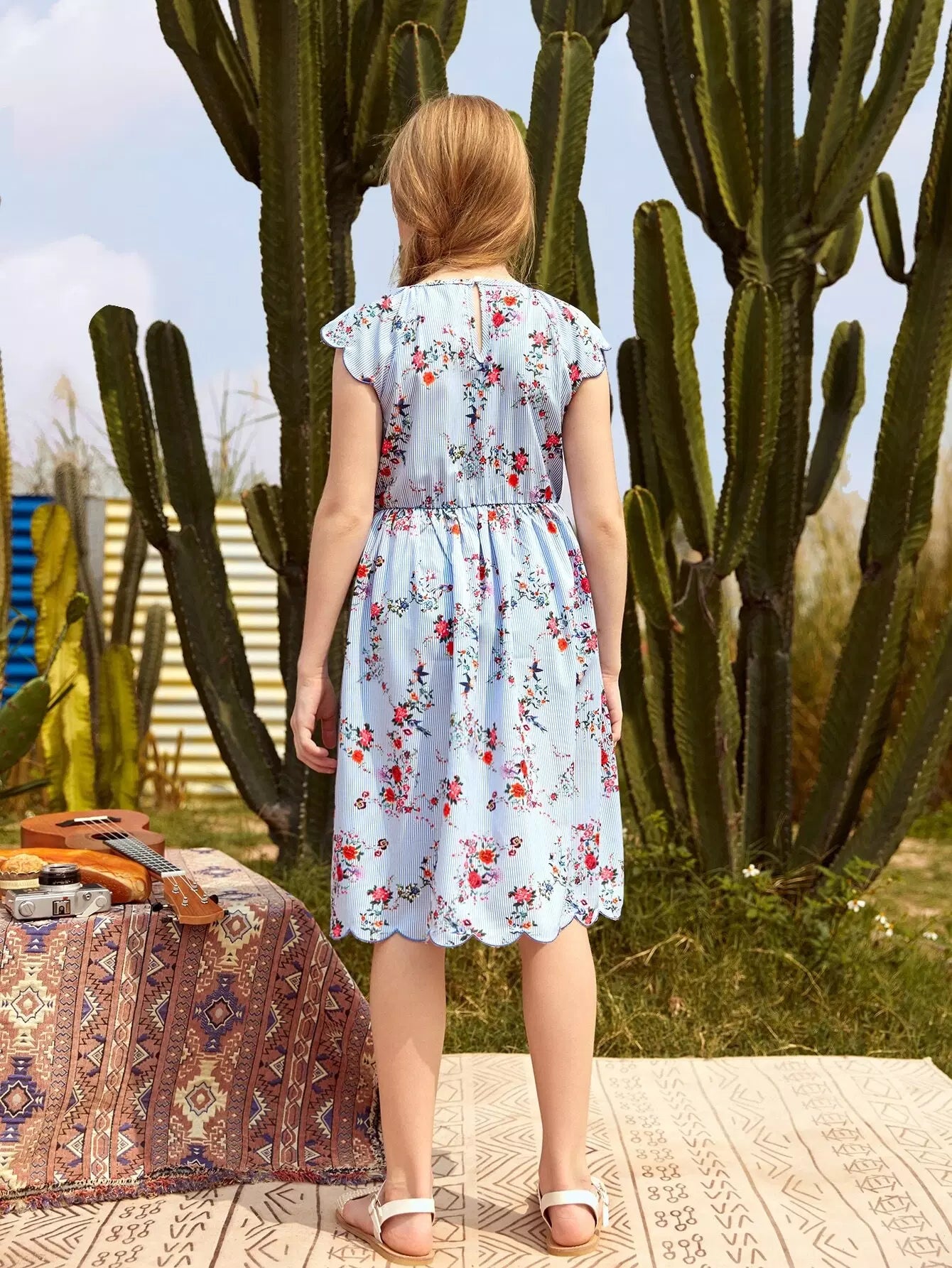 Girls Scallop Trim Floral and Striped Dress