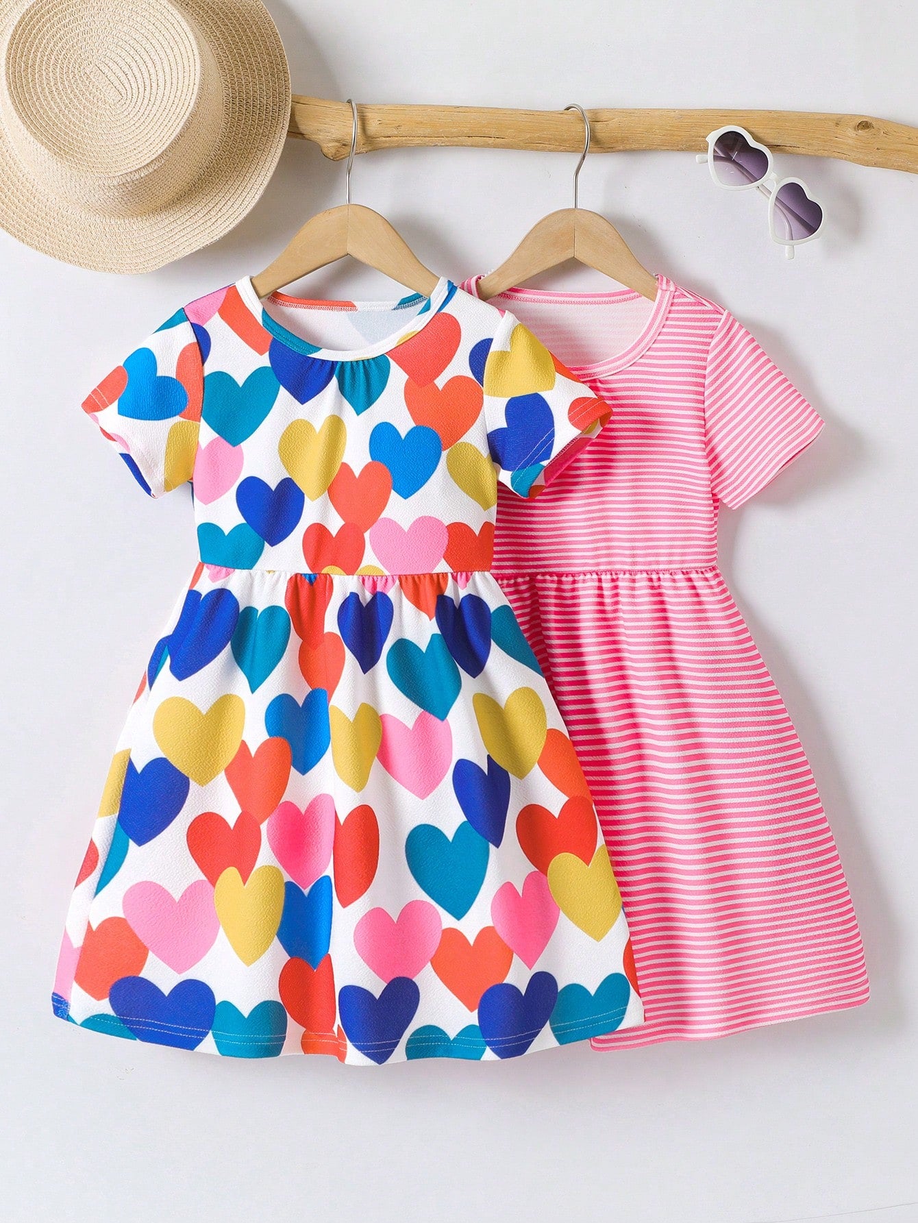 Young Girls Colorful Heart Print & Striped 2 Pieces Short Sleeve Dress, Multi-Piece Set Provides Options,