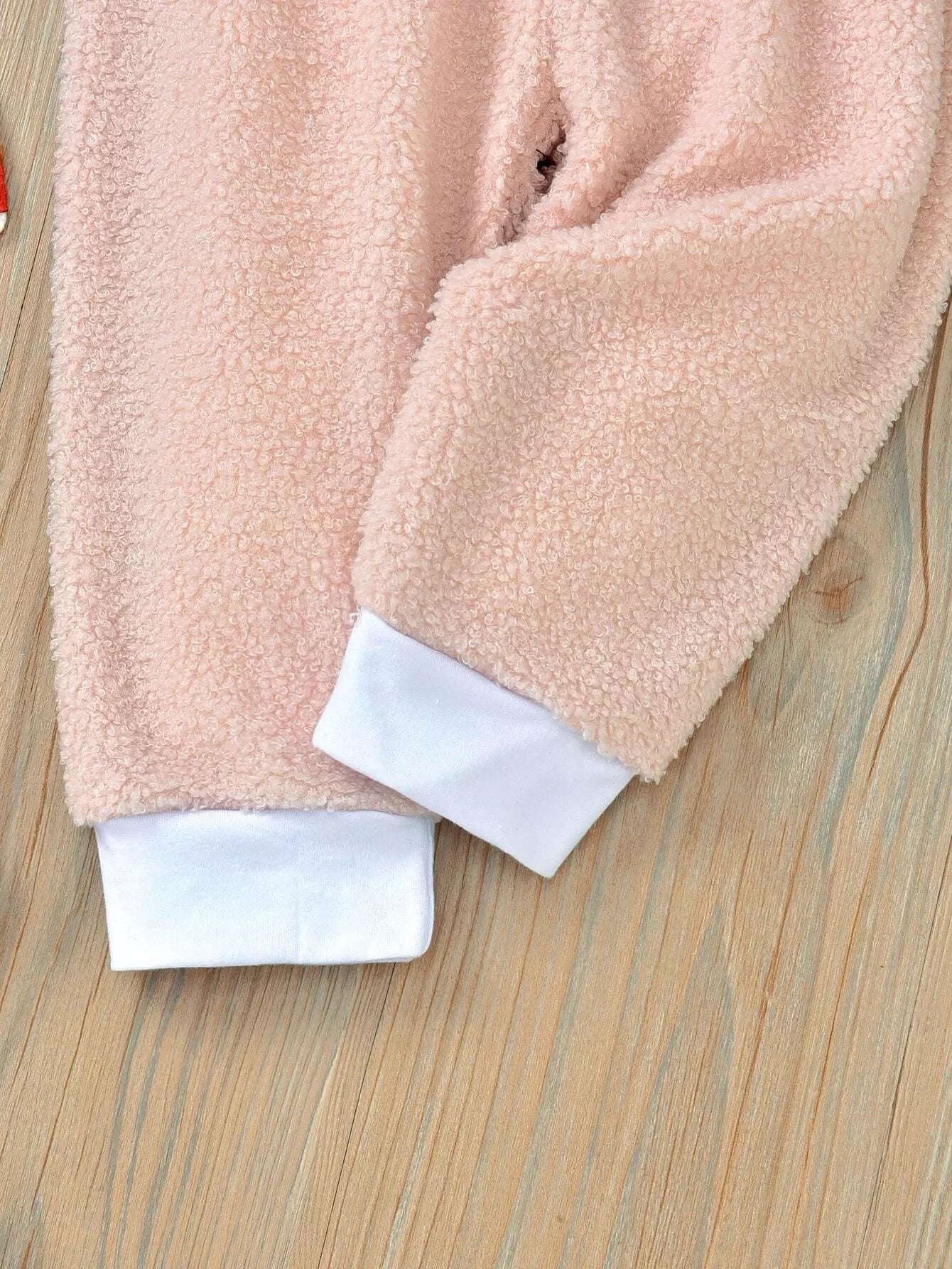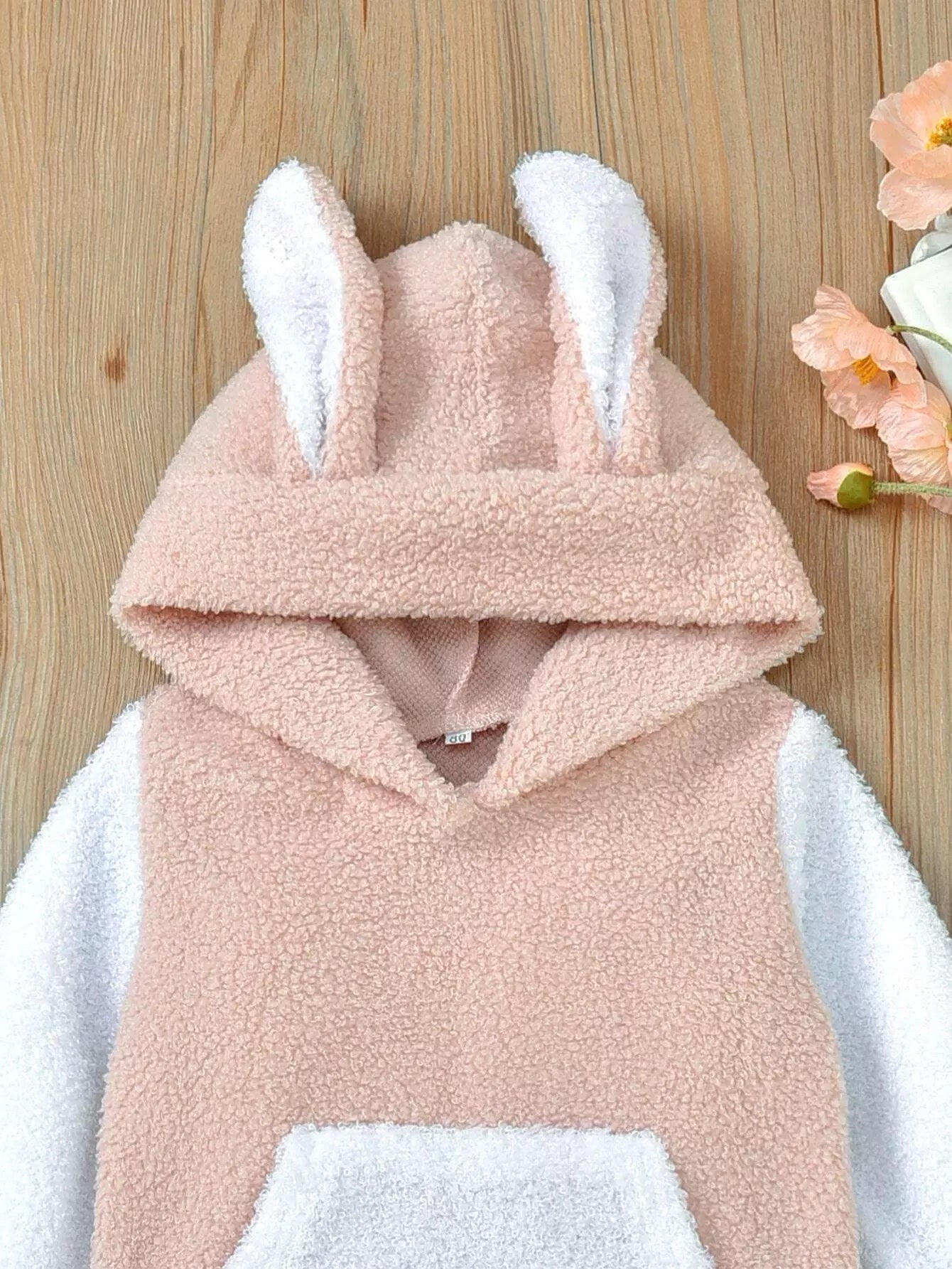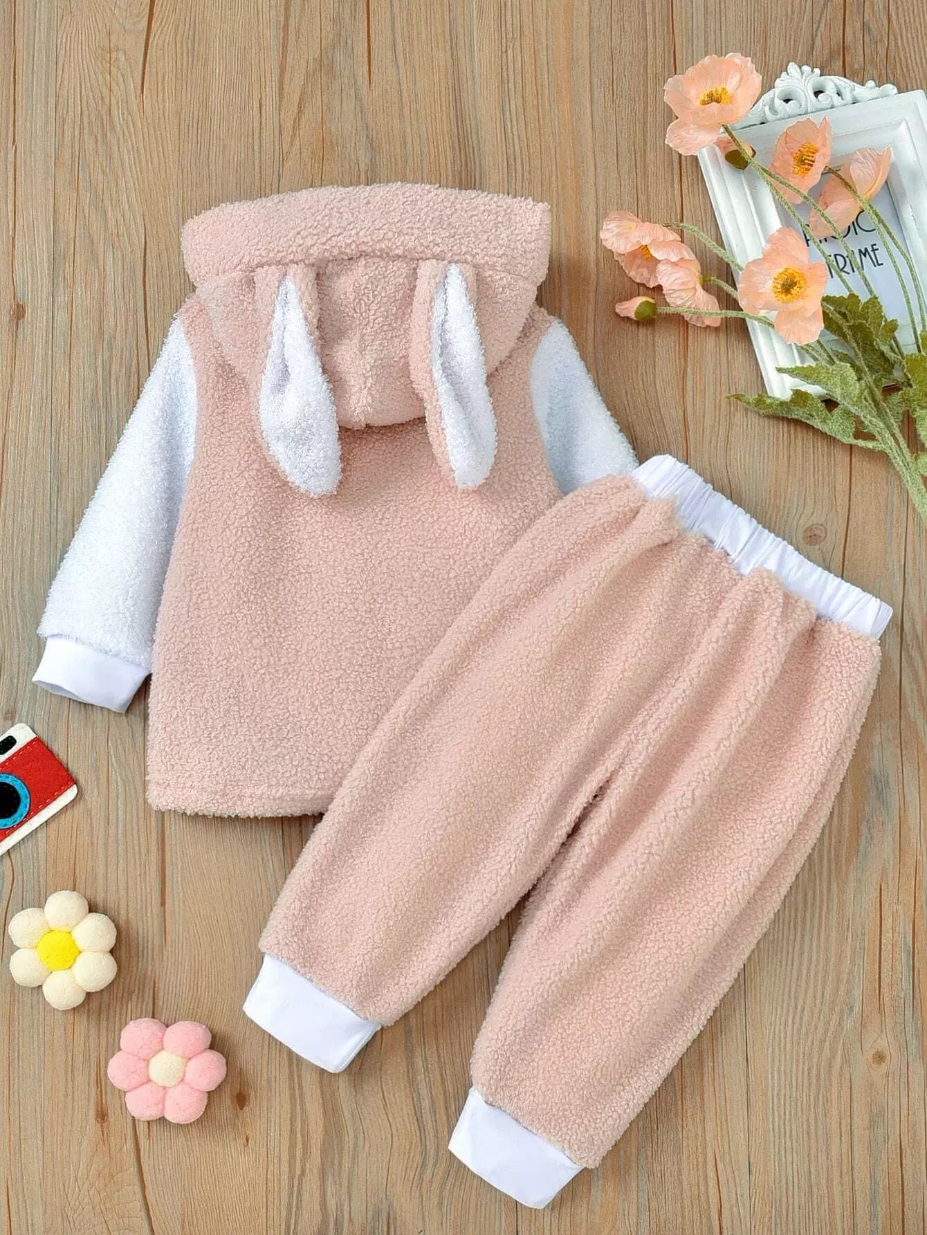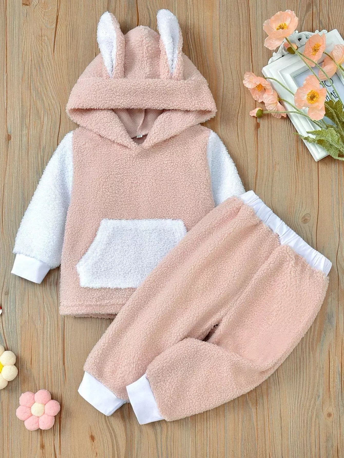 Baby Color Block Kangaroo Pocket 3D Ear Design Flannel Hoodie & Pants