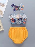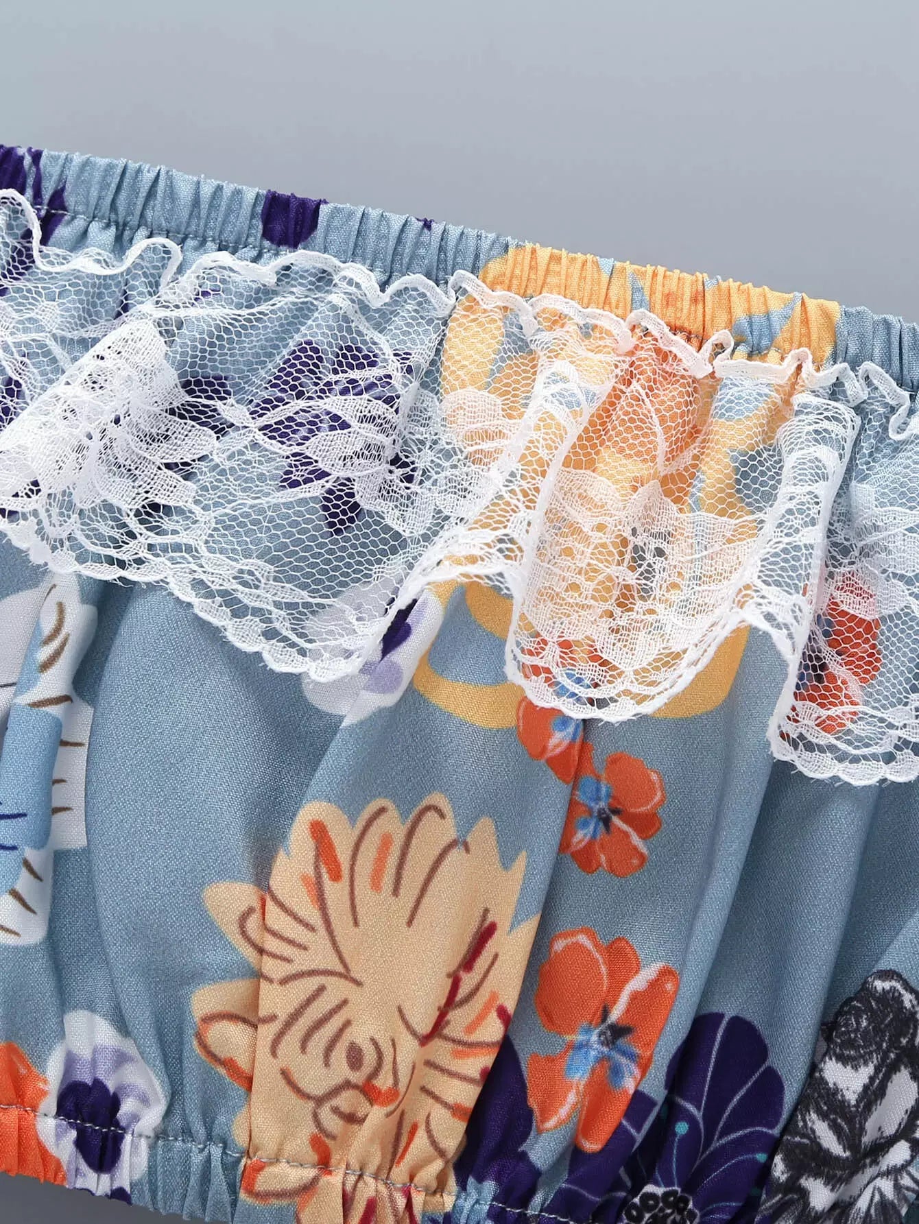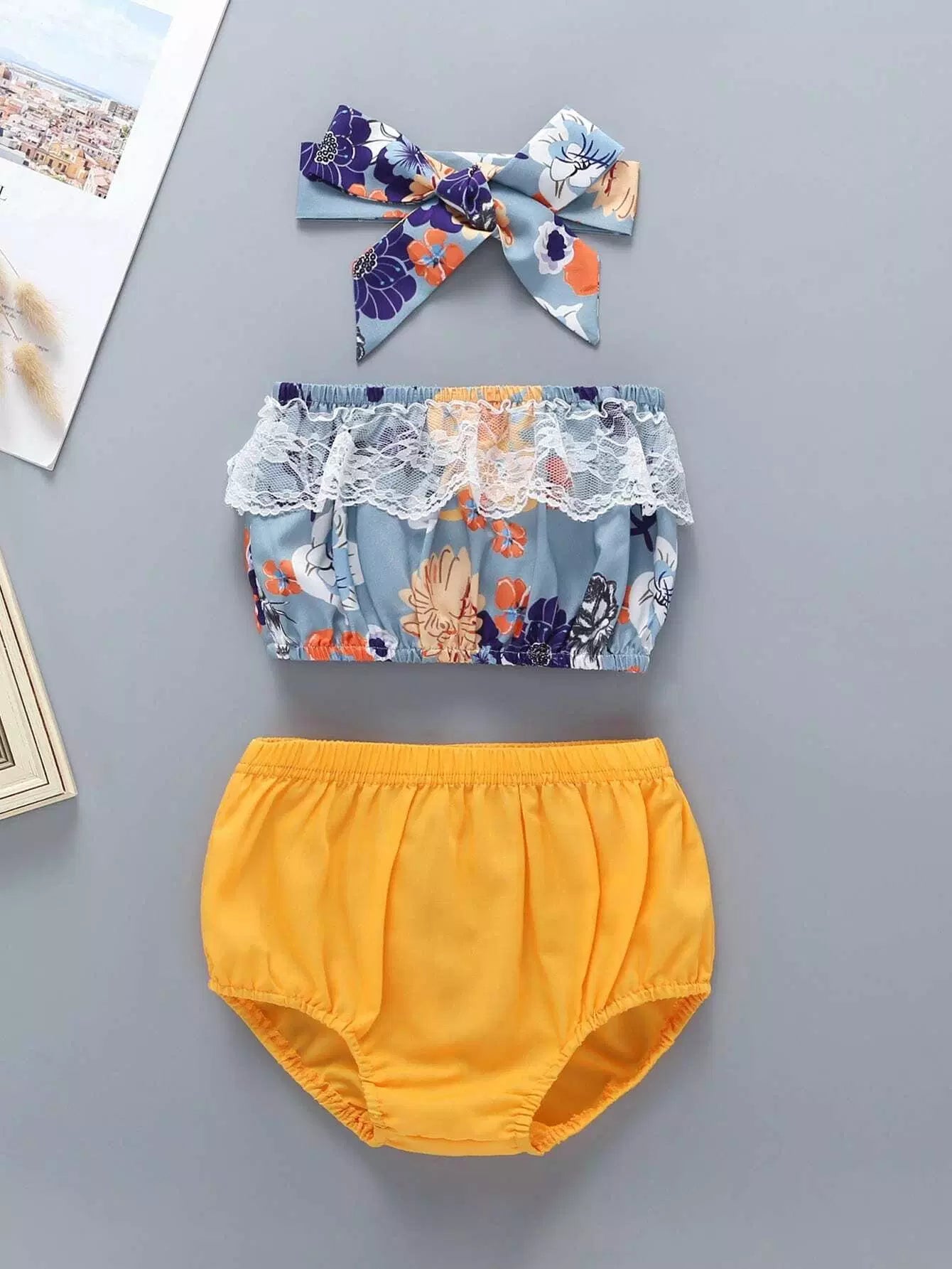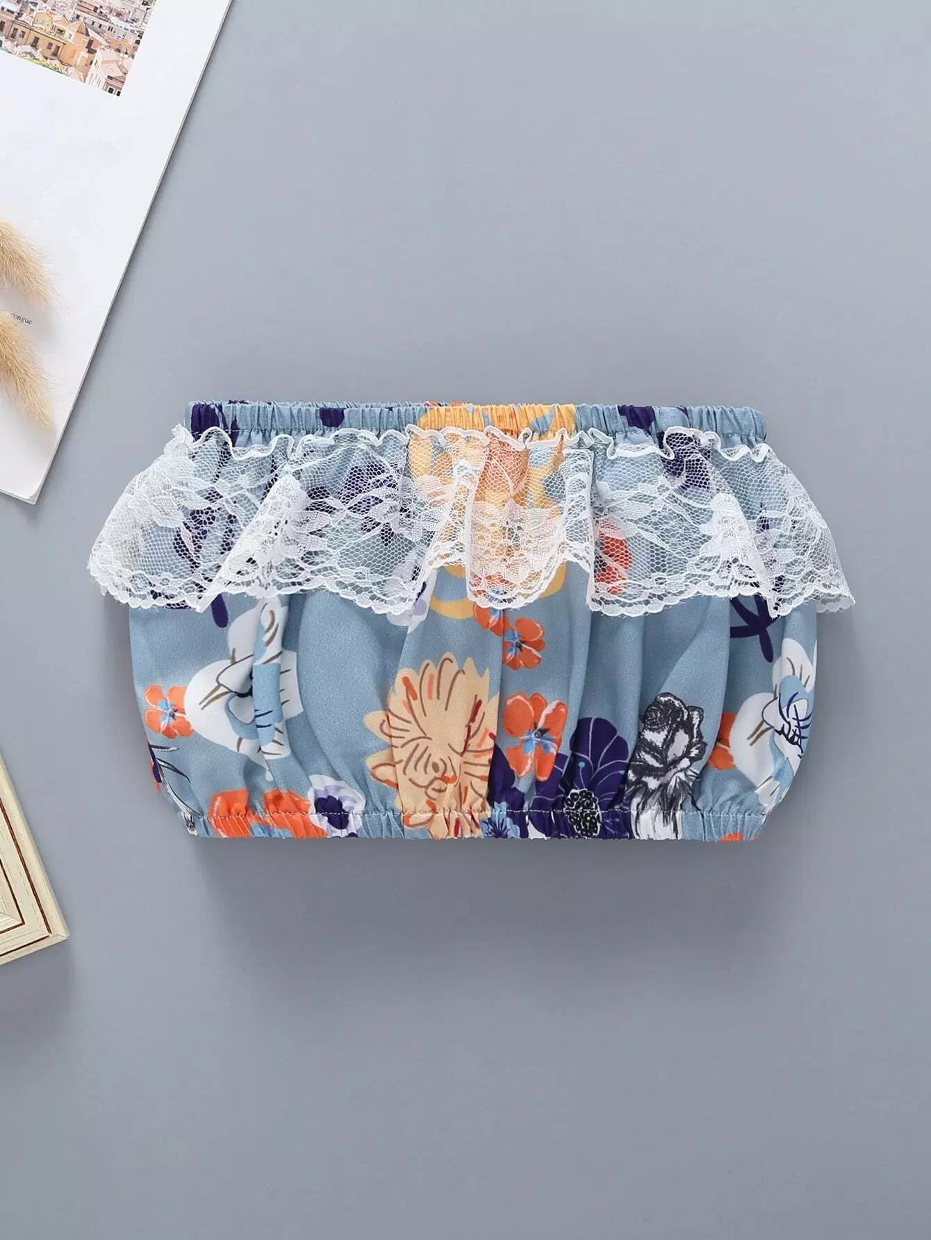 Baby Floral Print Lace Panel Bandeau & Shorts & Headband